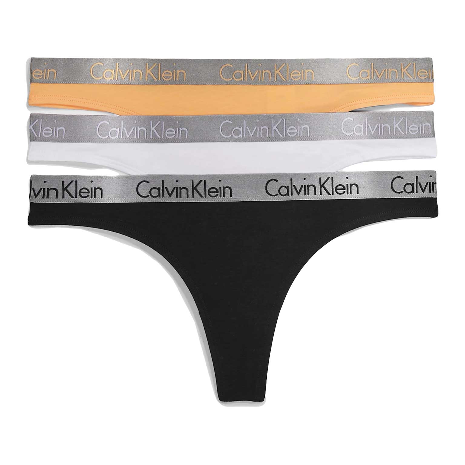 Three solid color women's thongs with a contrasting waistband from Calvin Klein in a value pack, made from soft stretch cotton that feels great on the skin. The waistband features the Calvin Klein logo. The multipacks are available in two color combinations.