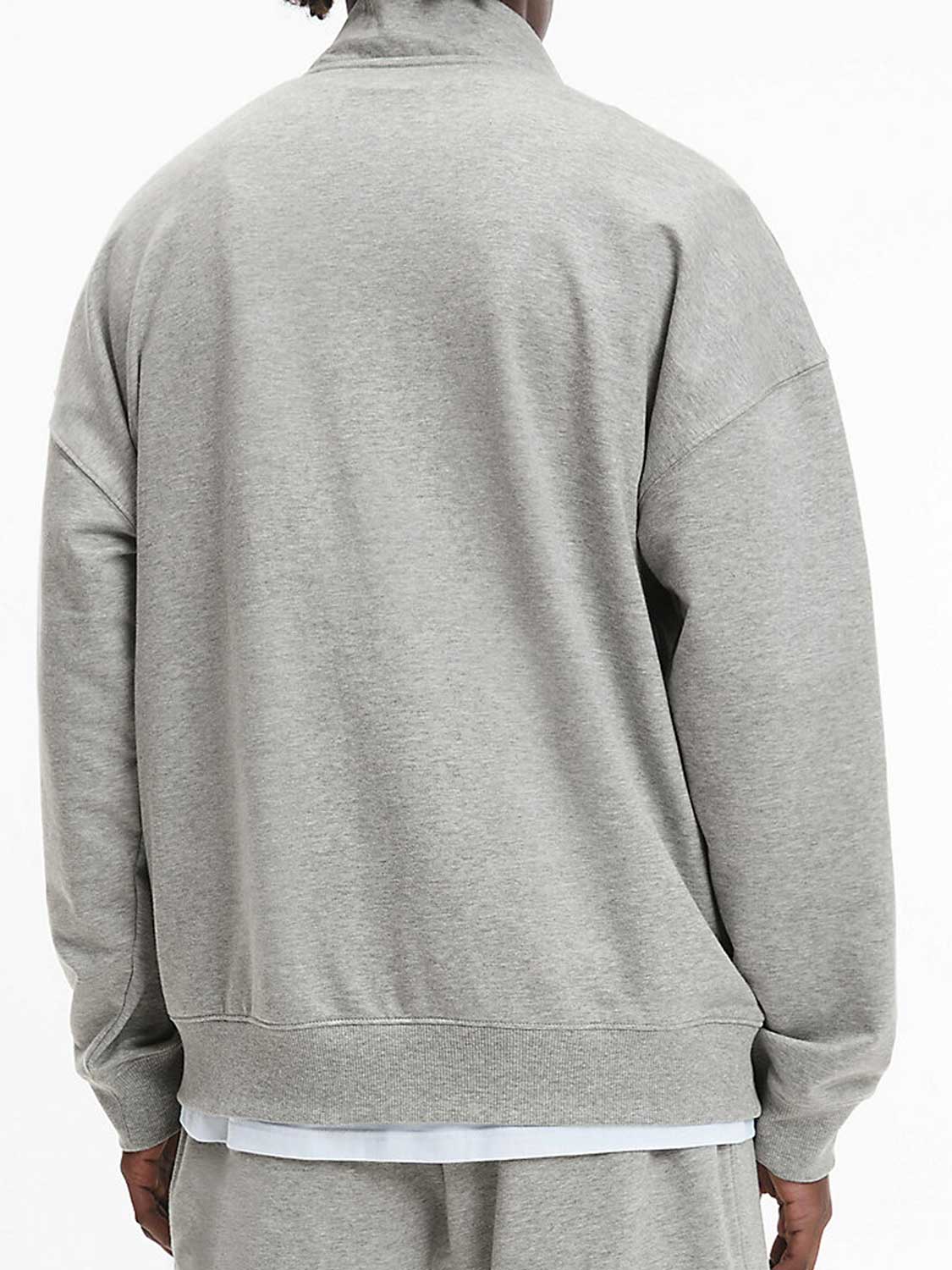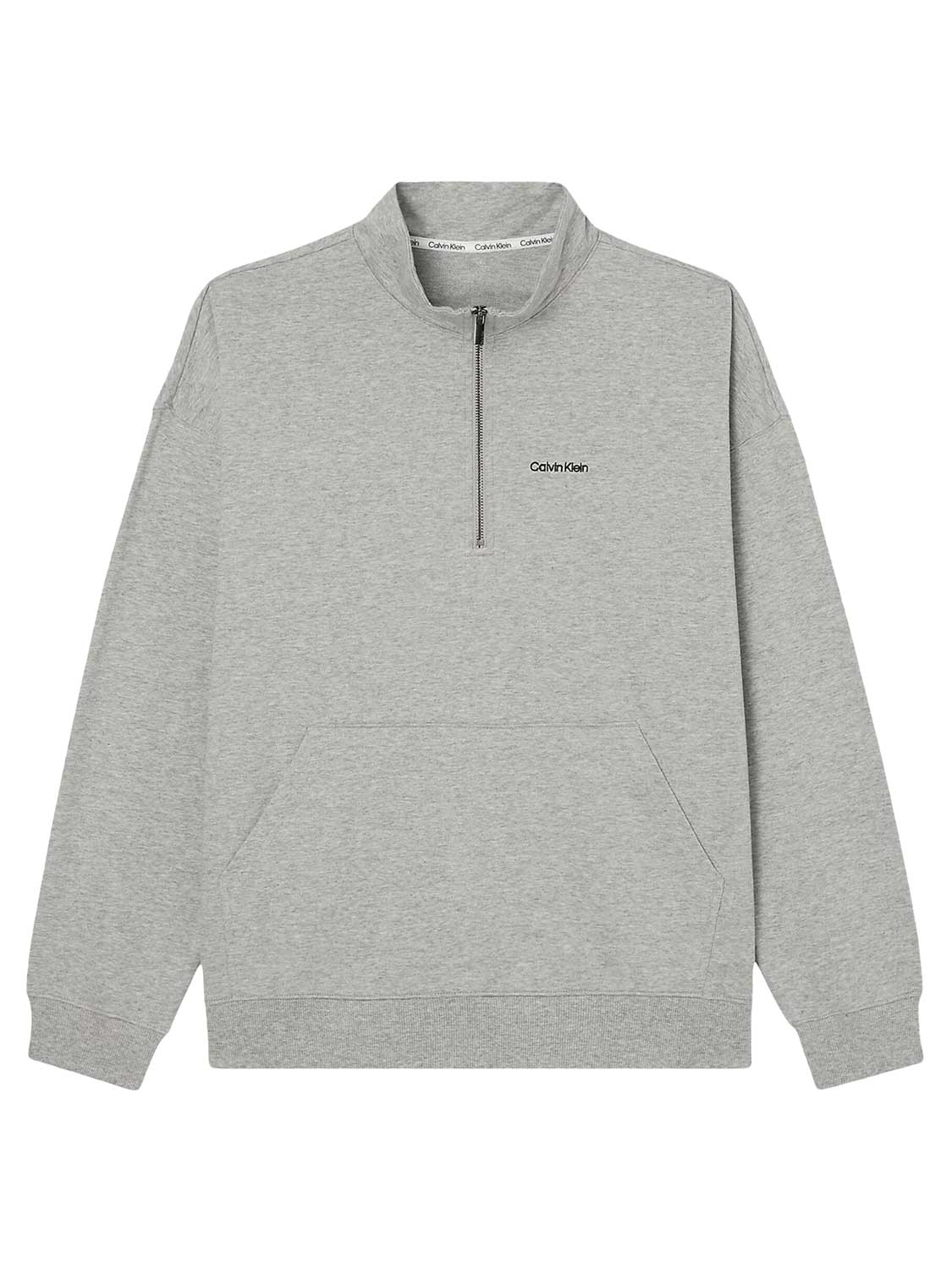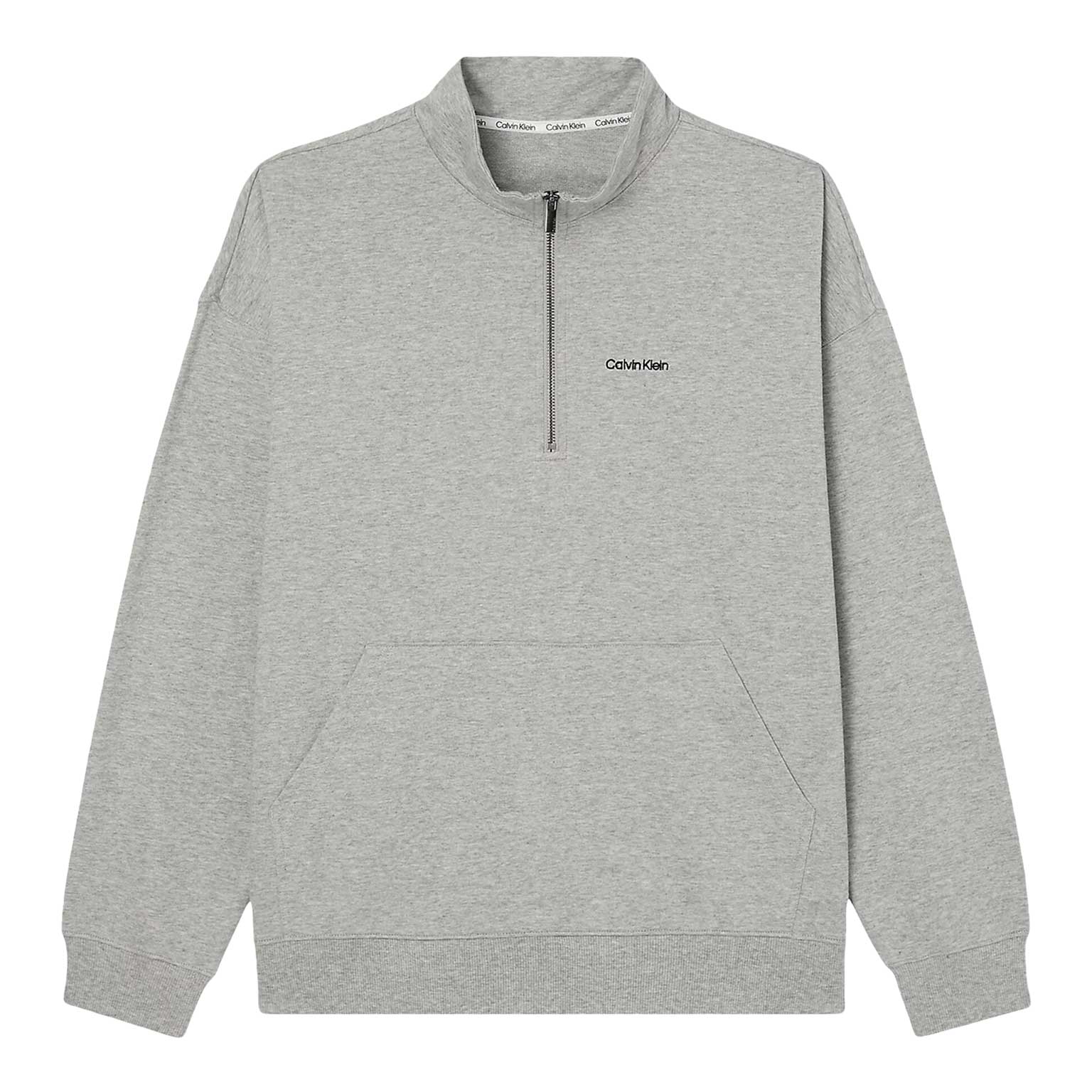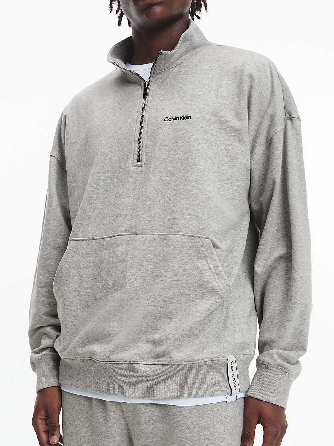A Lounge sweater from the Modern Cotton Lounge collection, perfect for relaxing. This lounge sweater has a nice loose fit and dropped shoulders, allowing it to drape casually on your body. The zipper allows you to wear the collar open or closed, depending on how warm you are. The fabric is made from a polyester/cotton mix, making it soft against the skin. On the front of the sweater, you'll find a pouch where you can comfortably place your hands. The neckline features Calvin Klein tape and the Calvin Klein logo is on the left chest.