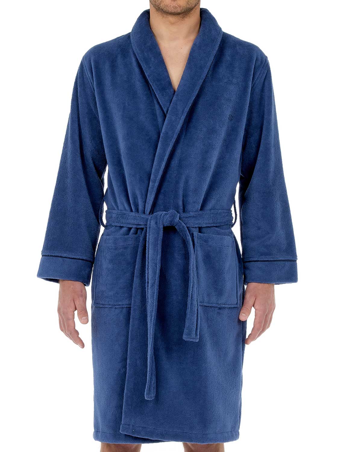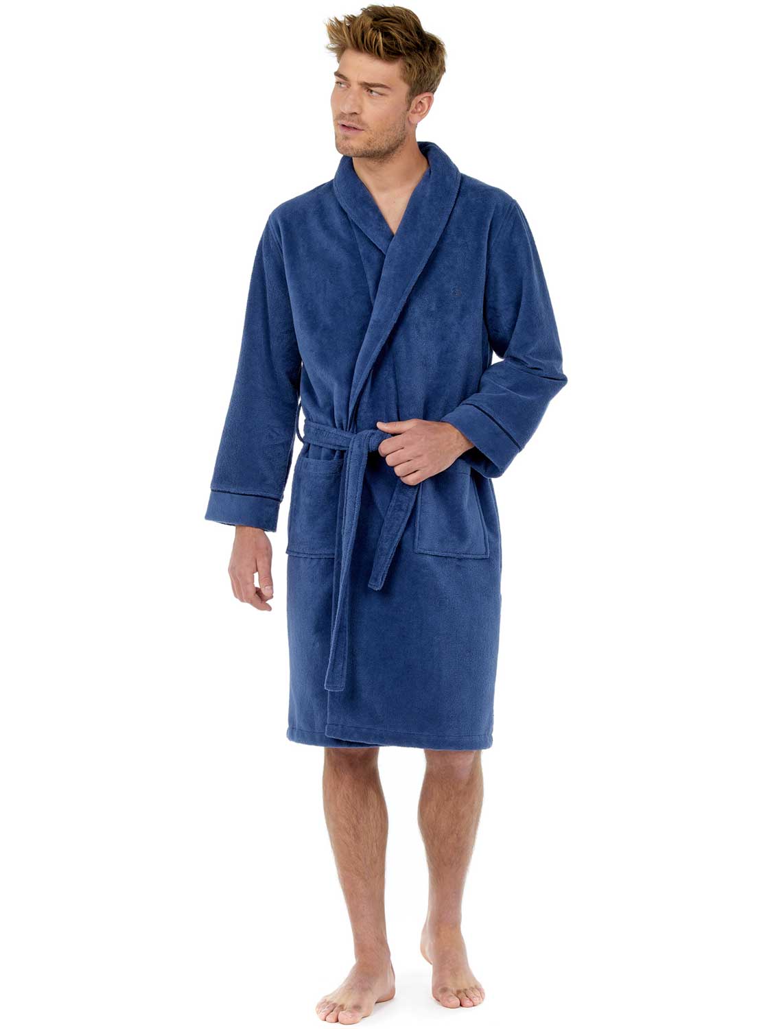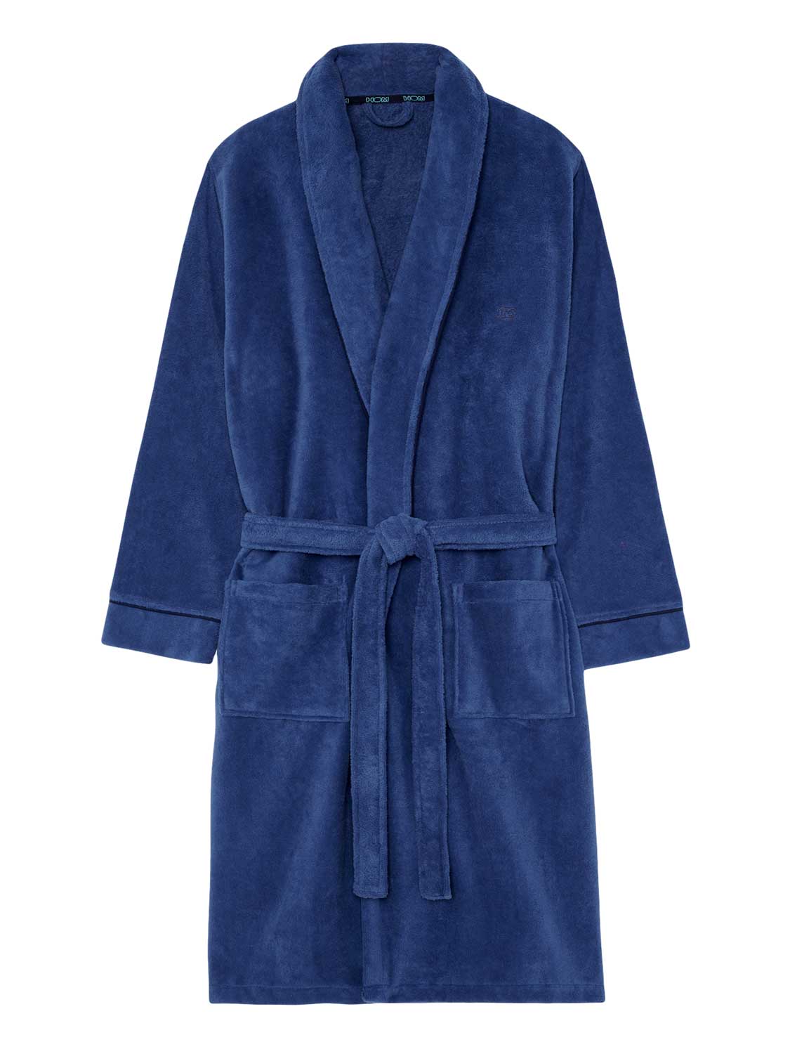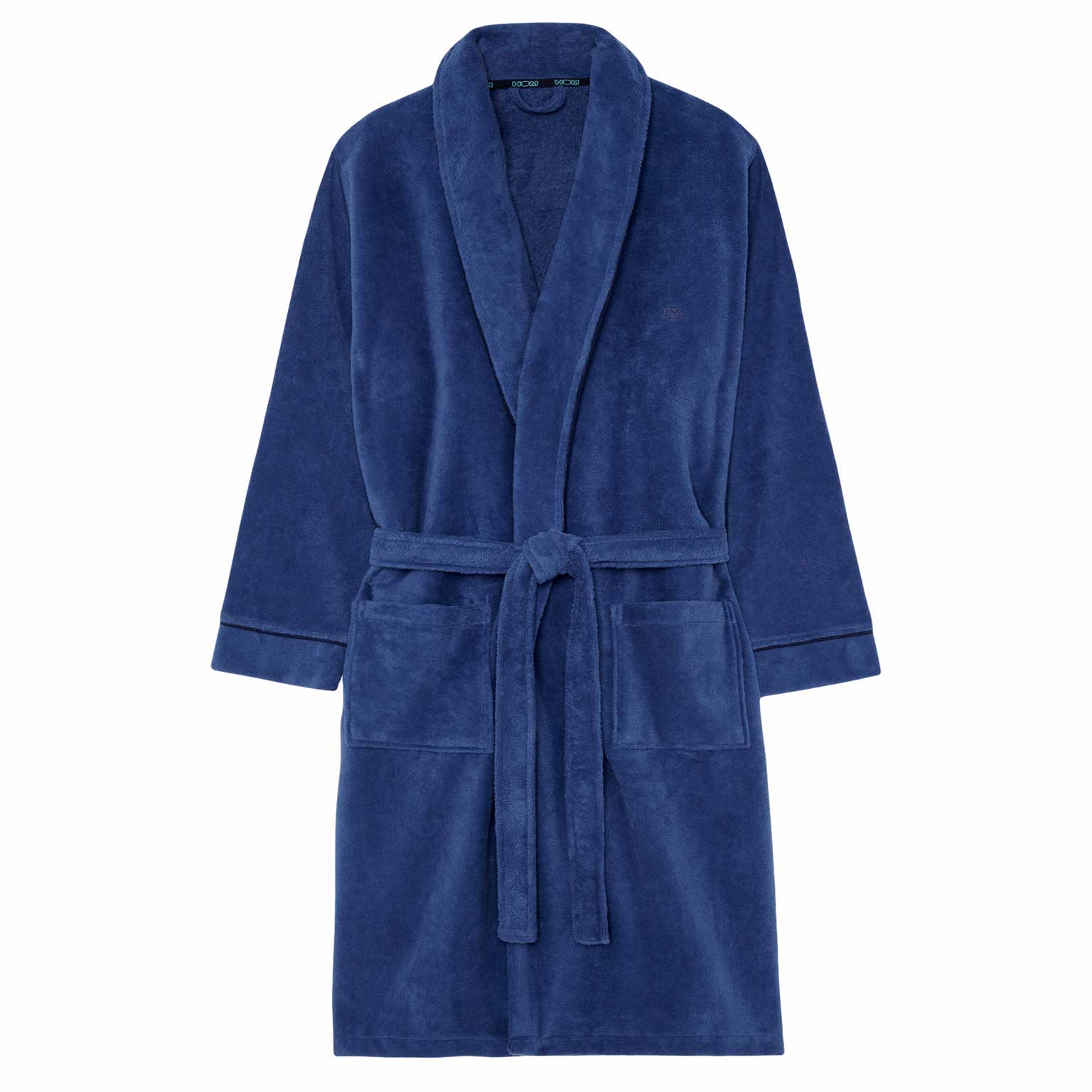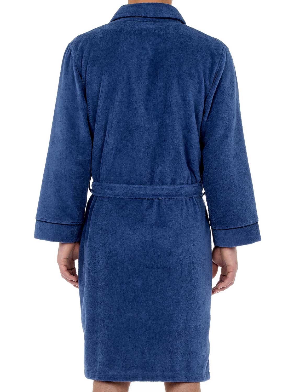 The Yvan - bathrobe is a long robe for men in denim blue, finished with navy blue contrast lines. The bathrobe feels thick and soft and is made of 90% cotton and 10% polyester. The material of this velvet terry bathrobe feels soft and is slightly glossy. You can close the bathrobe with the inner cord or the matching belt. Cotton is comfortable, easy to clean, and has excellent absorbent and temperature-regulating properties. Ideal for when you just step out of the shower or for use in the sauna.