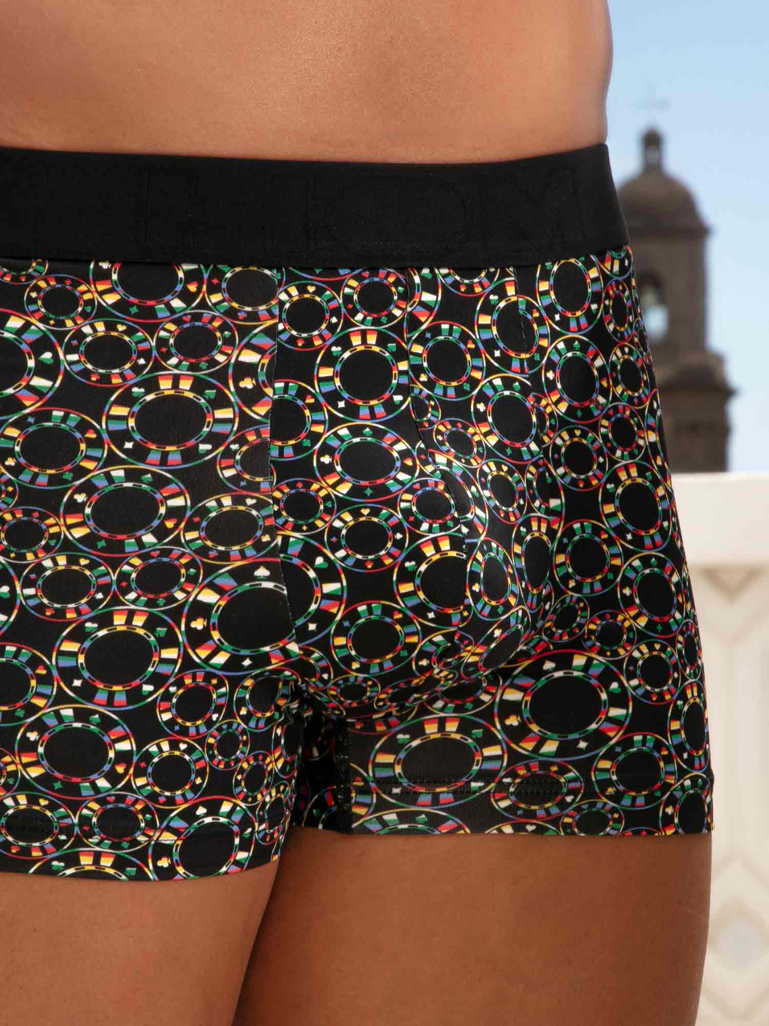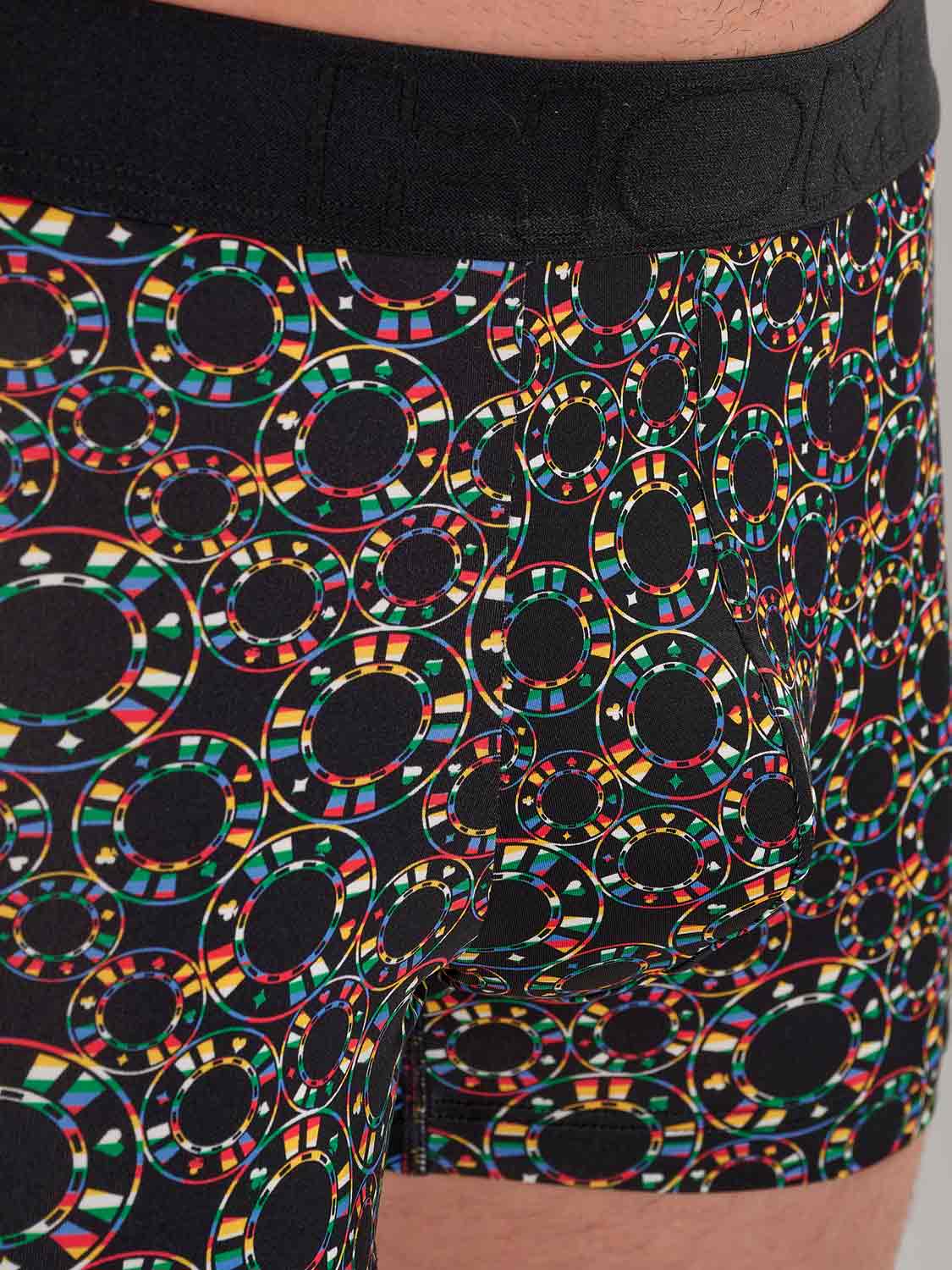 The Red Rock Boxer Briefs dive into the hushed, electrifying world of casinos. The bold chip print pops against deep black, mixing vivid reds and greens with crisp white and subtle golden accents for a confident, graphic look. Made from soft, stretchy microfibre, these boxer briefs hug the body with a light second skin feel. The seamless comfort waistband keeps everything in place without pinching, while the inside front elastic adds discreet targeted support. A refined leg finish helps prevent riding up, even when sitting, and the detachable care label keeps the fit irritation free all day.
