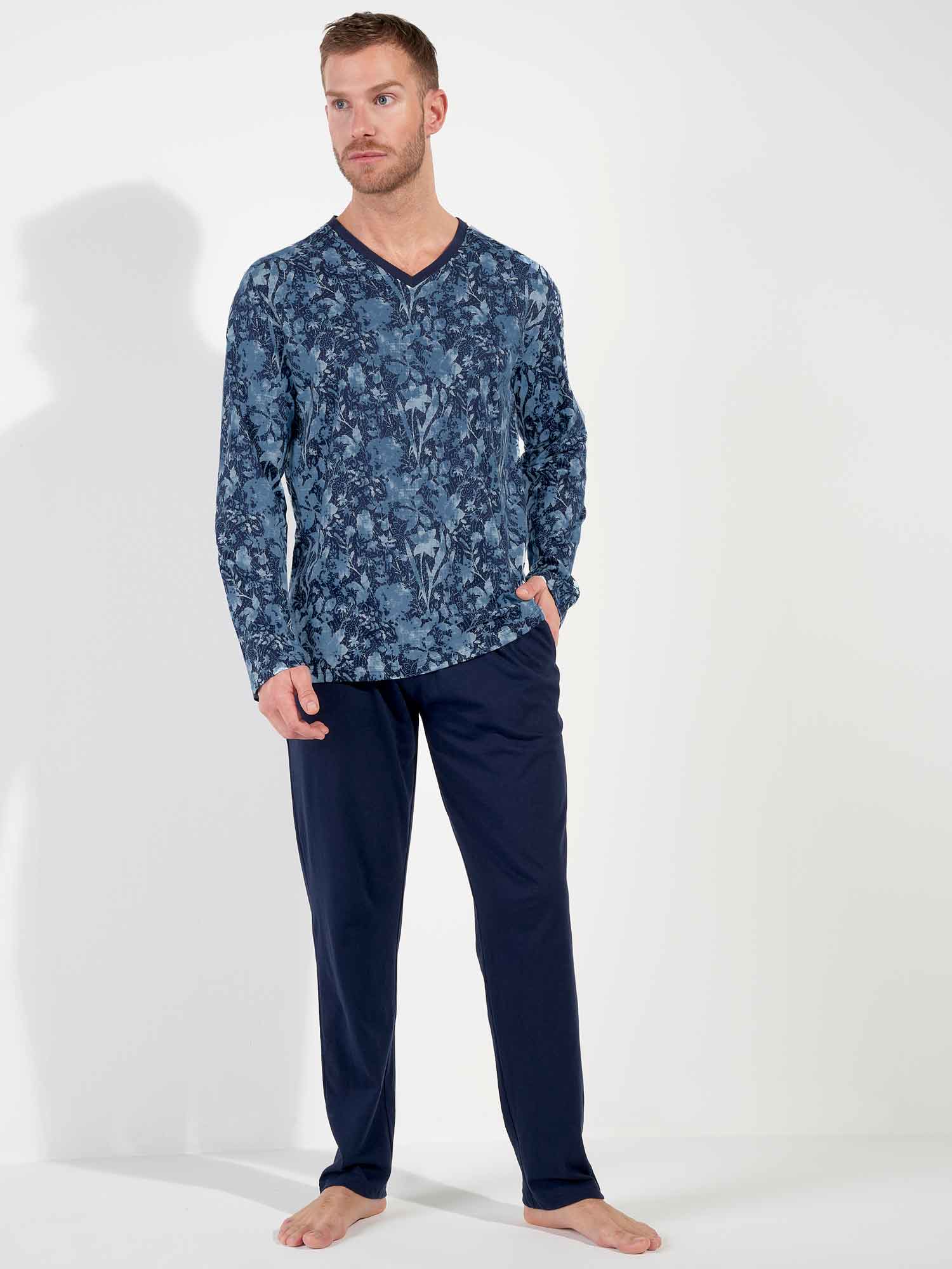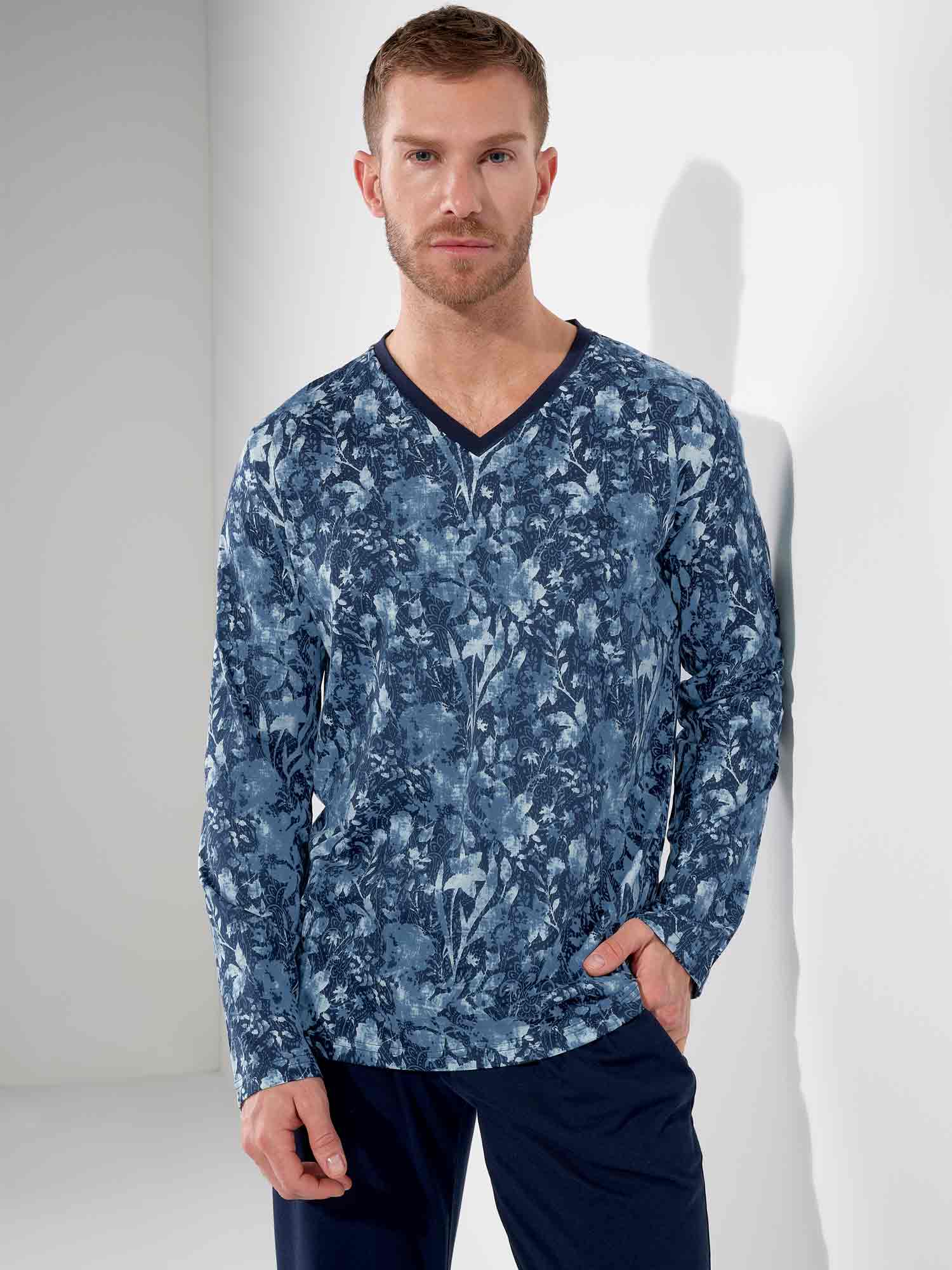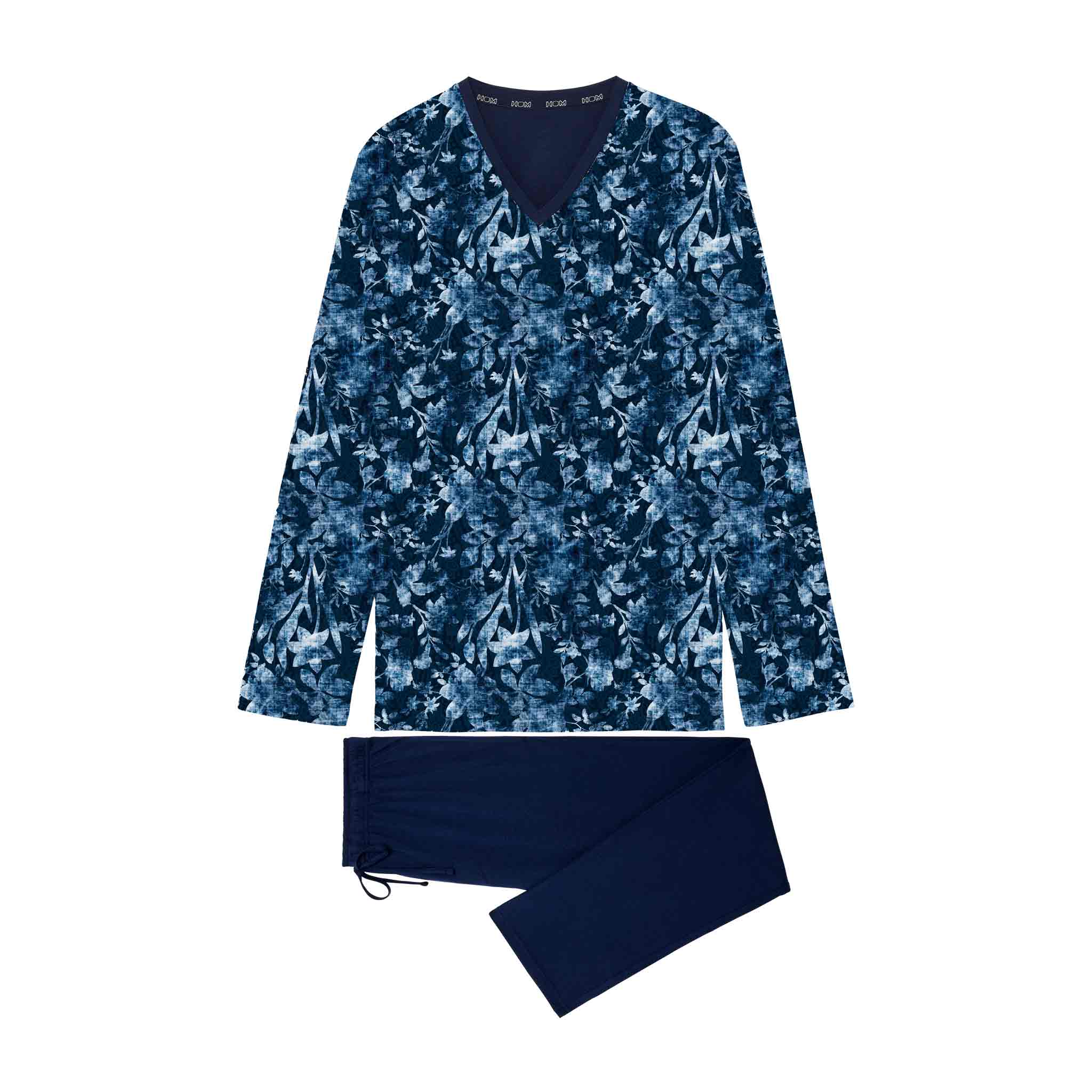 The Compiegne pyjama set brings together artistic flair and relaxed style. Made from 100% cotton, it feels soft and comfortable on the skin. The top features a refined floral print in faded denim blues, reminiscent of watercolor painting. The deep V-neck with a solid navy trim and subtle HOM logo adds an elegant finish. The plain dark navy trousers feature a drawstring and straight leg for optimal comfort while sleeping or lounging. A refined choice for men who appreciate character and comfort in a single design.