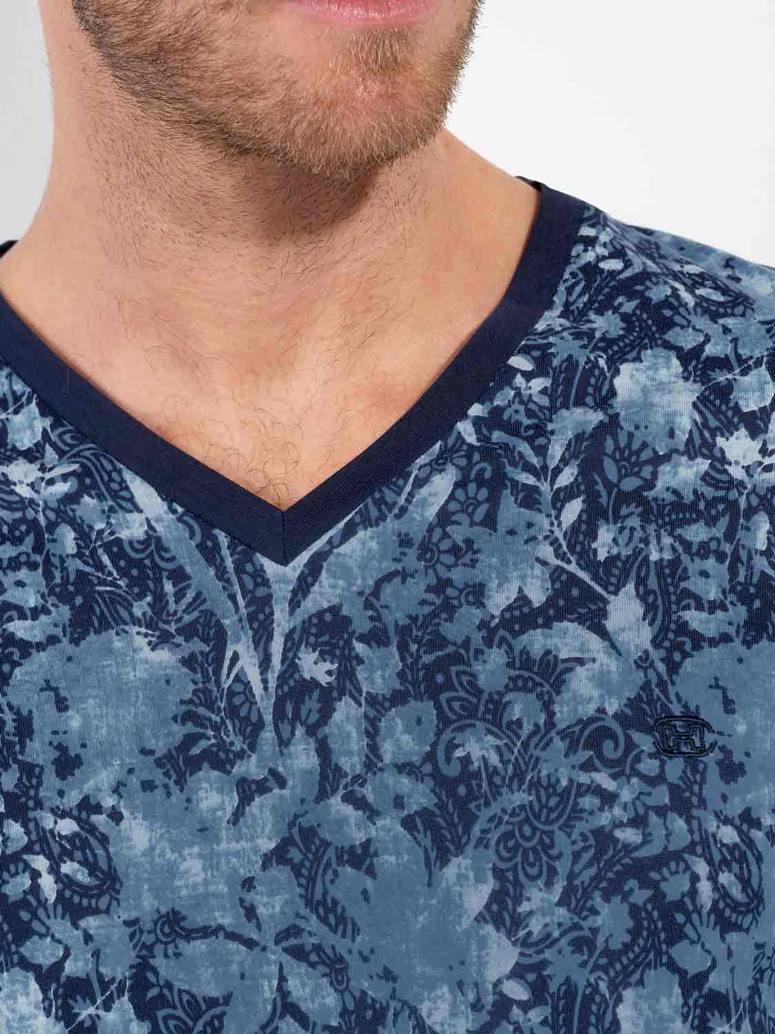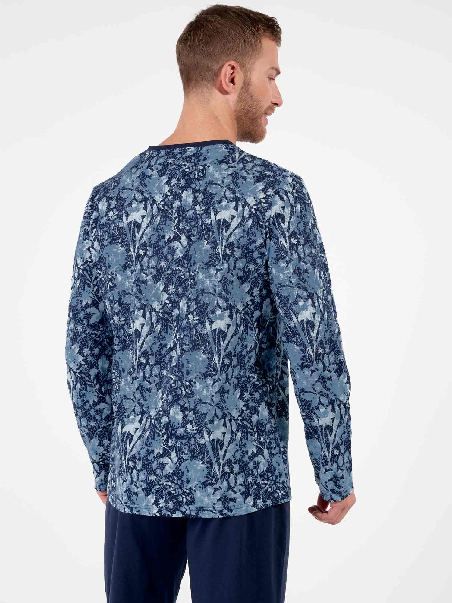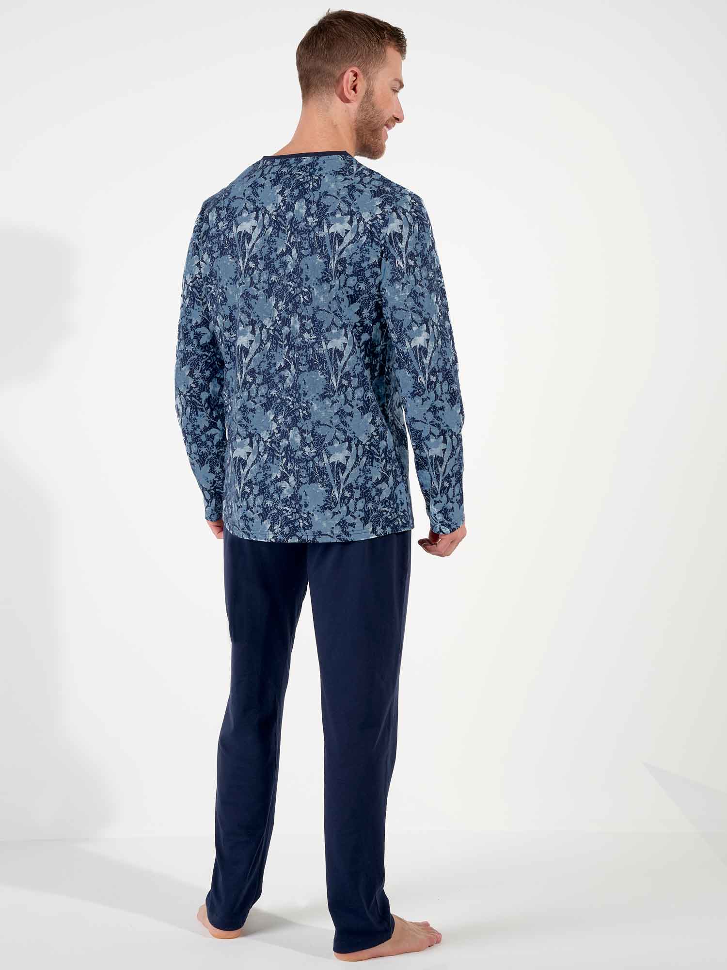 The Compiegne pyjama set brings together artistic flair and relaxed style. Made from 100% cotton, it feels soft and comfortable on the skin. The top features a refined floral print in faded denim blues, reminiscent of watercolor painting. The deep V-neck with a solid navy trim and subtle HOM logo adds an elegant finish. The plain dark navy trousers feature a drawstring and straight leg for optimal comfort while sleeping or lounging. A refined choice for men who appreciate character and comfort in a single design.