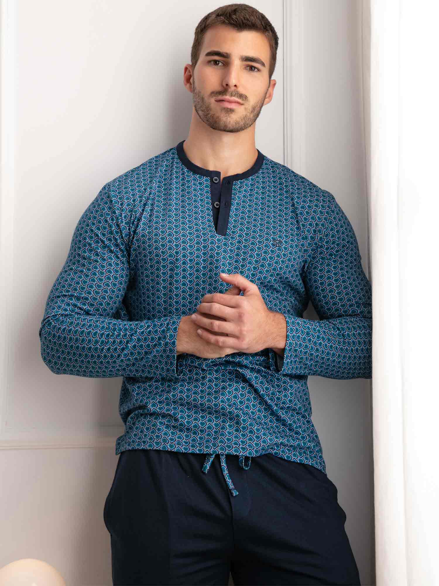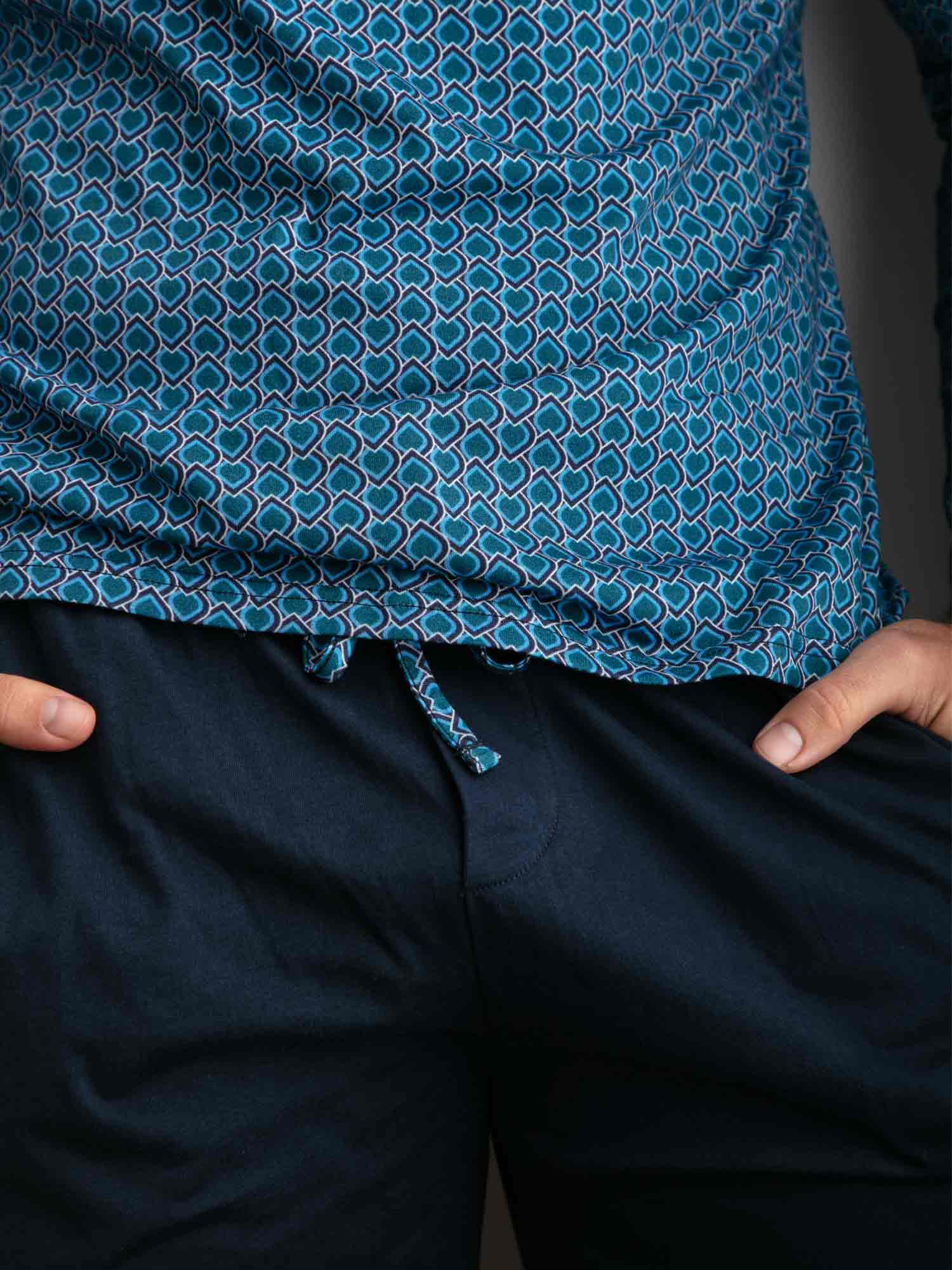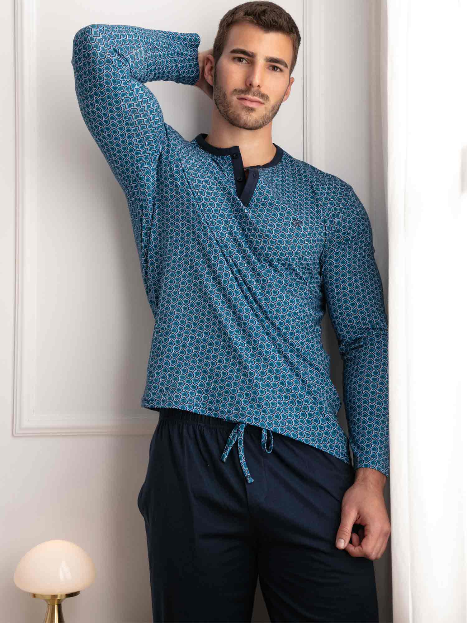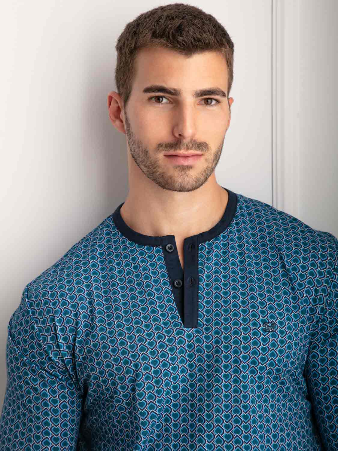 The Martinez long pyjamas by HOM pay tribute to the elegant geometry of the Art Deco era. Featuring a scale-like pattern in rich shades of blue and turquoise, inspired by Egyptian decorative motifs, these pyjamas combine refinement with comfort. The stylish Tunisian collar with contrasting button placket adds a modern twist, while the soft 100% cotton fabric ensures breathability and ease. Ideal for a relaxed evening or a peaceful night’s sleep.