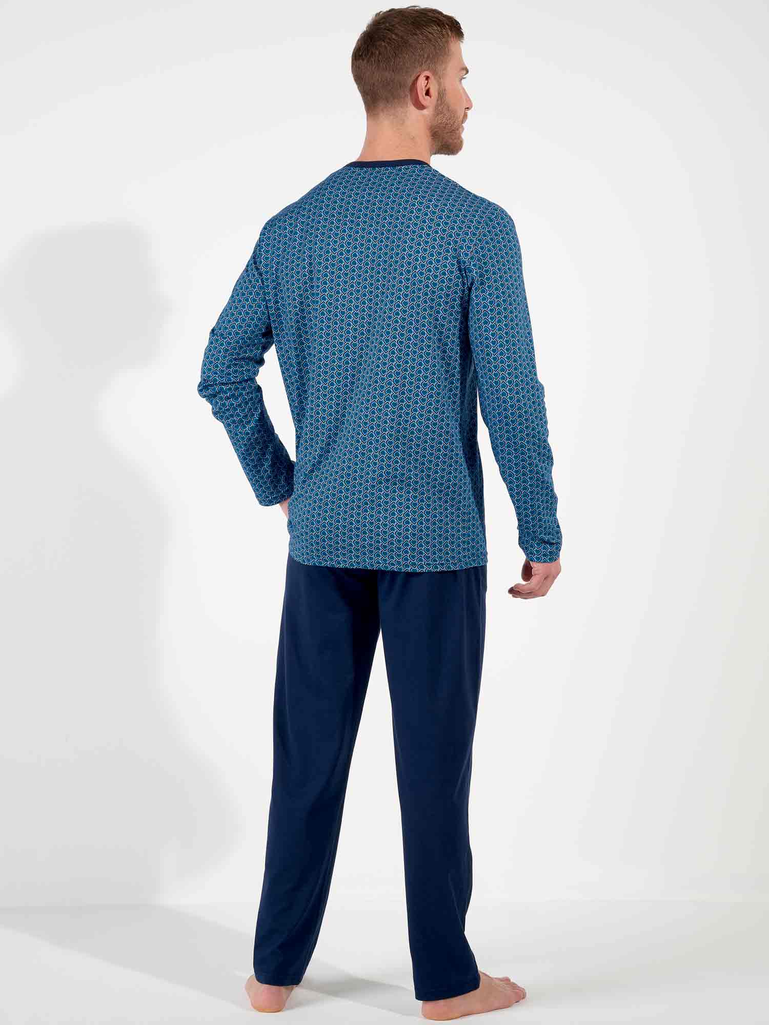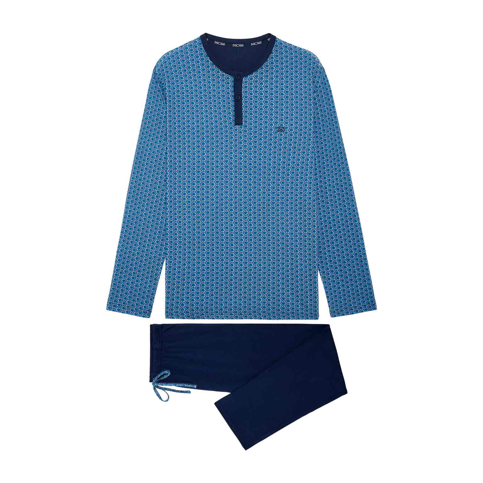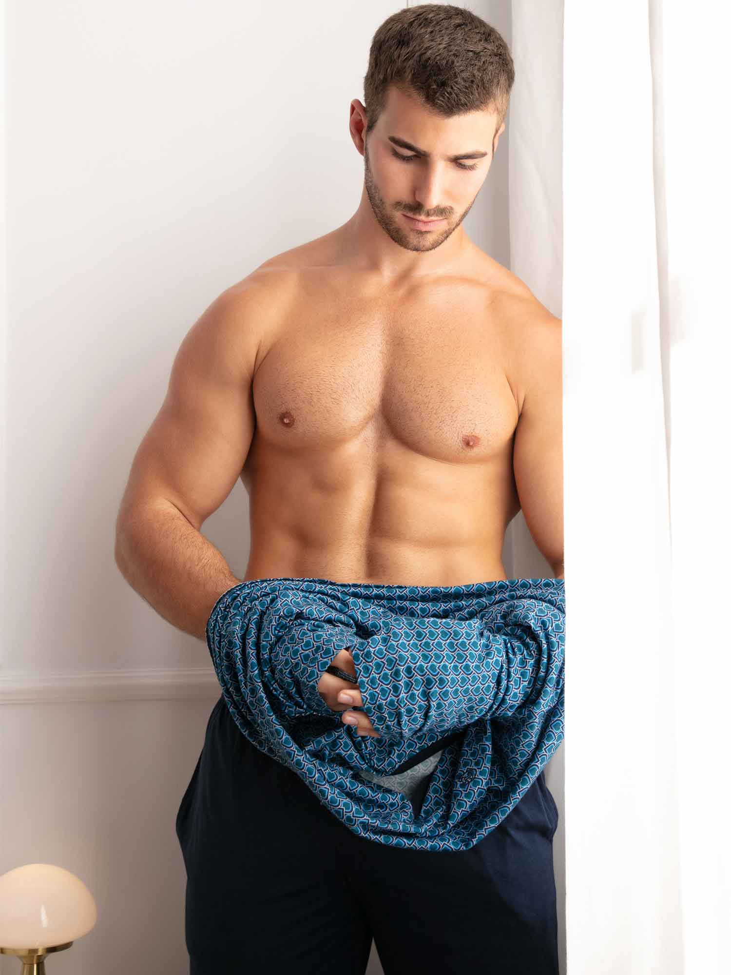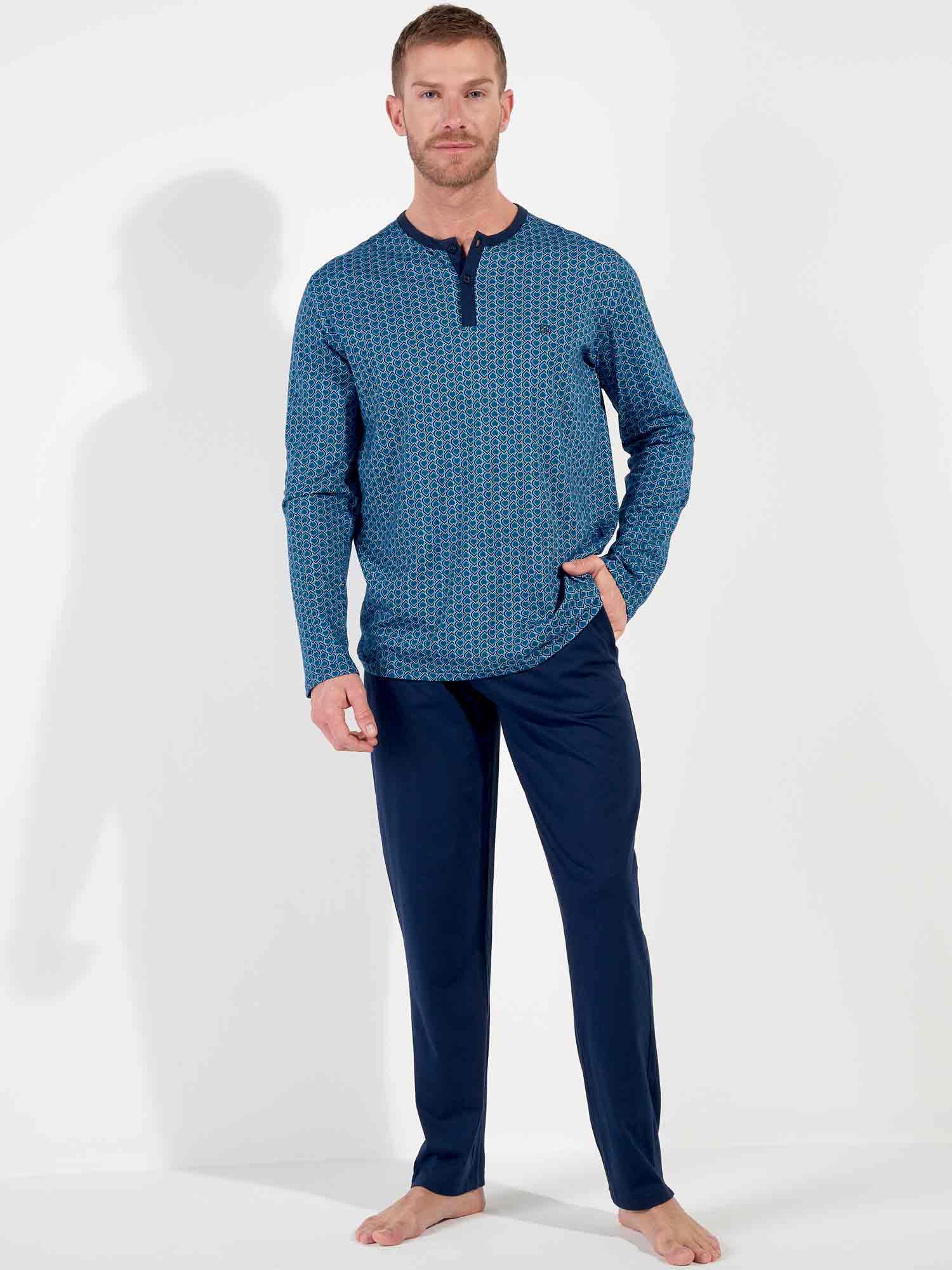 The Martinez long pyjamas by HOM pay tribute to the elegant geometry of the Art Deco era. Featuring a scale-like pattern in rich shades of blue and turquoise, inspired by Egyptian decorative motifs, these pyjamas combine refinement with comfort. The stylish Tunisian collar with contrasting button placket adds a modern twist, while the soft 100% cotton fabric ensures breathability and ease. Ideal for a relaxed evening or a peaceful night’s sleep.