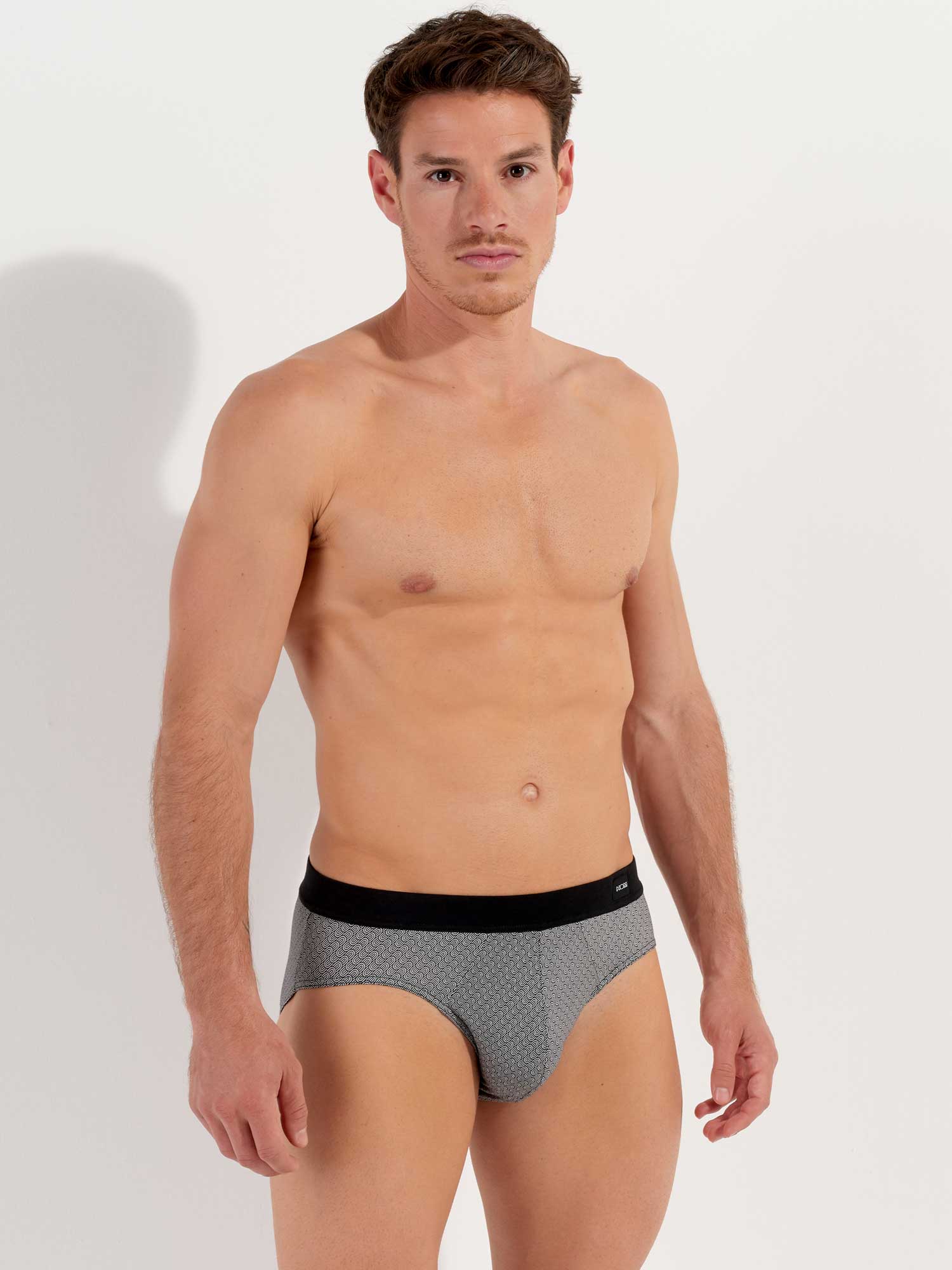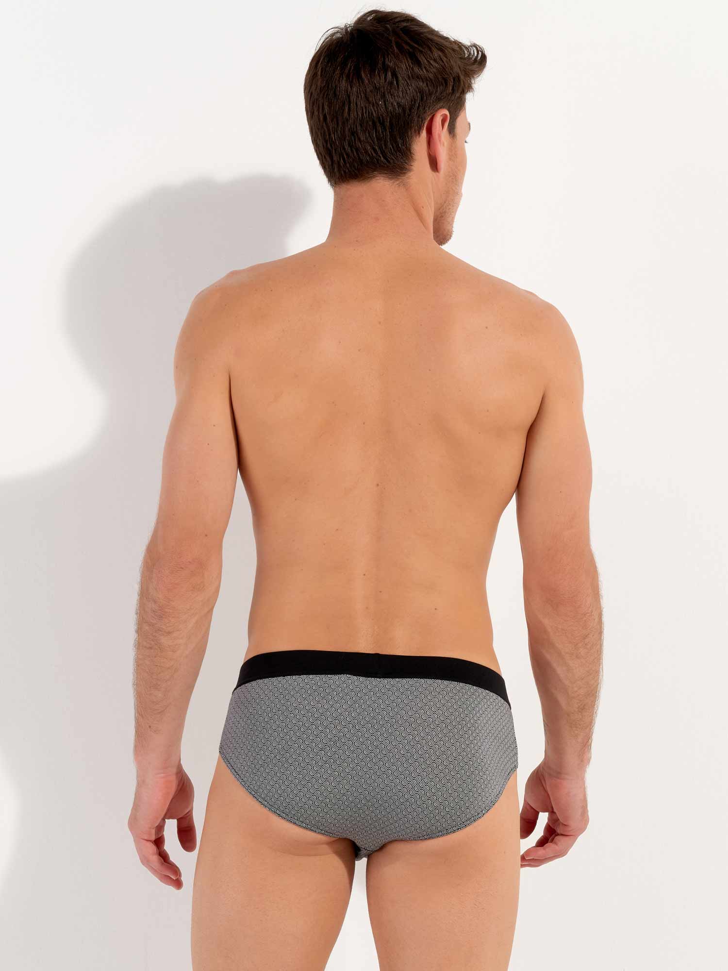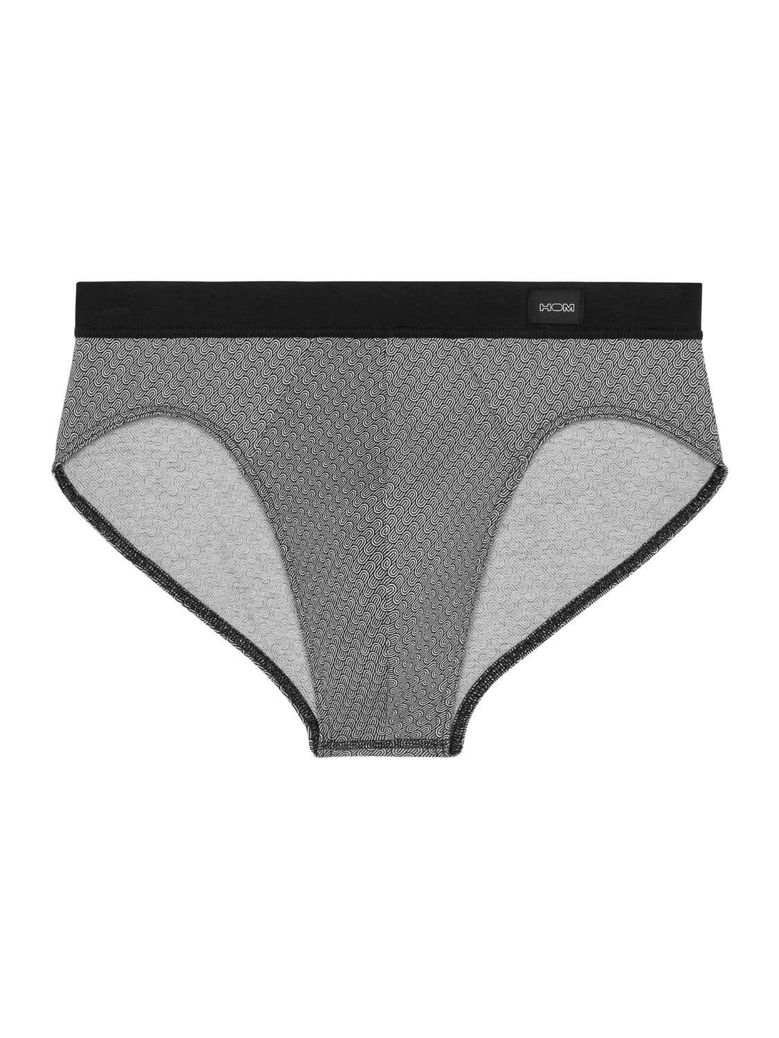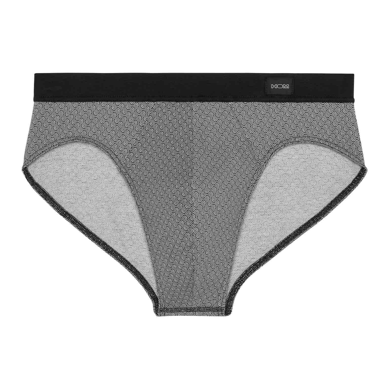 The Herbie - Comfort Mini Briefs is made from high-quality cotton-modal and designed with a comfort waistband, where the fabric extends and is folded over the elastic band for extra comfort. This men's mini slip features a print with diagonal geometric patterns and illustrations of black and white waves. On the left front of the comfort waistband, a small HOM label is placed.