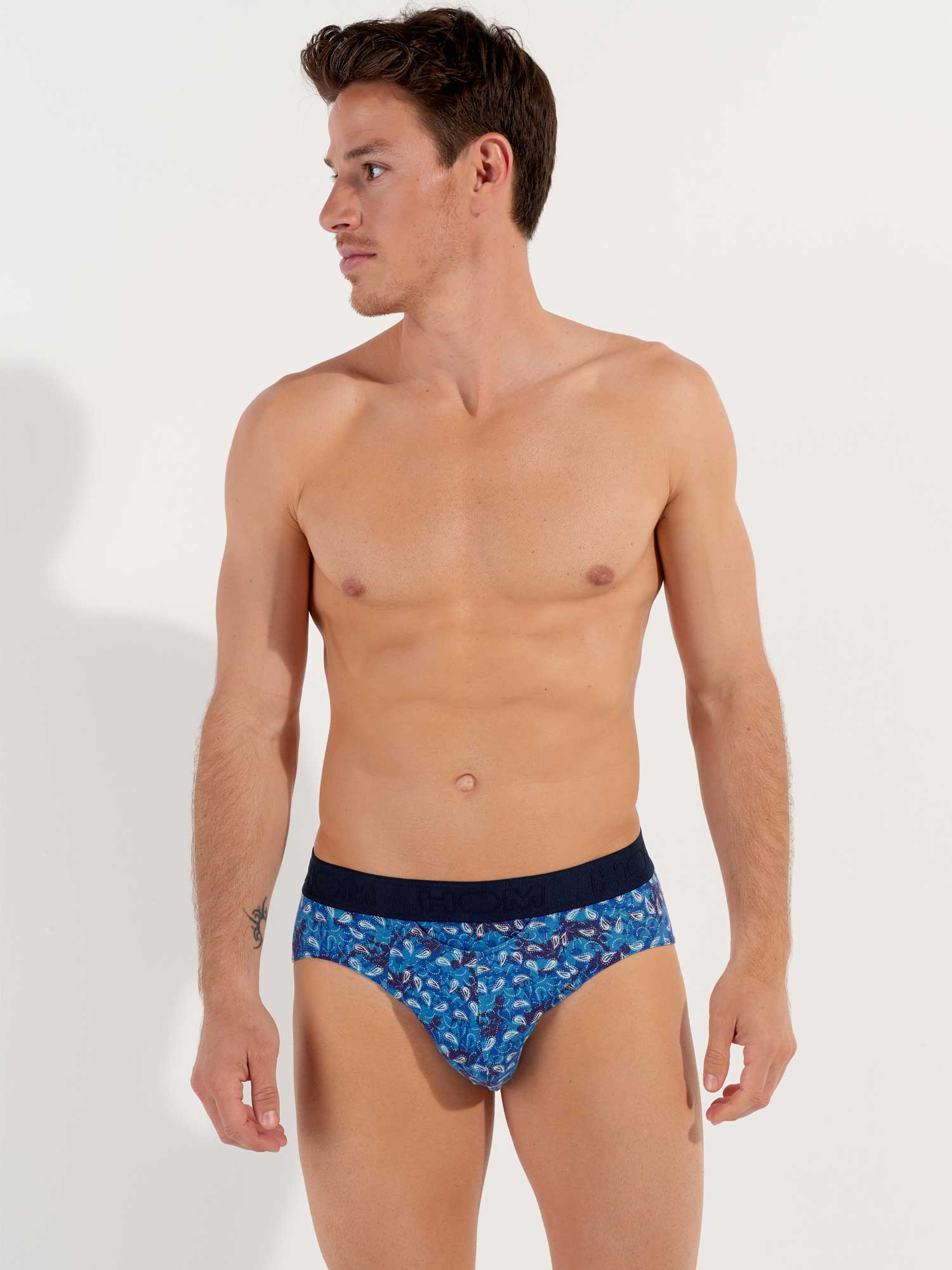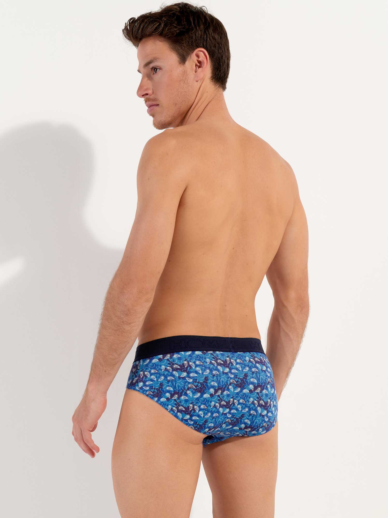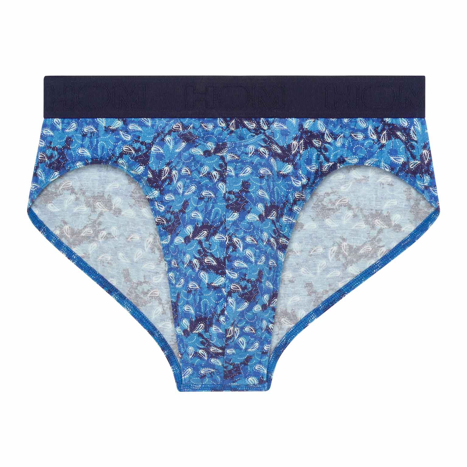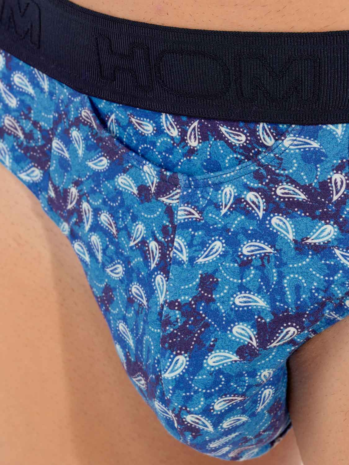 The Vibe - HO1 Mini Briefs is made of high-quality cotton-modal and features the 'horizontal opening', HOM's signature fly for extra convenience. This men's brief showcases a vintage print with white paisleys on a blue background. The Vibe has an elastic waistband in navy blue with a stylish ribbed texture. The waistband is adorned with the HOM logo in a tonal design.
