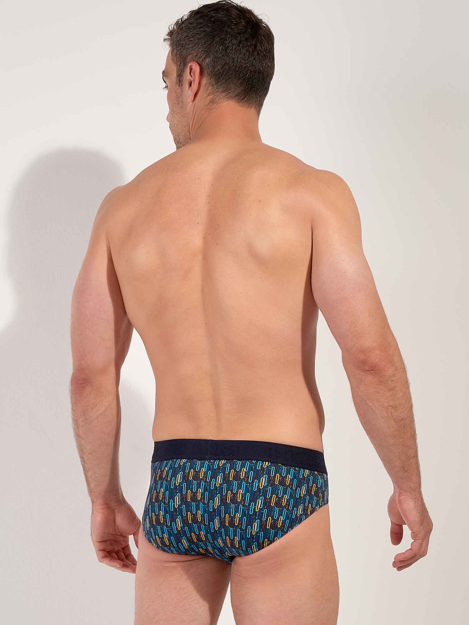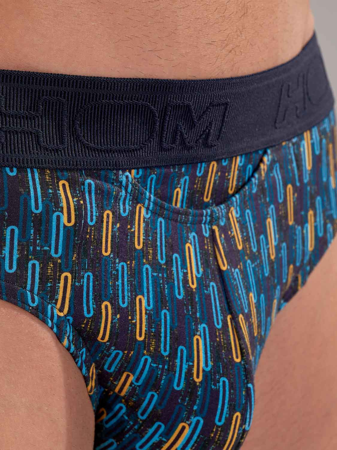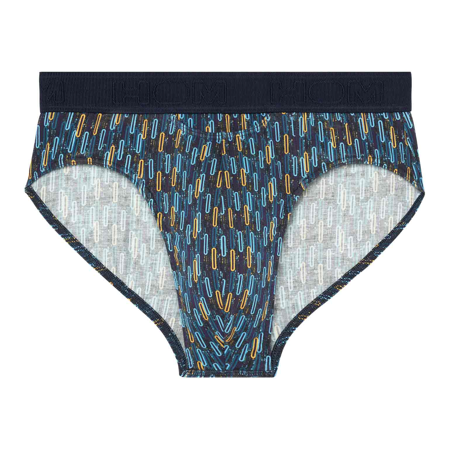 The HOM Westgate mini briefs HO1 deliver a sharp, streamlined silhouette with the same bold retro energy. The contrasting blue and yellow oval motifs on a navy background echo the dynamism of 1950s geometric art, inspired by the visual audacity of Las Vegas. Crafted from a premium cotton, modal and elastane blend, they feel exceptionally soft, flexible and durable for everyday wear. The patented HO1 horizontal opening, also known as the horizontal fly, provides ergonomic comfort and easy access for both right- and left-handed wearers. A discreet elastic reinforcement at the front ensures a natural, precise fit, while the sheer veil leg finish keeps the lines clean and refined under clothing. A confident essential with unmistakable HOM style.