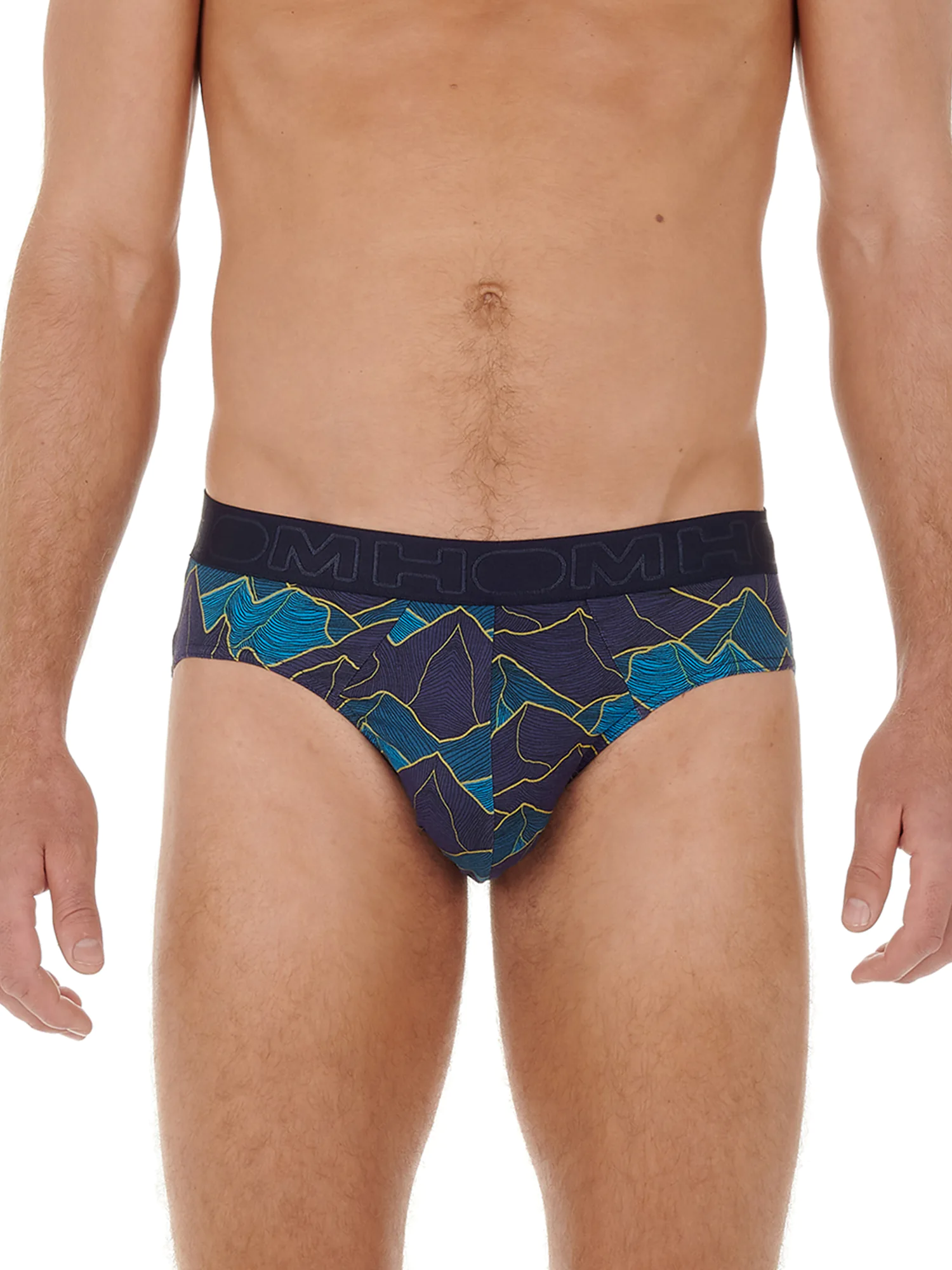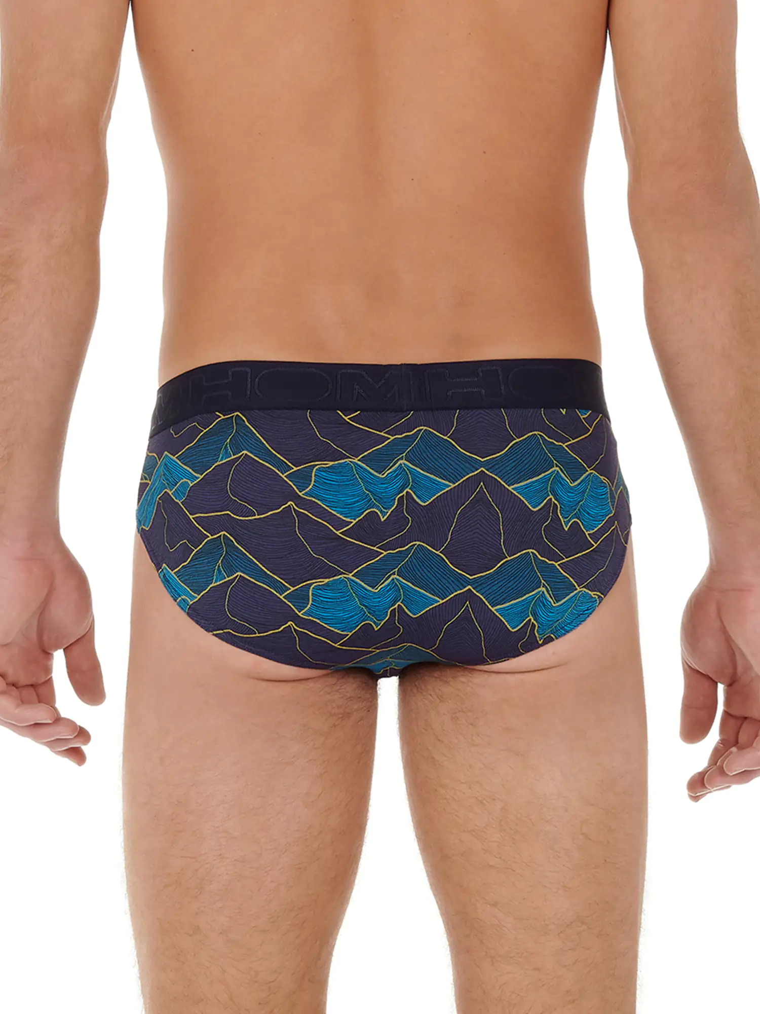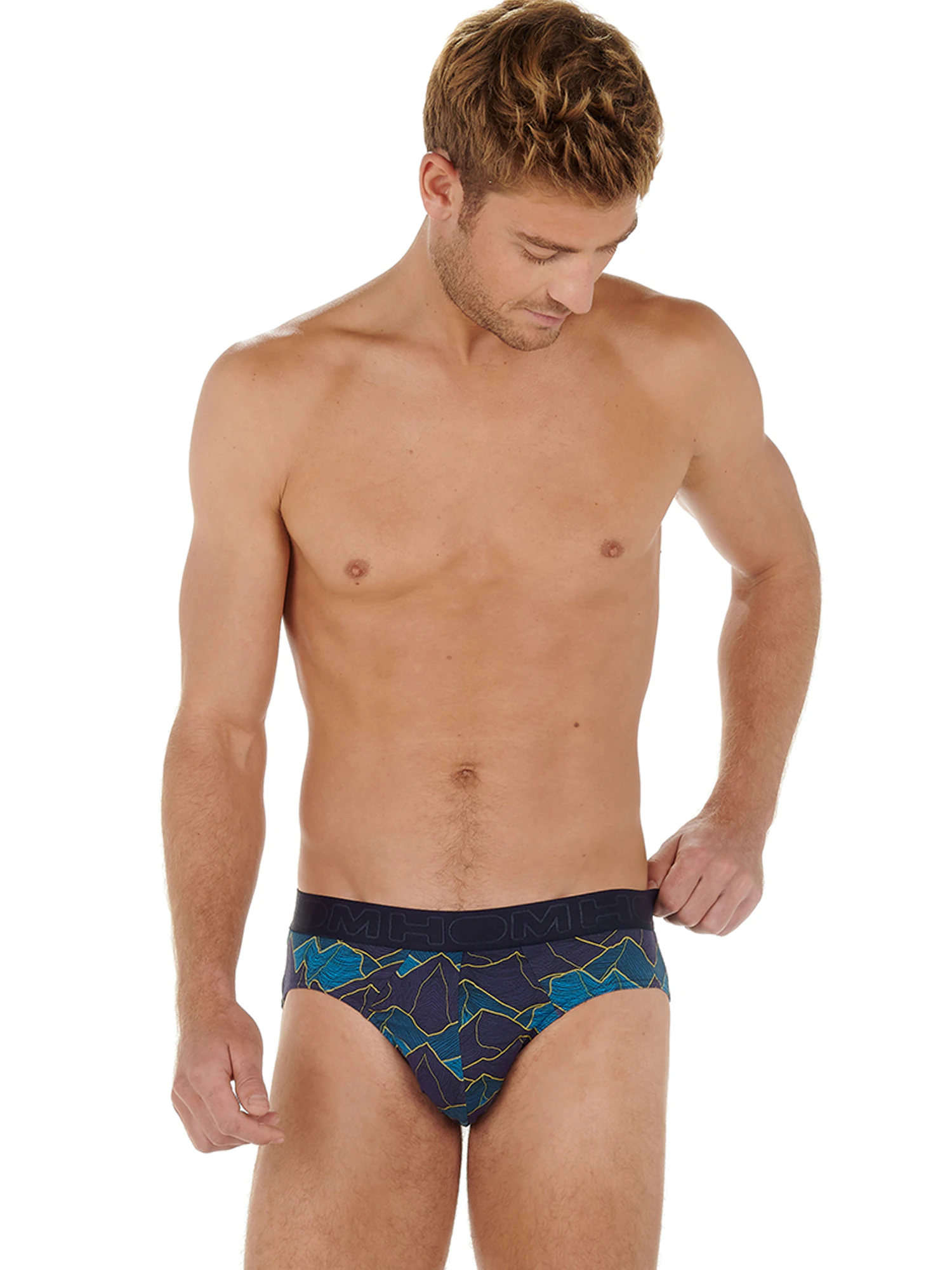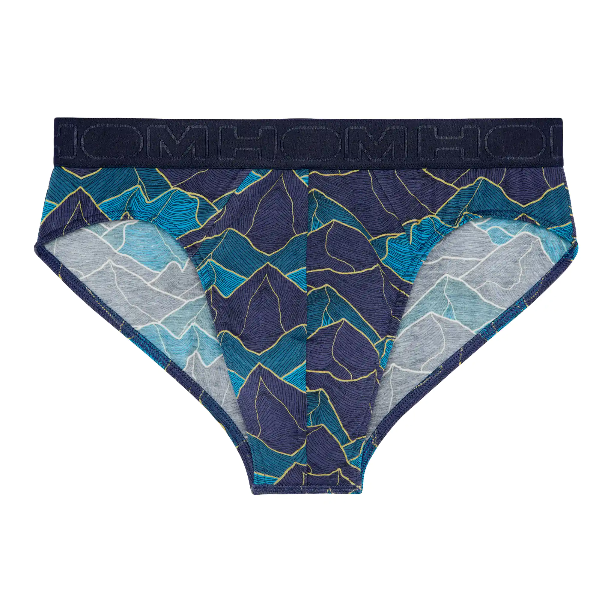 The Lino Mini Brief is made from a comfortable cotton-modal mix and features a striking landscape print based on mountains, in blue tones on a navy blue background. The cotton-modal mix feels soft and ensures a fit that closely conforms to the body. Additionally, cotton-modal has excellent absorbent and breathable properties, so you are much less likely to get warm, clammy spots in your underwear. Since both cotton and modal have a natural origin, the Lino is suitable for any man who likes to wear natural fabrics. Under normal use, the fabric is resistant to shrinking and abrasion. The men's briefs have a wide waistband with the HOM logo in tone-on-tone.