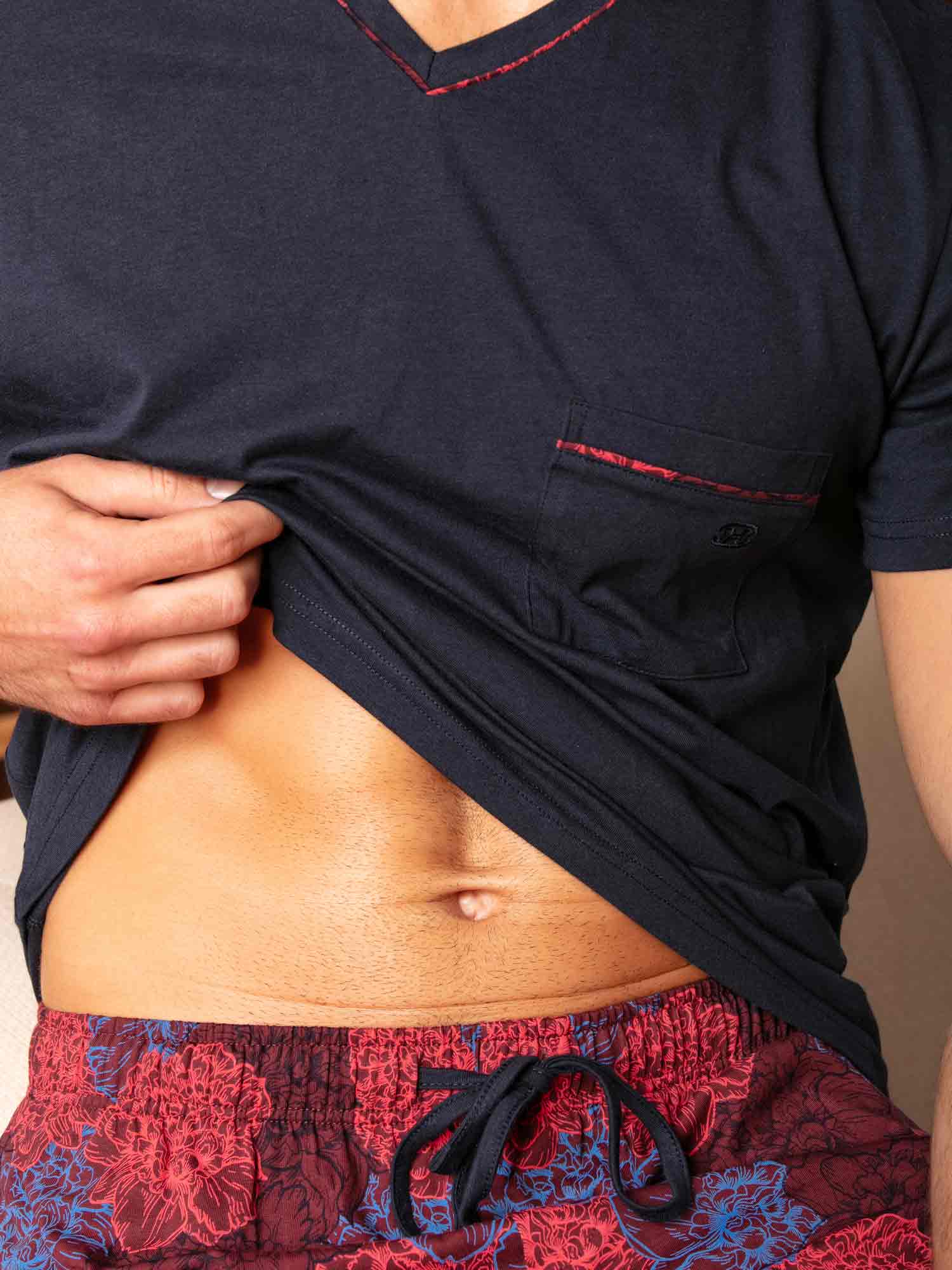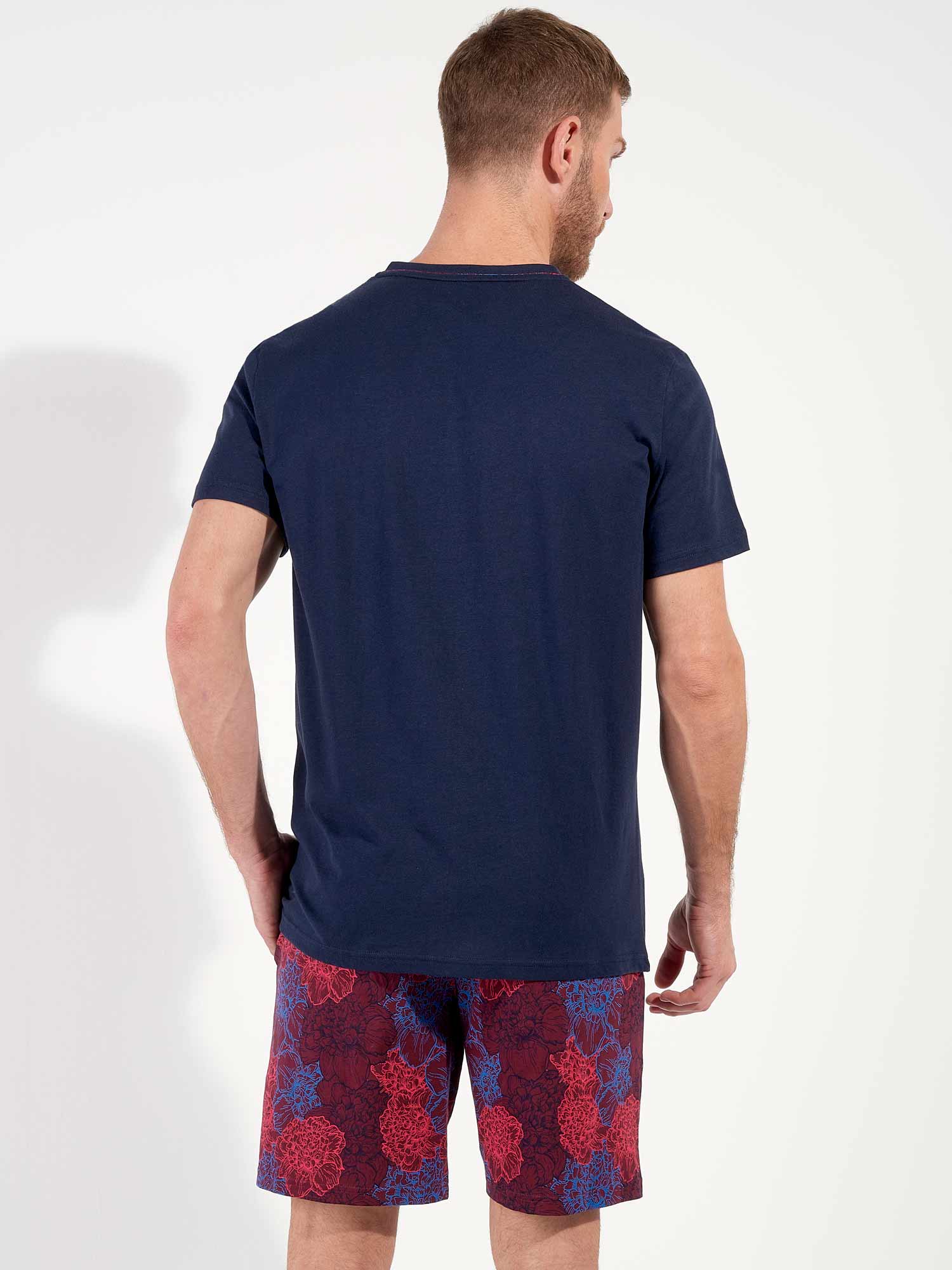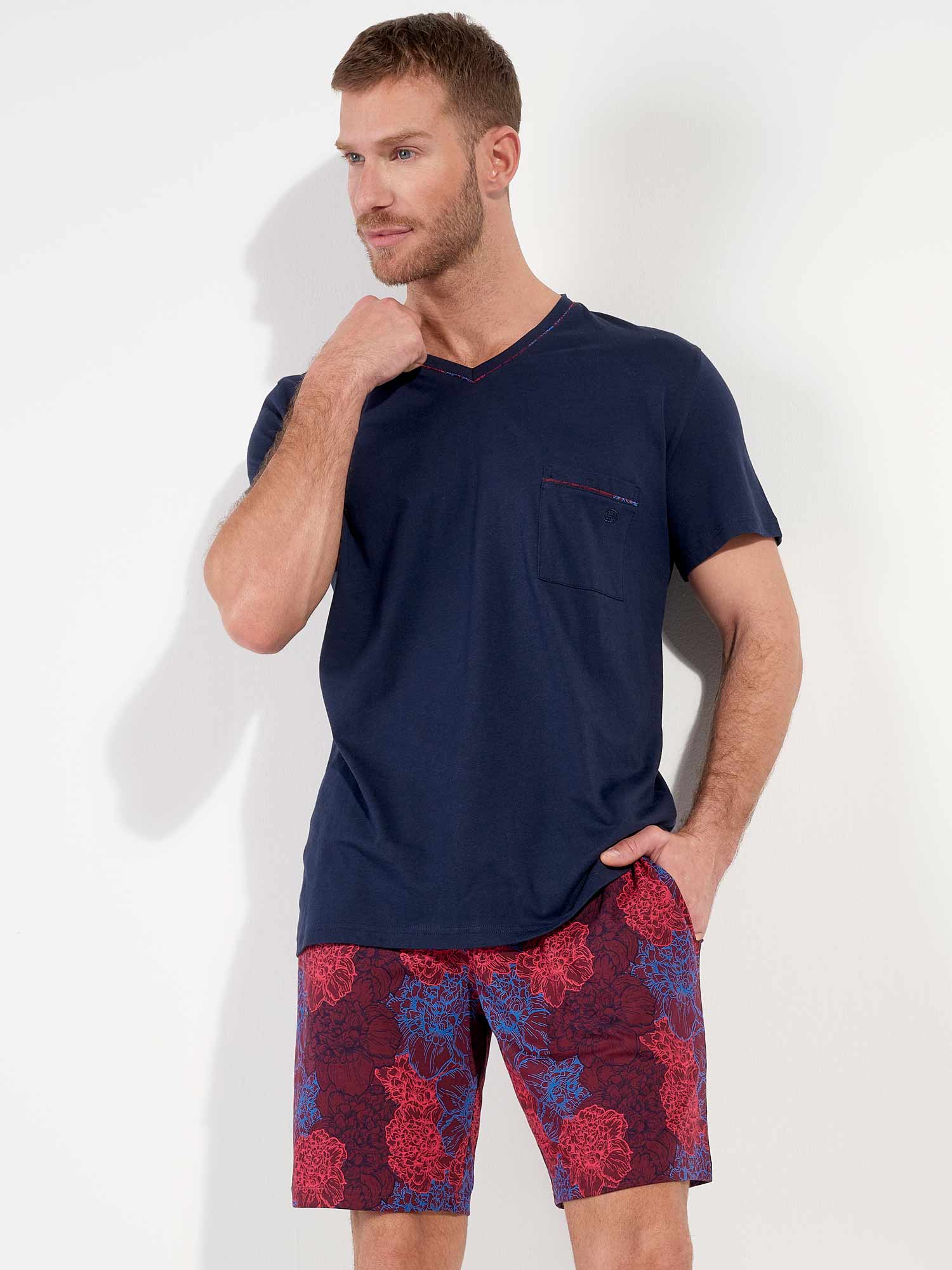 The Bouquet short pyjama set blends playful flair with refined comfort. Made from 100% cotton, it feels soft and breathable against the skin – perfect for men who prefer lighter nightwear, even in fall or in a well-heated home. The dark navy T-shirt features a stylish V-neck with floral piping and a coordinating chest pocket. The burgundy shorts with bold blue and red florals complete the look. A bold, expressive pyjama for men who value both comfort and style, all year round.