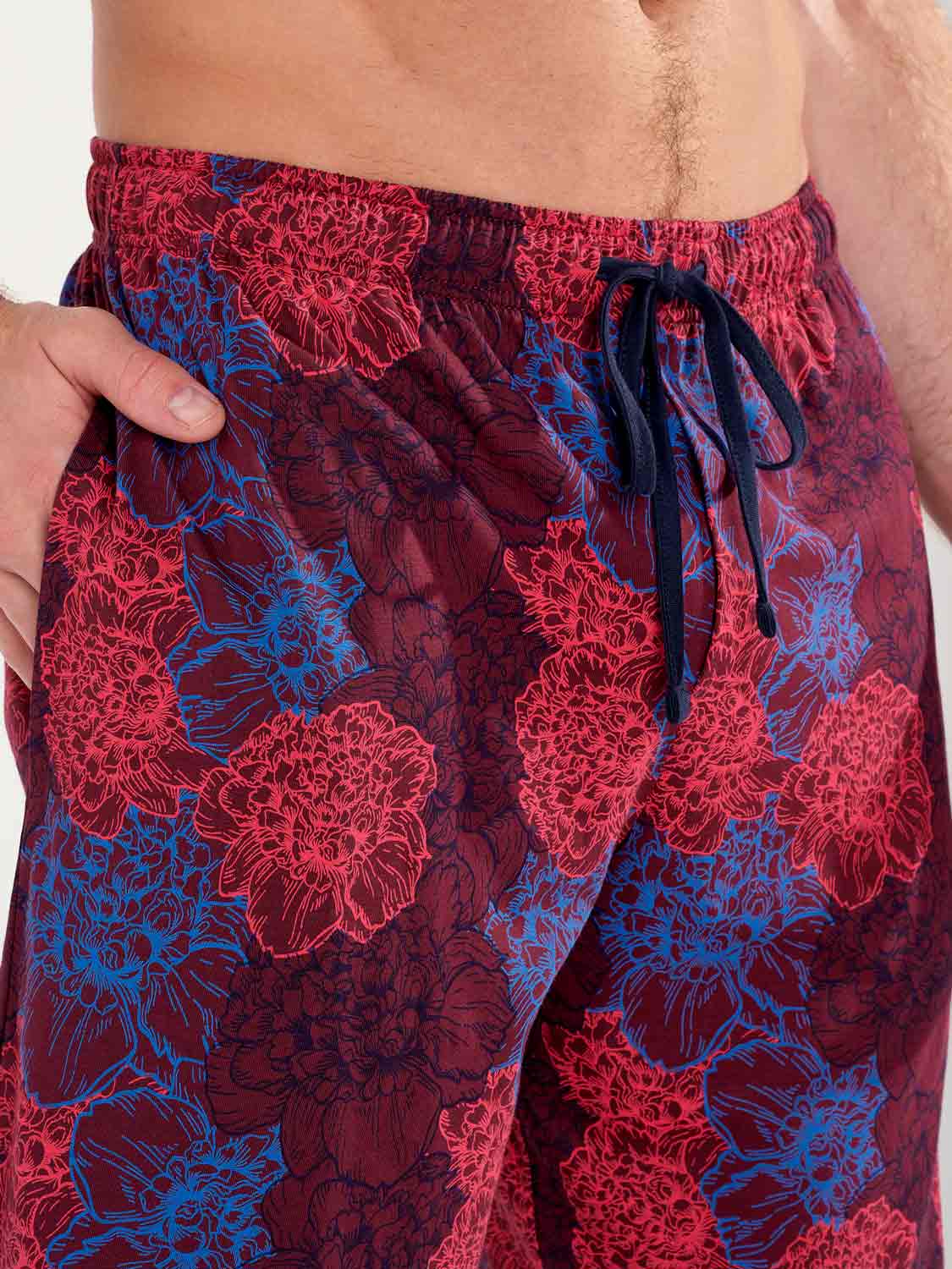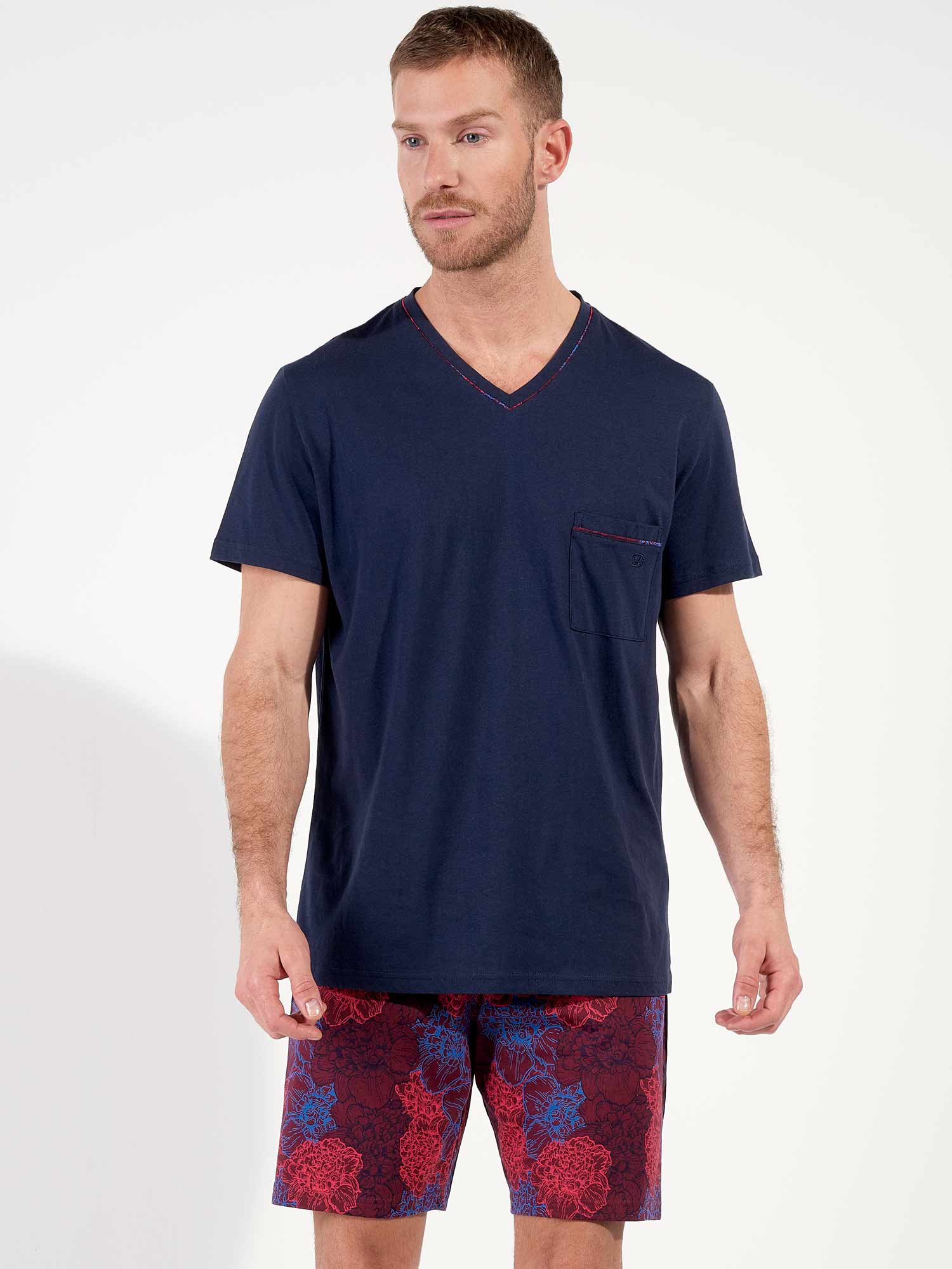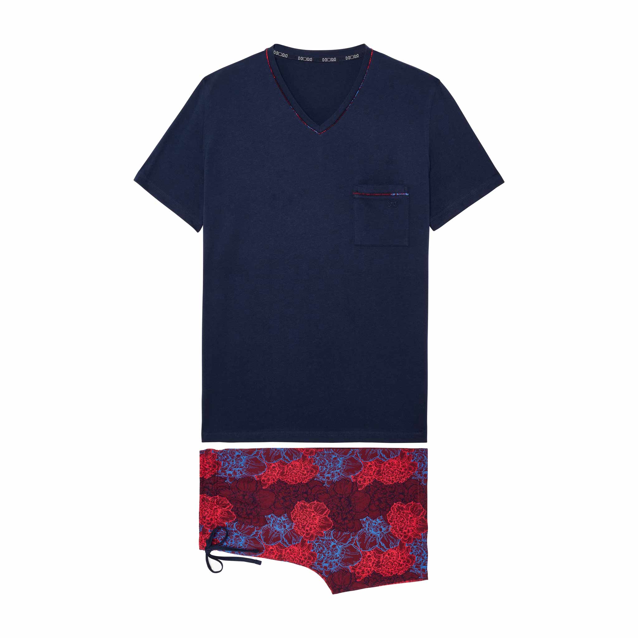 The Bouquet short pyjama set blends playful flair with refined comfort. Made from 100% cotton, it feels soft and breathable against the skin – perfect for men who prefer lighter nightwear, even in fall or in a well-heated home. The dark navy T-shirt features a stylish V-neck with floral piping and a coordinating chest pocket. The burgundy shorts with bold blue and red florals complete the look. A bold, expressive pyjama for men who value both comfort and style, all year round.