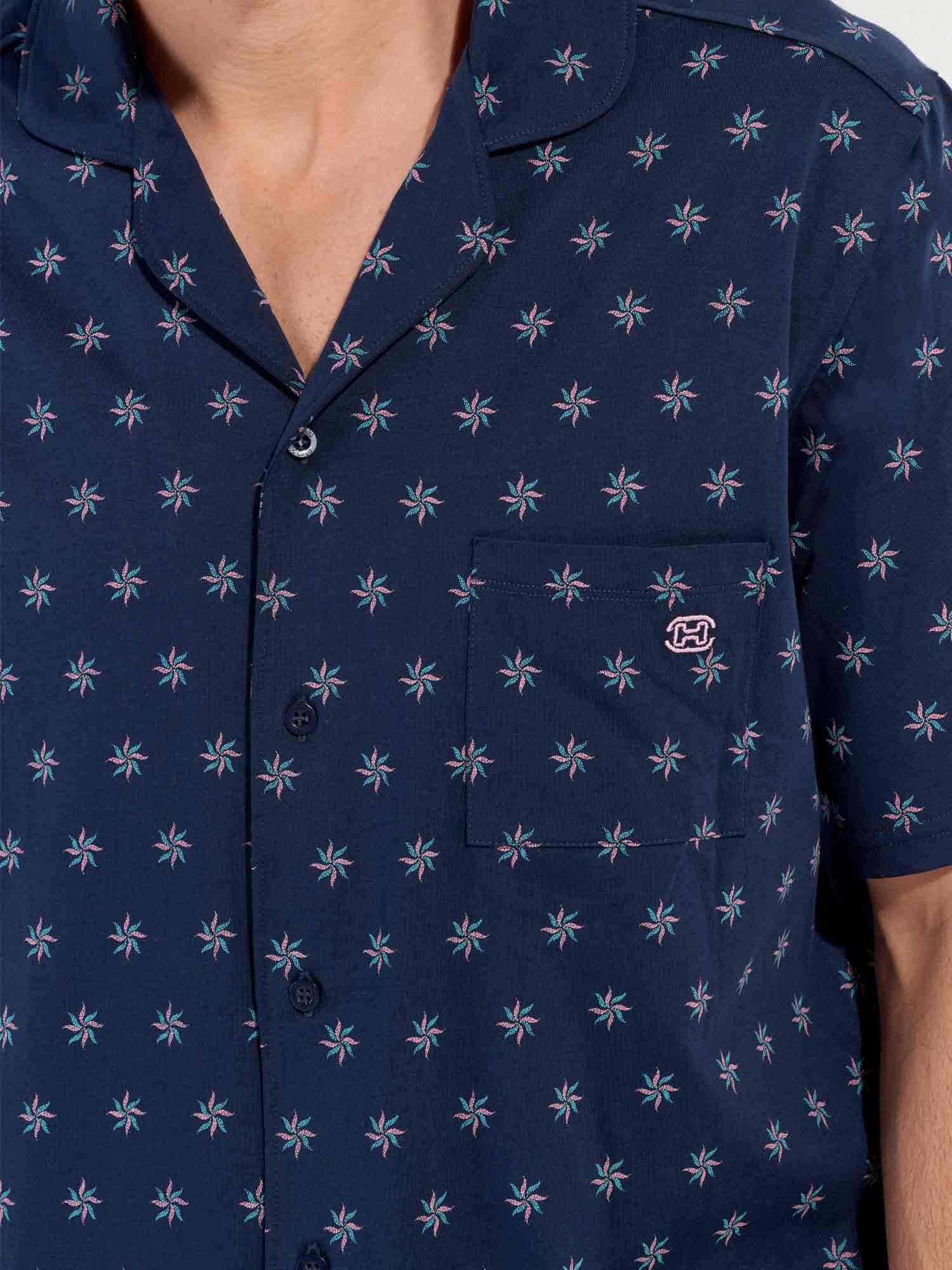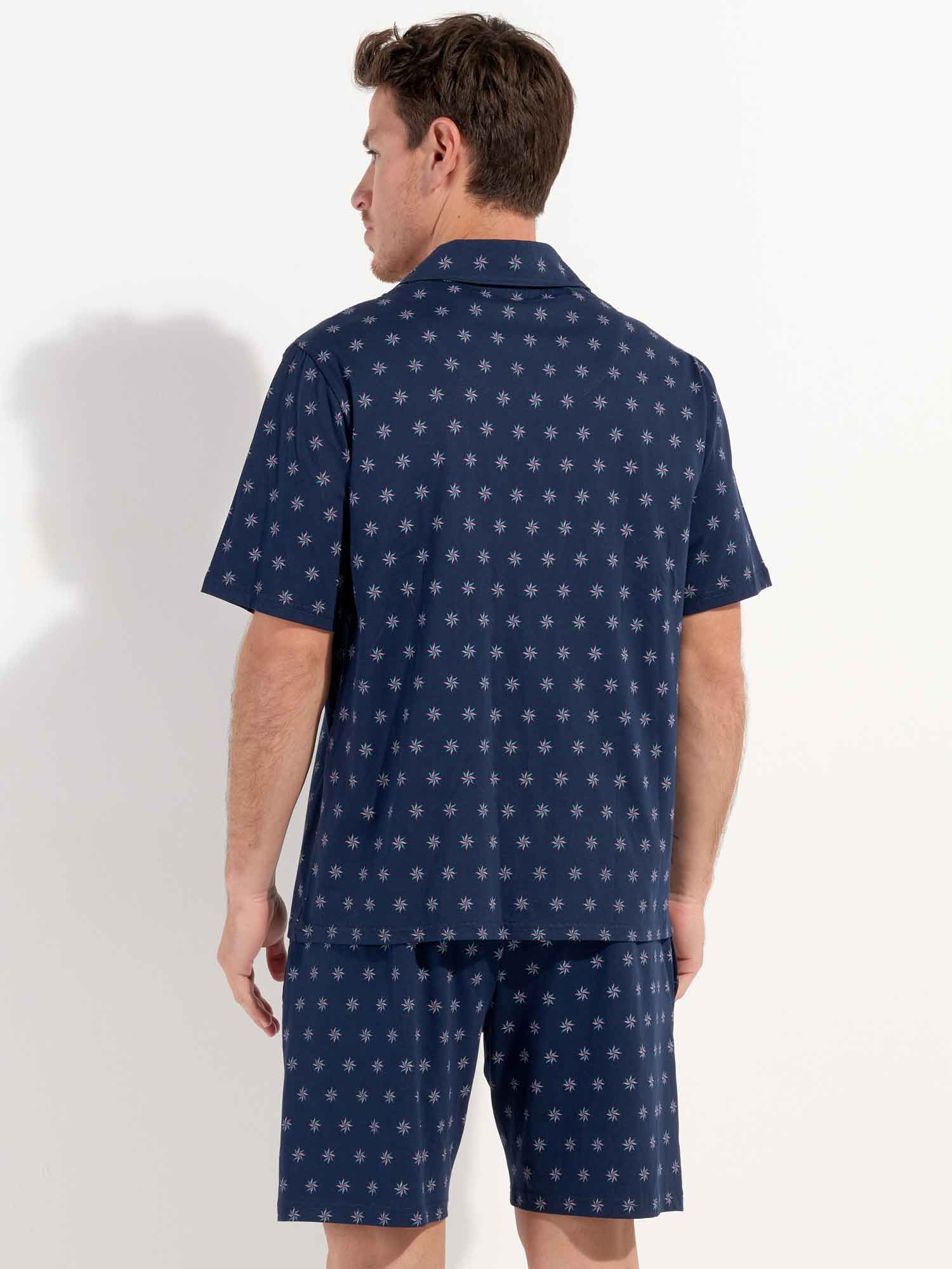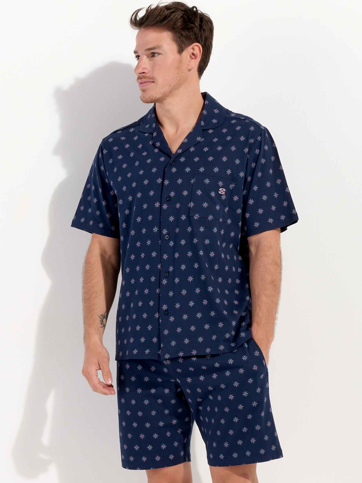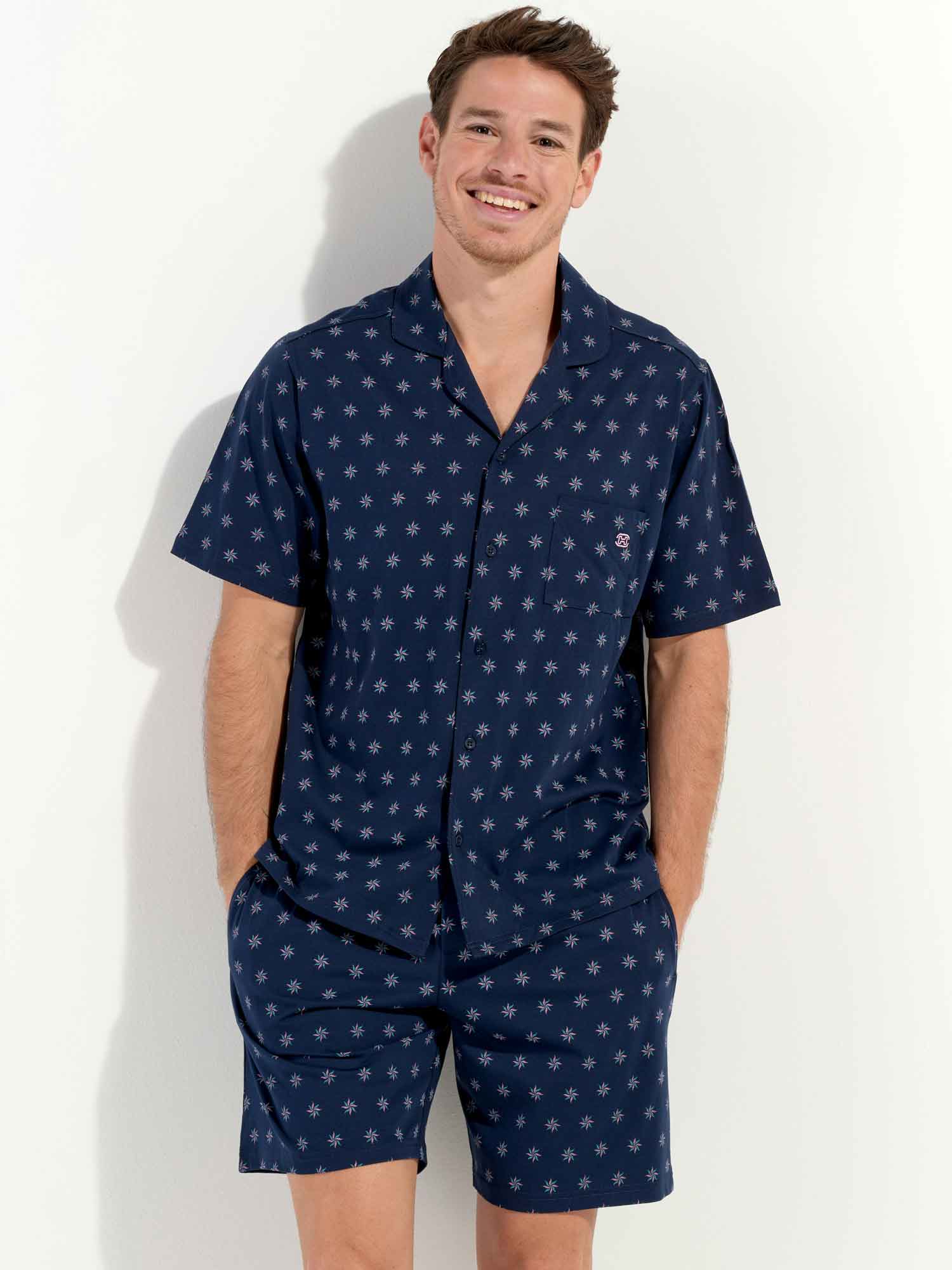 The Indio - Shortama is a button-up pajama made of 100% cotton. The shirt features elegant embroidery, a chest pocket, and a modern collar. The Bermuda shorts also have embroidery and side seam pockets on both the left and right sides. The pajama shorts can be perfectly adjusted with the drawstring in the waistband.