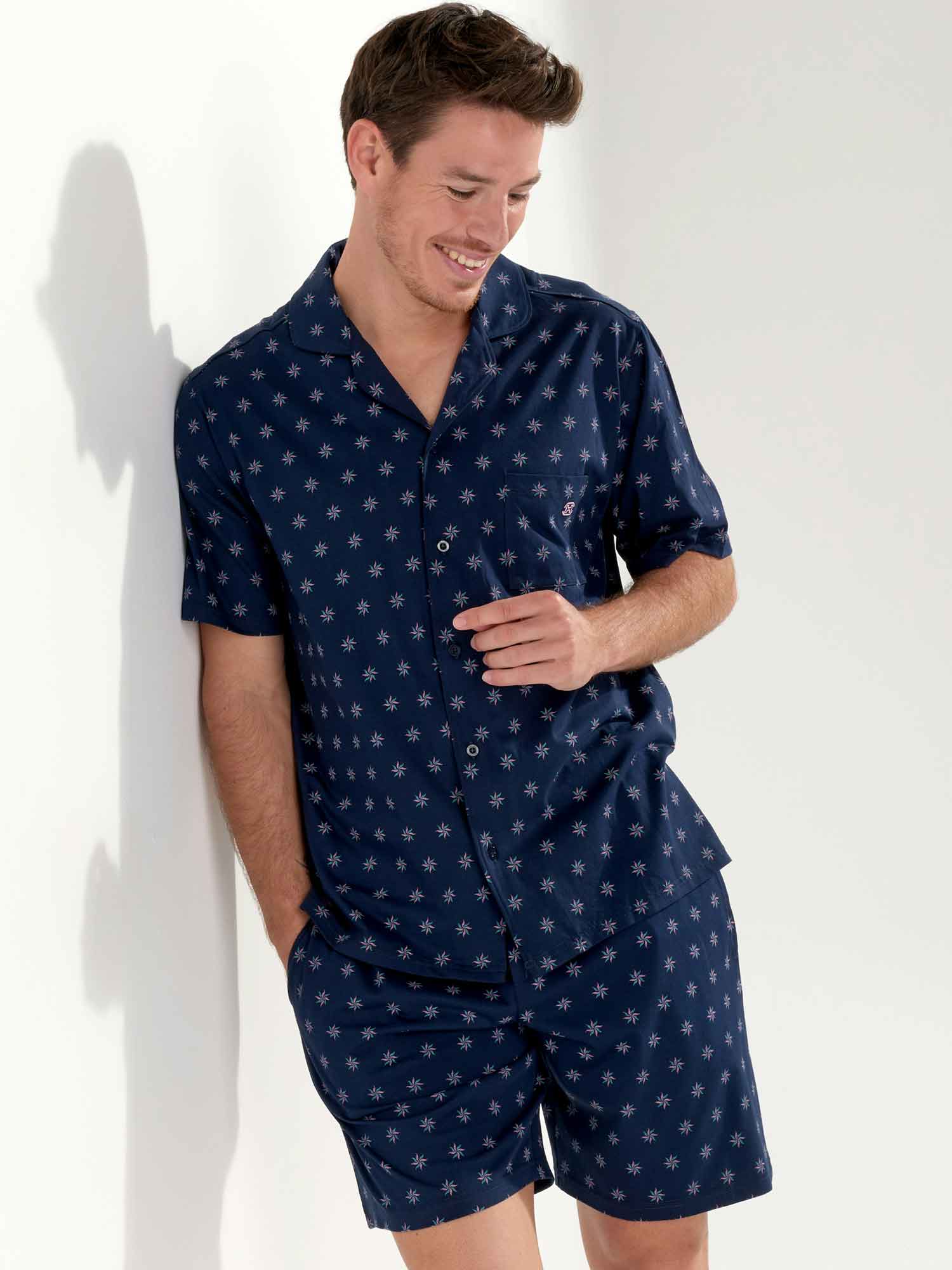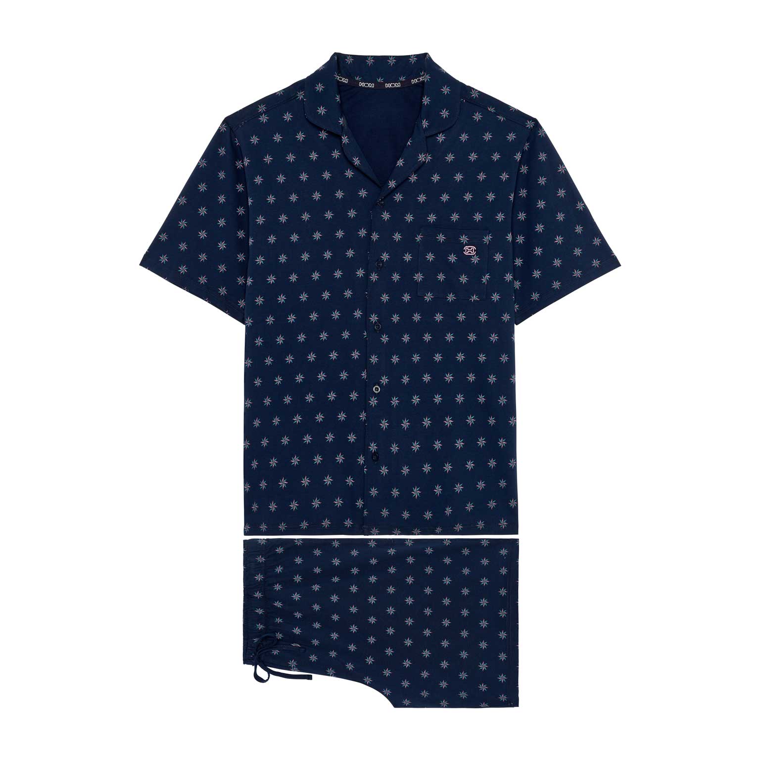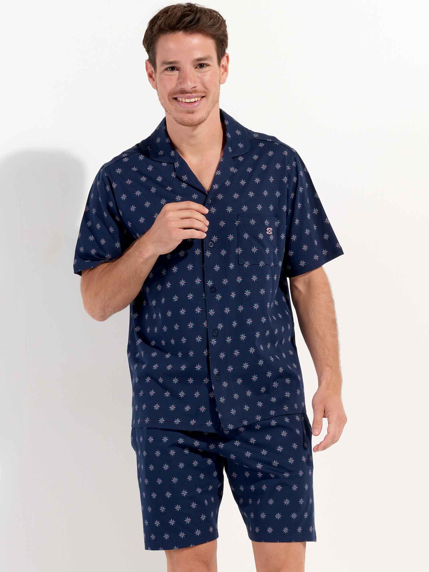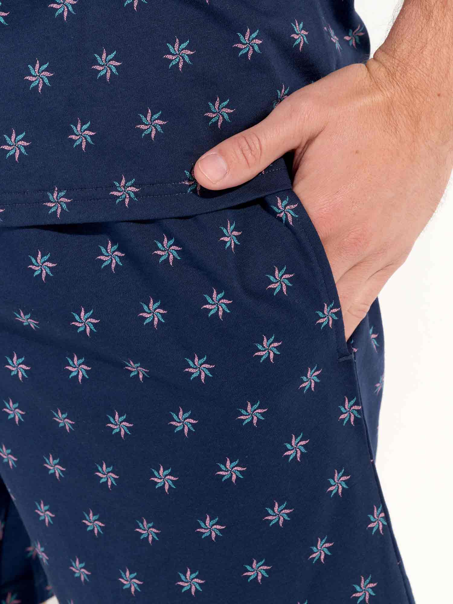 The Indio - Shortama is a button-up pajama made of 100% cotton. The shirt features elegant embroidery, a chest pocket, and a modern collar. The Bermuda shorts also have embroidery and side seam pockets on both the left and right sides. The pajama shorts can be perfectly adjusted with the drawstring in the waistband.