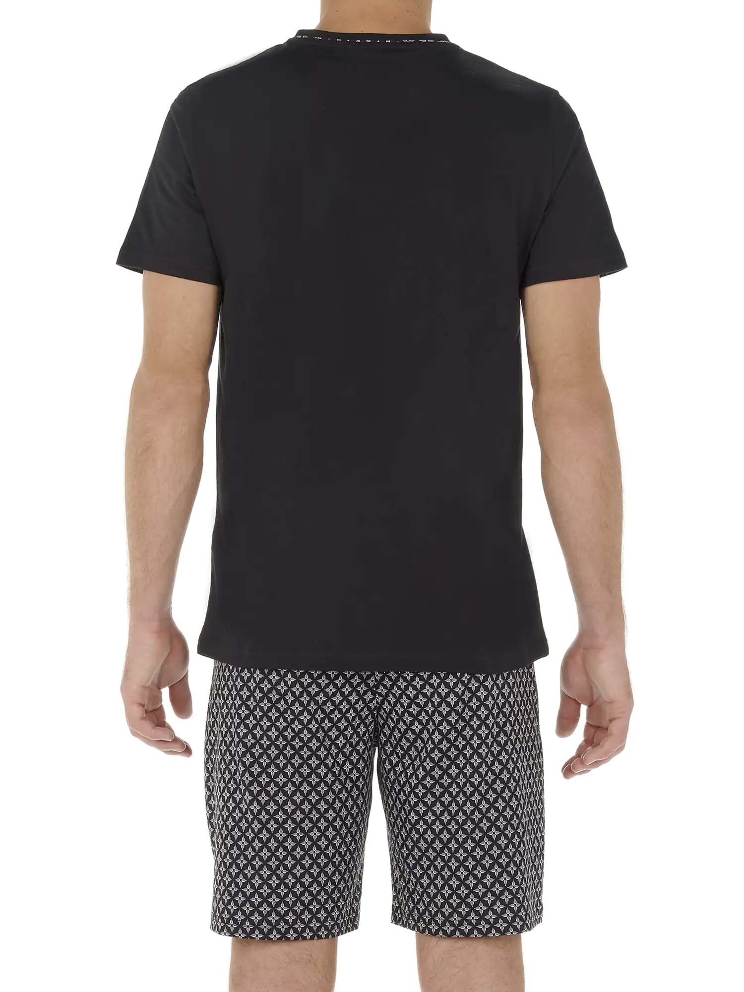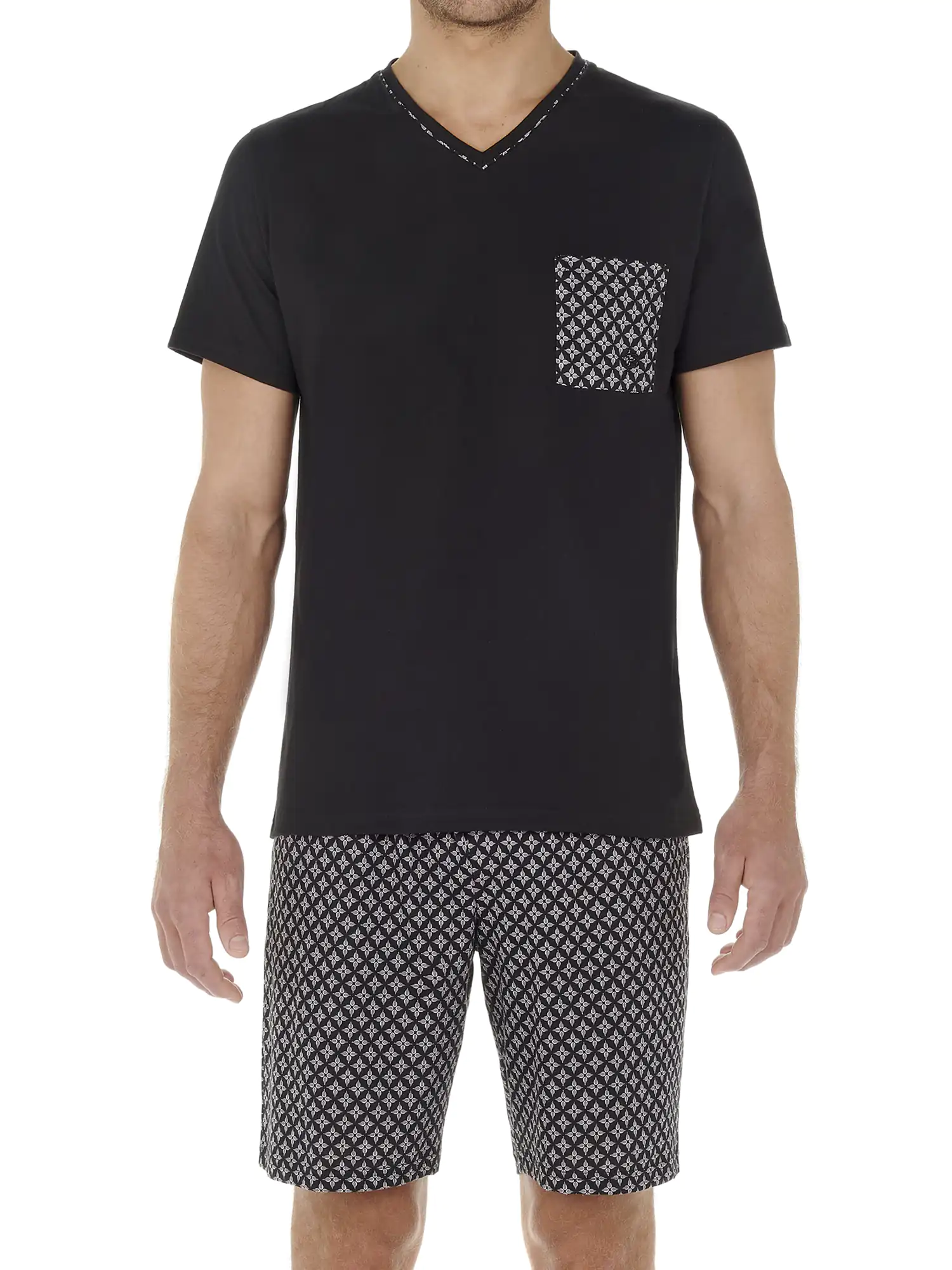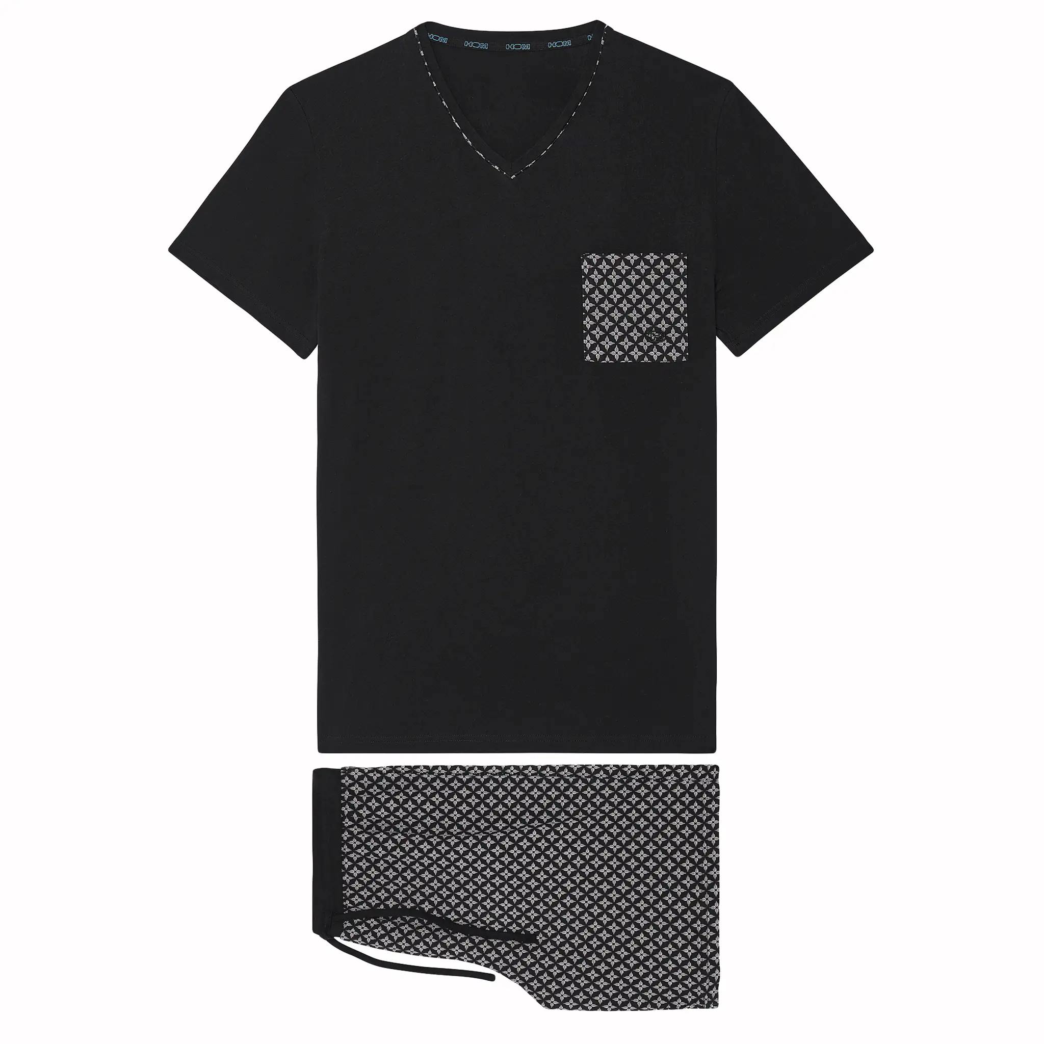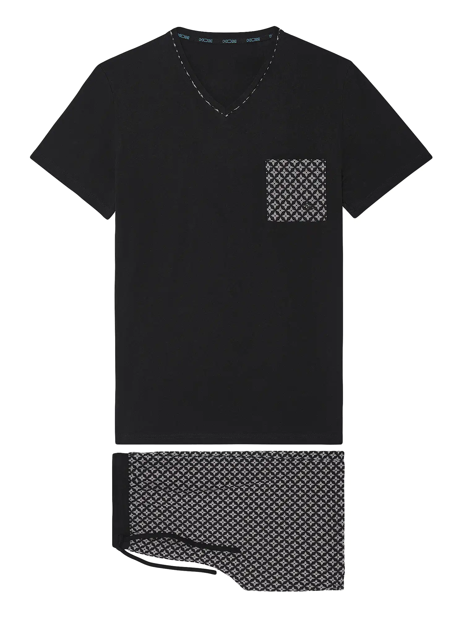 The Vince shortama is made of 100% jersey cotton. The short-sleeve T-shirt features a V-neck and is solid black with a small pocket on the chest. The shorts have a checkered pattern and side seam pockets on the left and right sides. The waistband is elastic and has a drawstring. Because the pajamas are made of cotton, they are easy to clean and breathable. Perfect for the man who likes to wear natural fabrics.