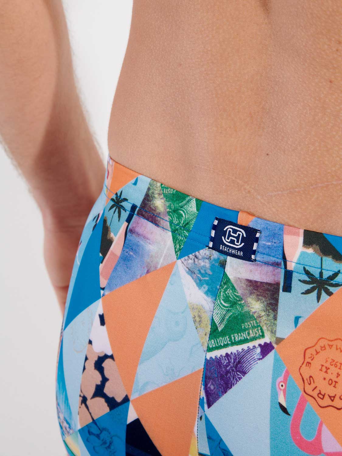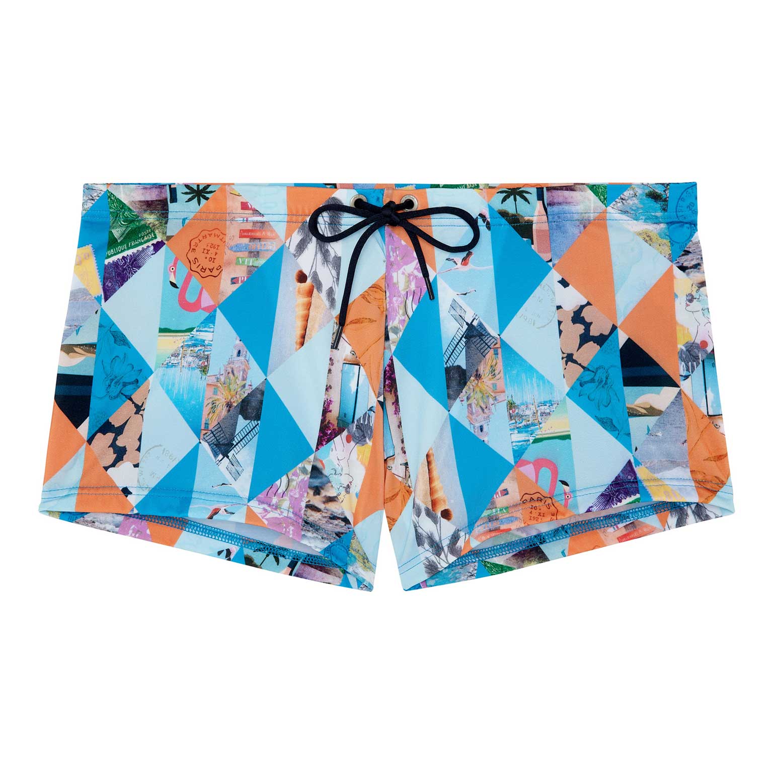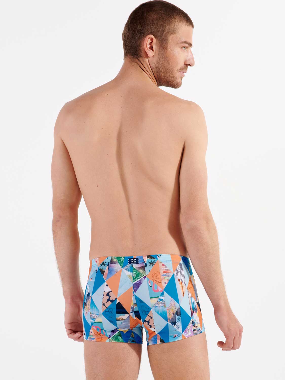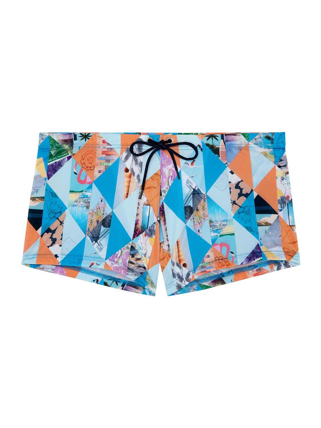 The Port Cros - Swim Short exudes a vacation feeling with its geometric colorful print featuring photos of beautiful seaside destinations with long beaches. The fabric is elastic, fits nicely to the skin, and is not see-through. With the drawstring in the waistband, you can adjust the swim boxer perfectly to size. A beautiful fashion item for the beach or the pool.
