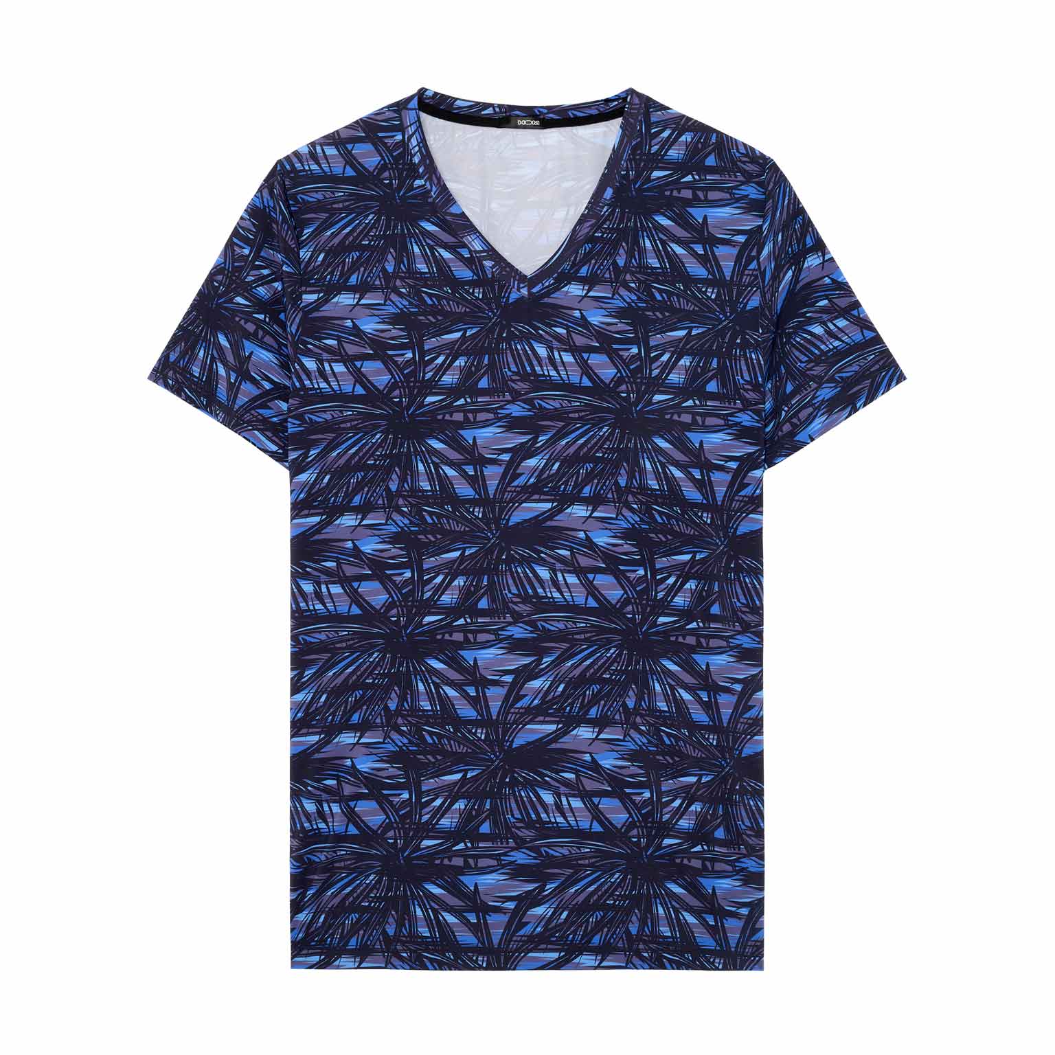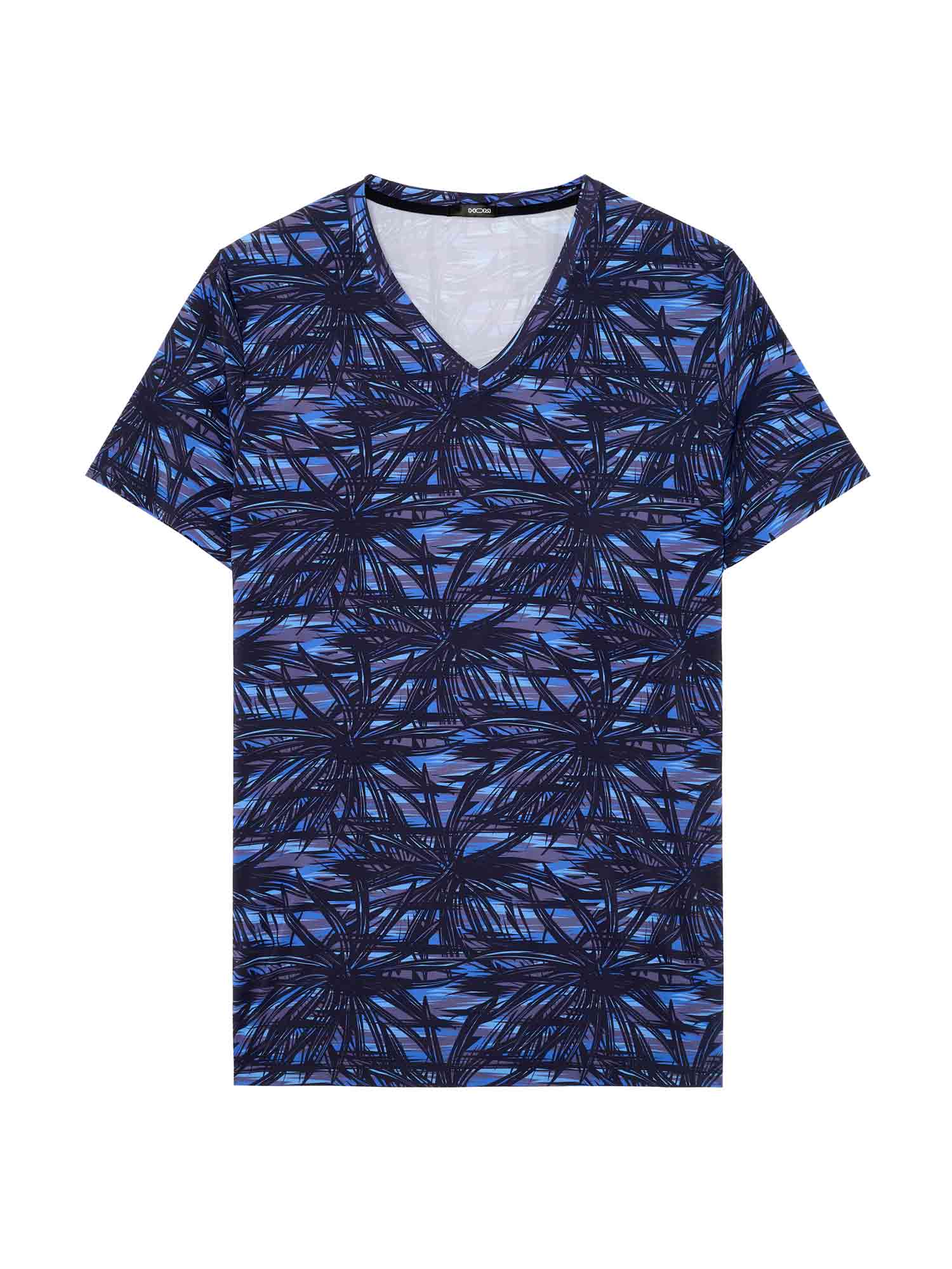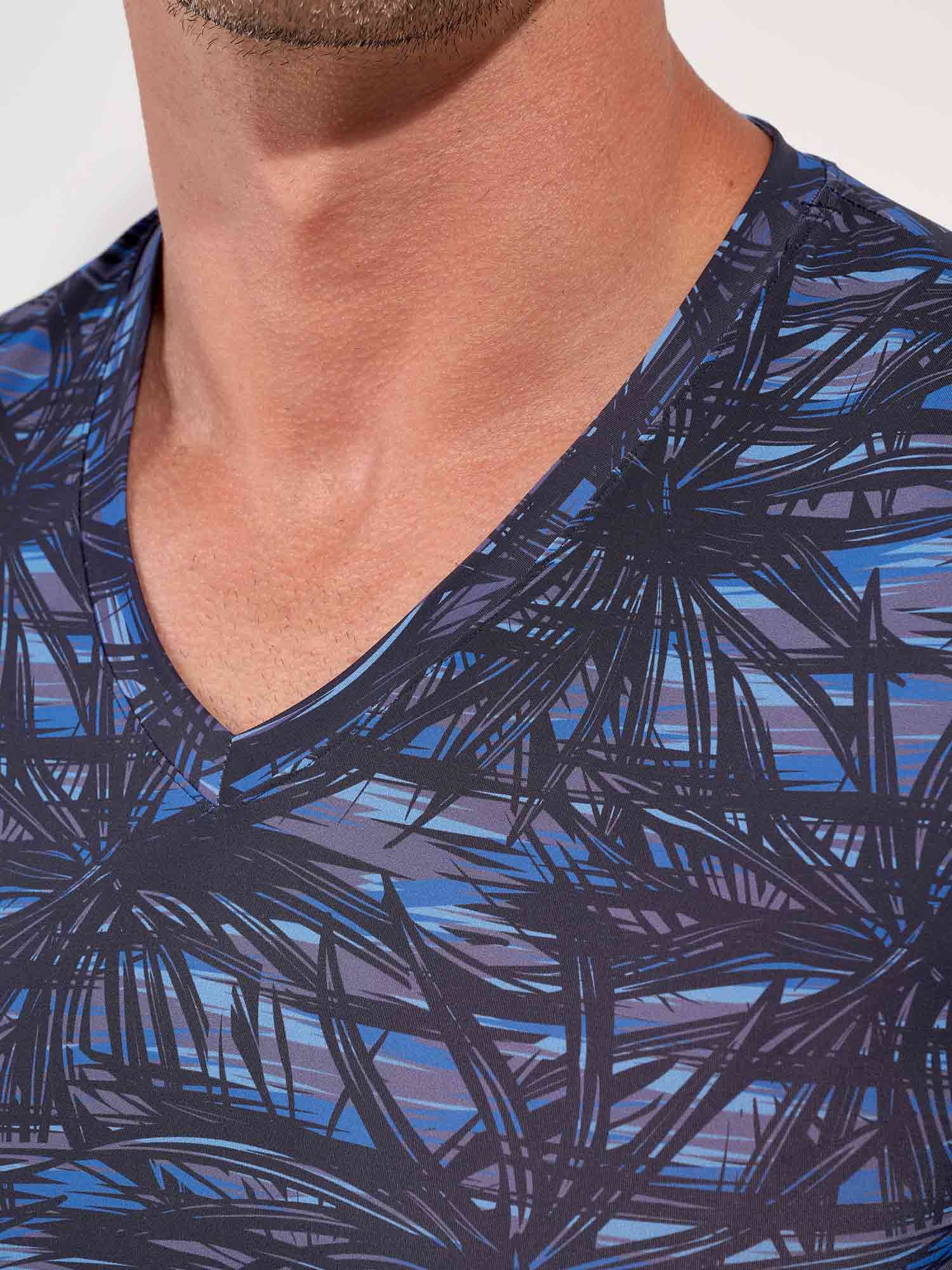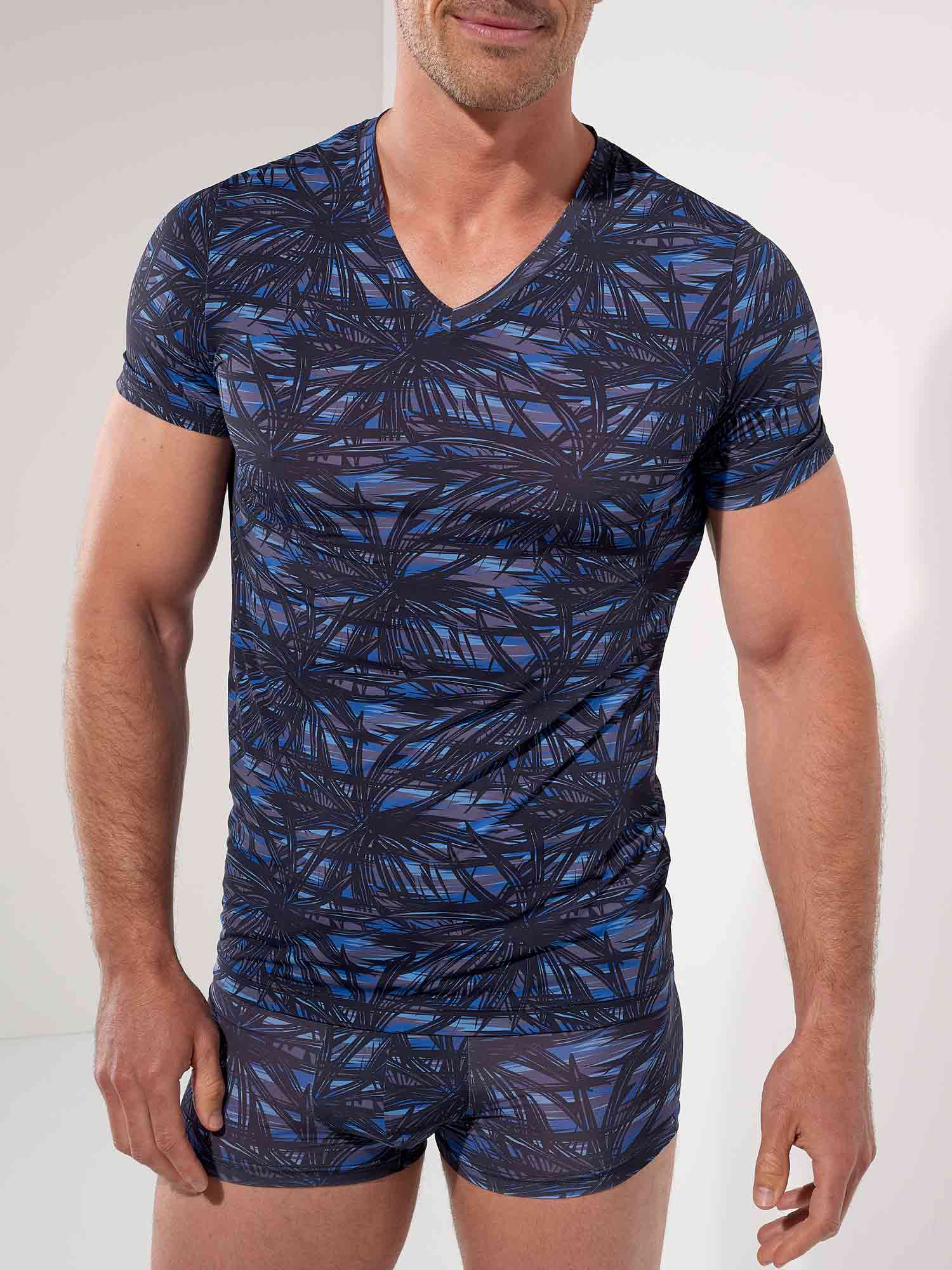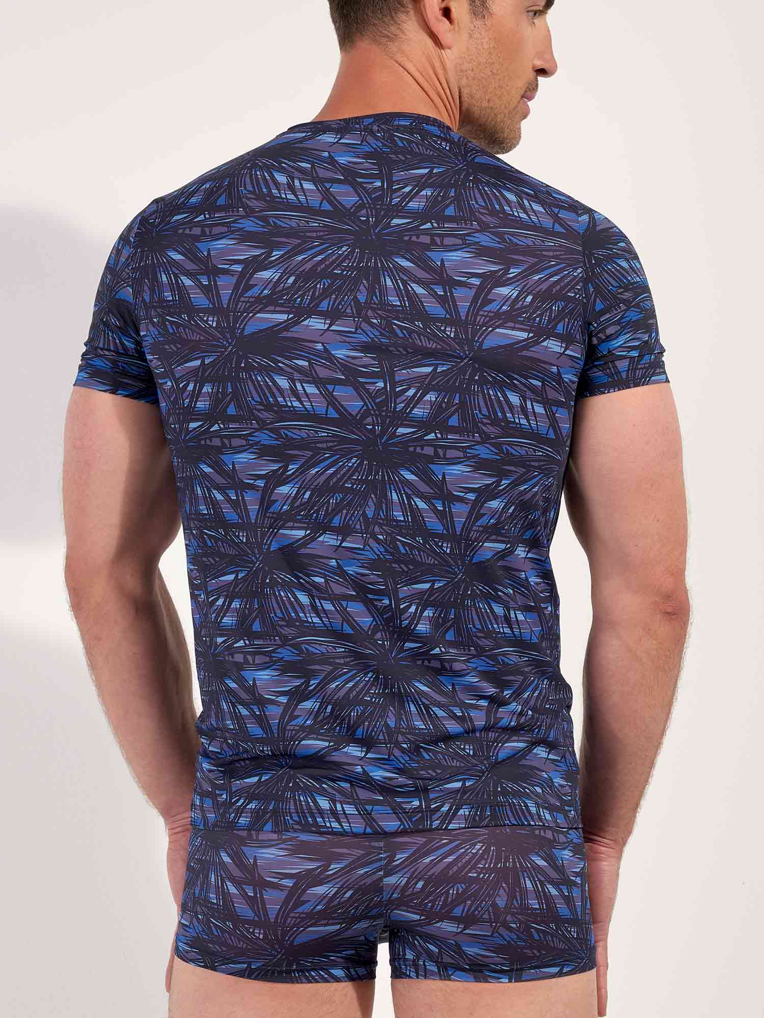 The HOM Star Island V-neck T-shirt is the refined counterpart to the matching trunk, designed for men who appreciate coordinated luxury. The graphic palm motifs, inspired by Las Vegas nightlife, stand out in deep black against layered shades of blue for a bold yet impeccably classy look. Crafted in a smooth, stretch fabric, it drapes close to the body without feeling restrictive, delivering a sleek silhouette that moves with you. Wear it as a statement on its own or complete the set with the Star Island trunk for a perfectly aligned Temptation look.