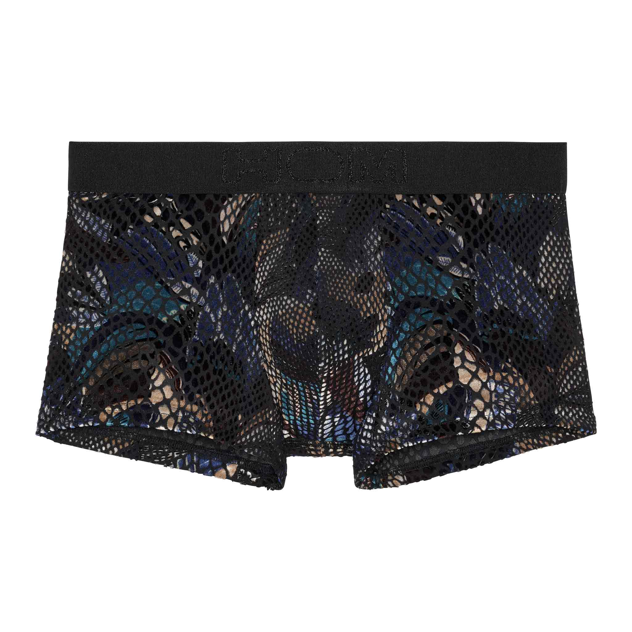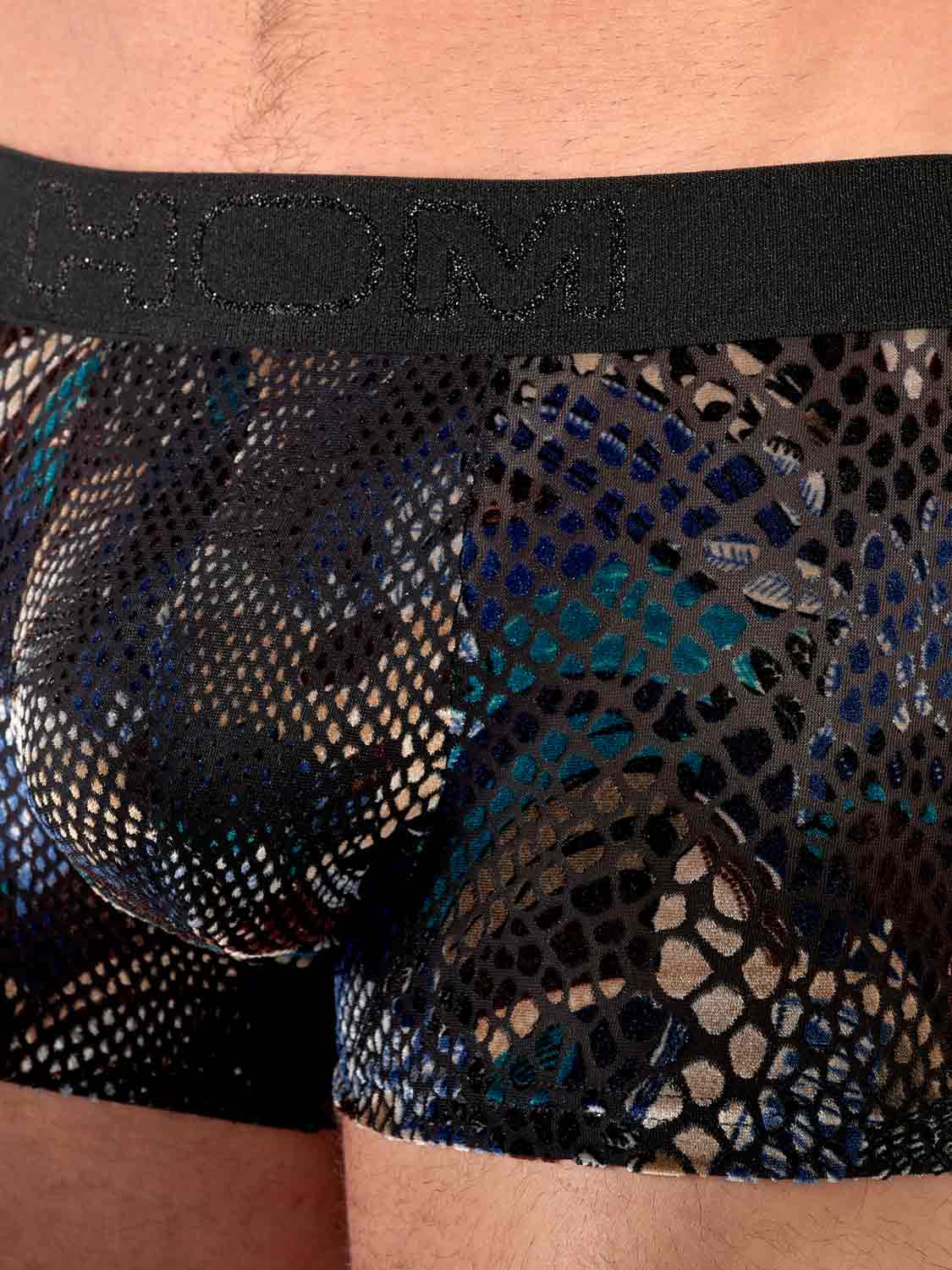 The HOM Cobra trunk is a bold and seductive piece, made from devoré mesh with a striking animal-skin design. The velvet-like flock print creates a rich texture that feels as luxurious as it looks, enhancing the sensuality of the deep blue, bronze and black tones. Lined at the front, it ensures comfort without compromising its daring transparency. A true eye-catcher for the confident man.