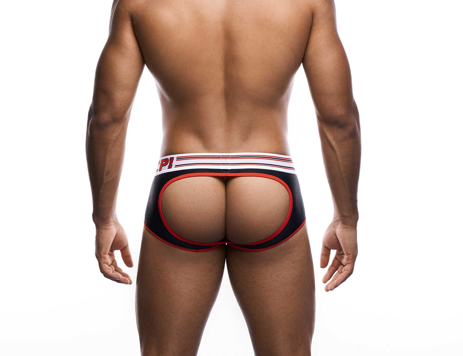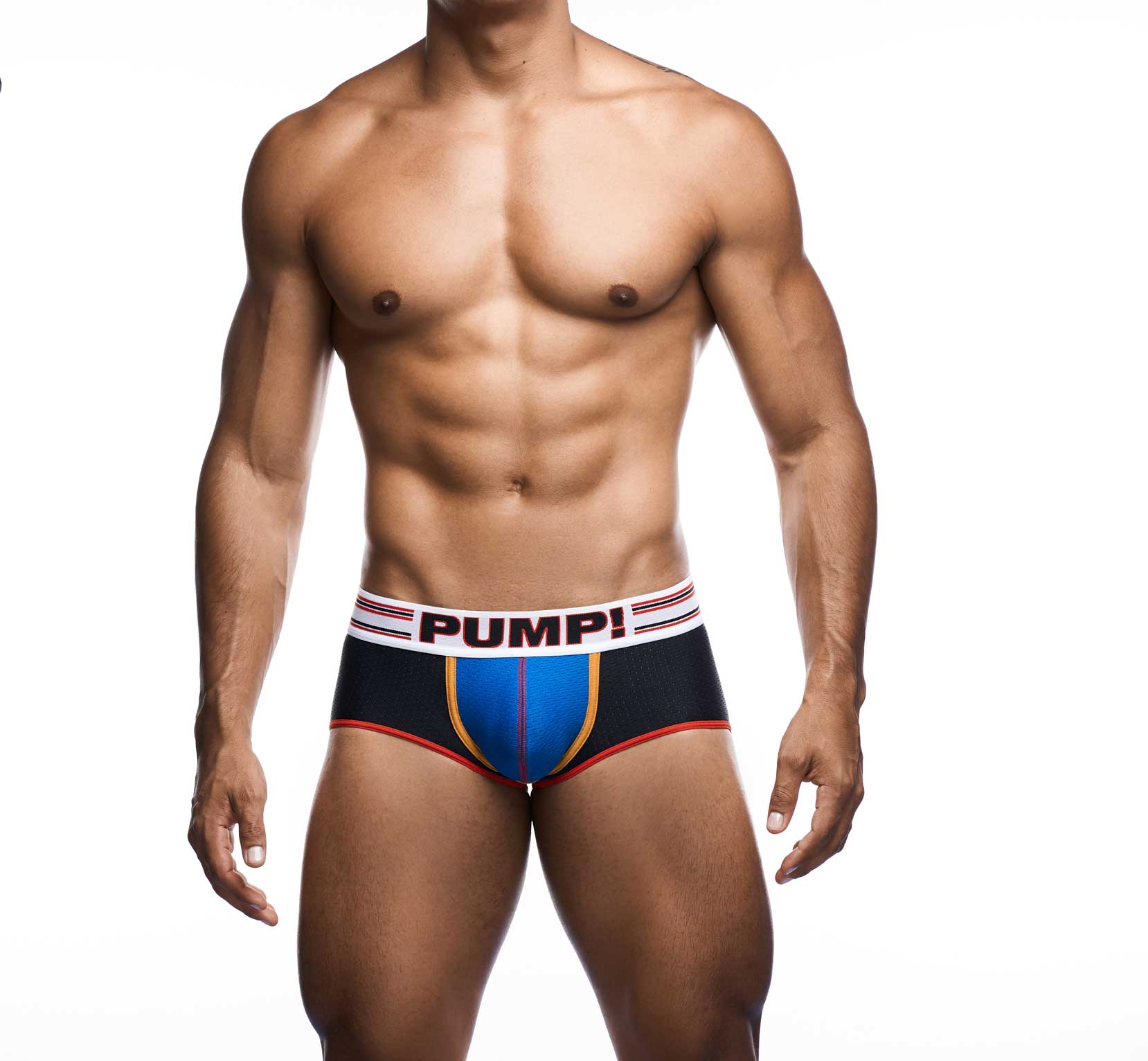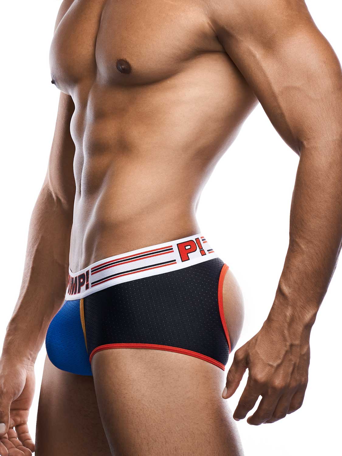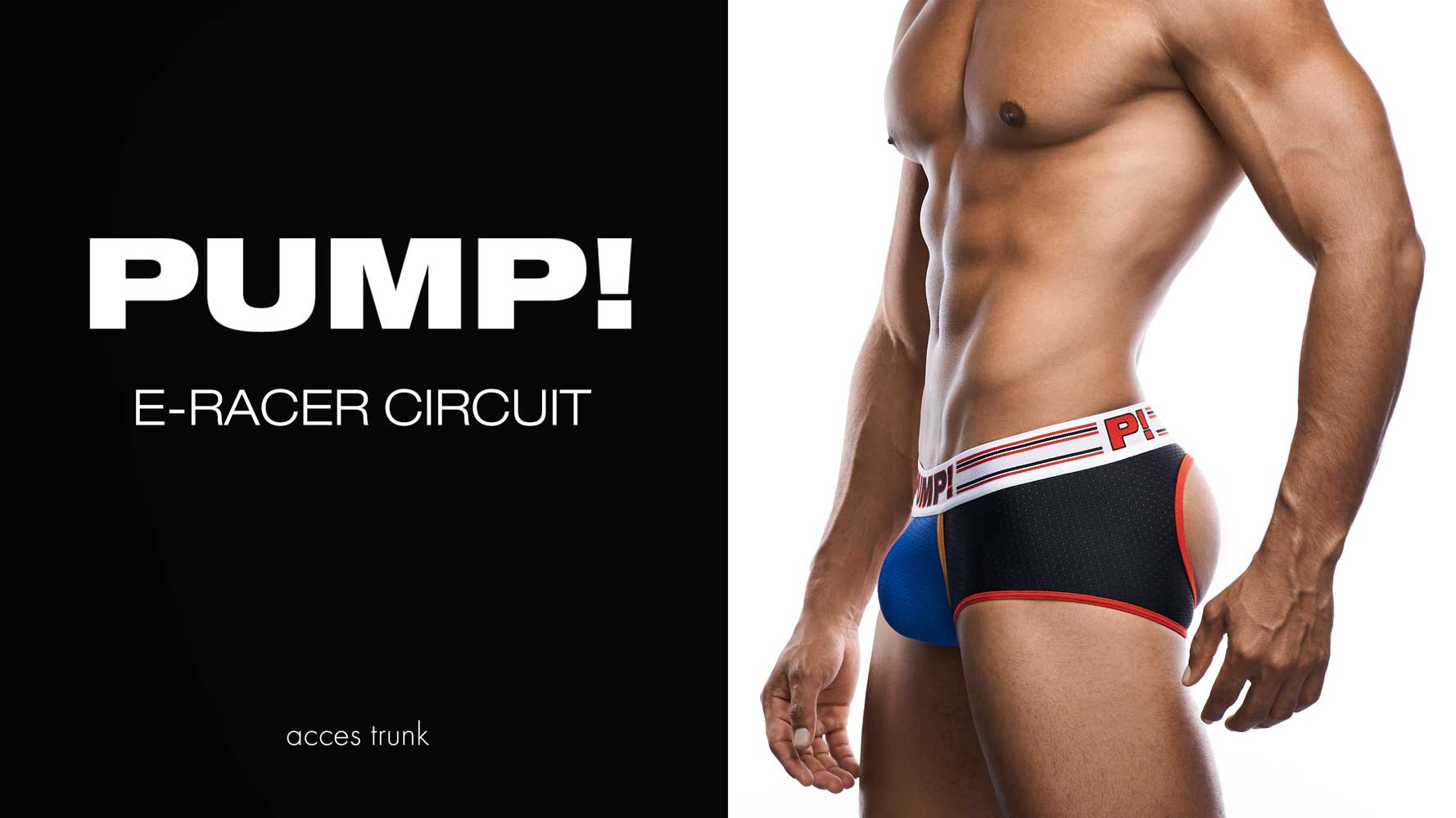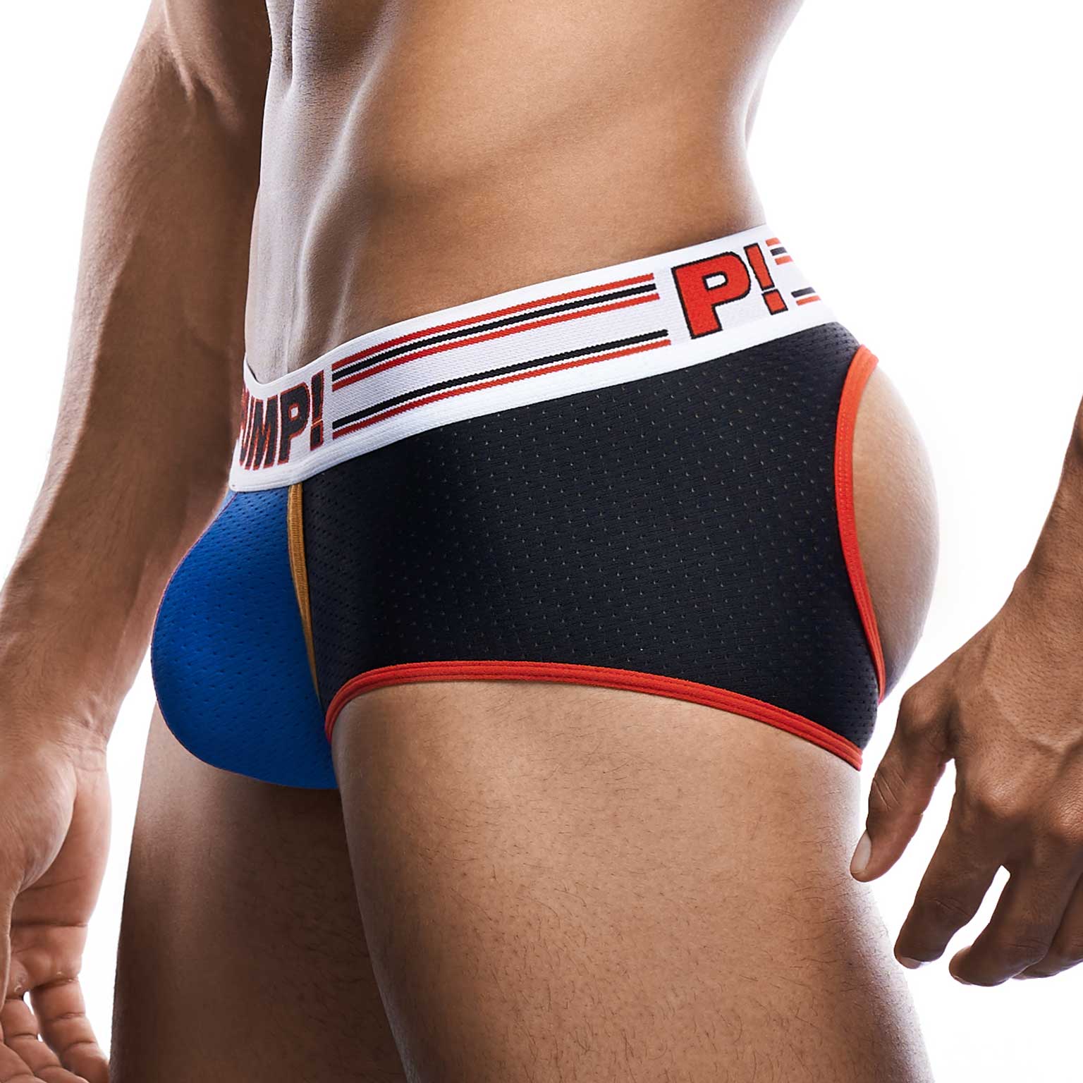 The Circuit - Access Trunk with a black mesh body and a blue mesh cup for a sporty look. The Access trunk is finished with red and orange piping and stitching, giving you a exhilarated feeling as if you were on the circuit. The bold waistband with racing stripes throws you into overdrive. As if that's not enough to make people stop and take notice! The back is open, and the buttock is supported with elastic, a trunk with the fun of a jockstrap.