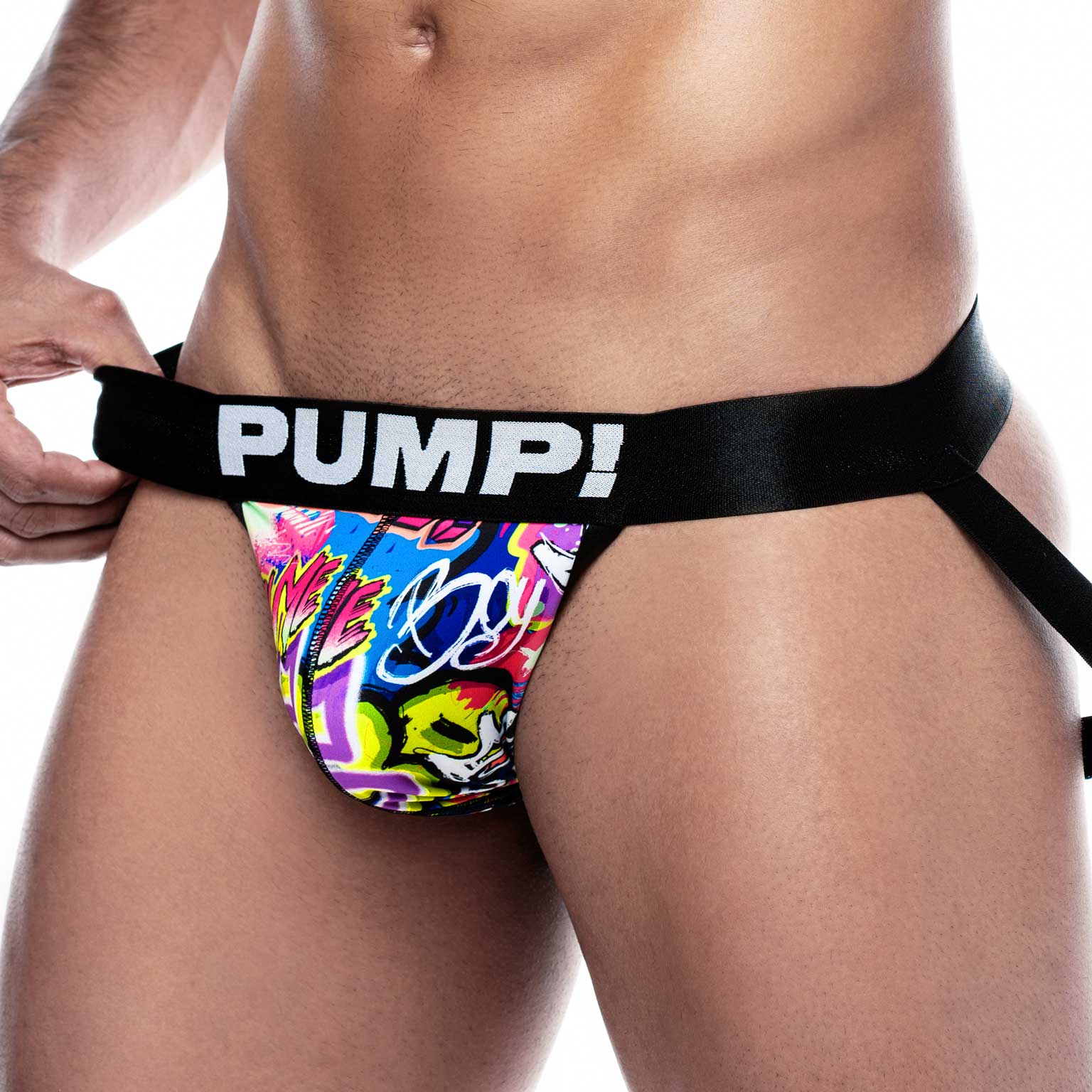 The PUMP! Drip - Jock is a strikingly colorful jock with a bold graffiti print. The jock is made from a flexible moisture-wicking polyester microfiber fabric, ensuring you feel dry and comfortable when wearing the jockstrap. The black waistband, accented with the classic white PUMP! logo, and the soft straps provide a reinforced fit and support. The placement of the print is different on each piece, making every Jock unique.