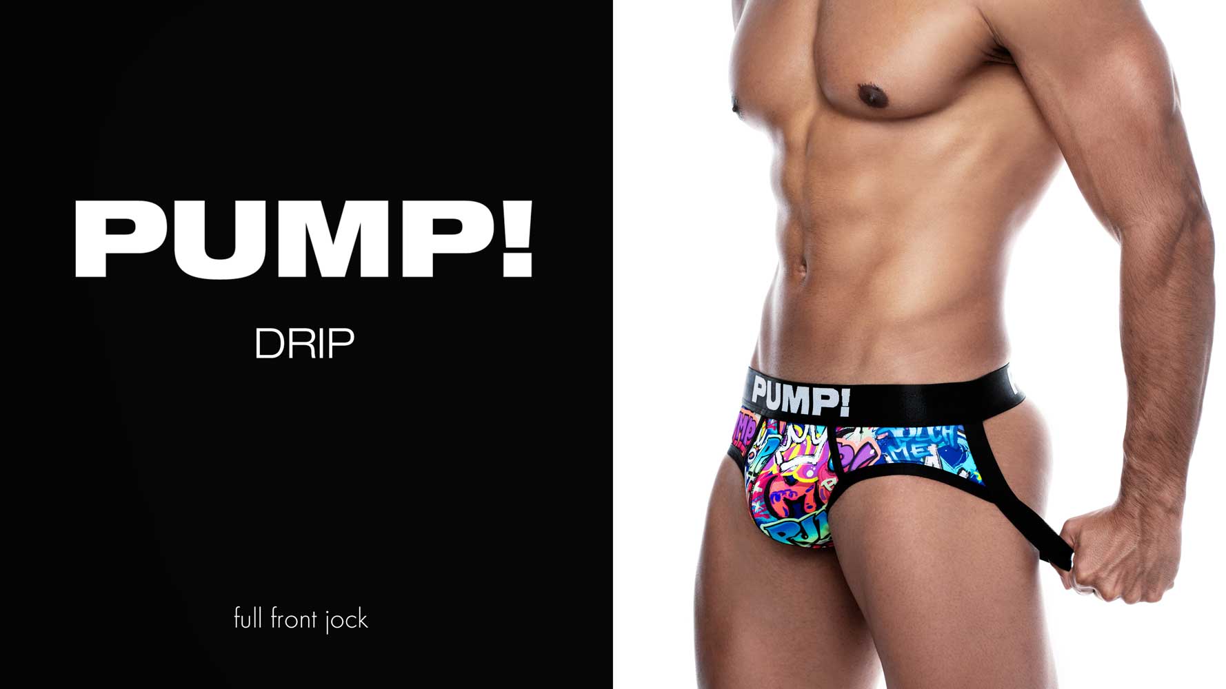 Make a statement with the PUMP! Drip - Full Front Jock. Featuring a wide front panel dripping with bold graffiti-inspired colors. With this jock, you are sure to draw attention in the locker room or bedroom. The placement of the print is different on each piece, making every Jock unique. The fabric is made from a flexible moisture-wicking polyester microfiber, ensuring you stay dry and comfortable when wearing the jockstrap. The black waistband, accented with the classic white PUMP! logo, and the soft straps provide a reinforced fit and support.