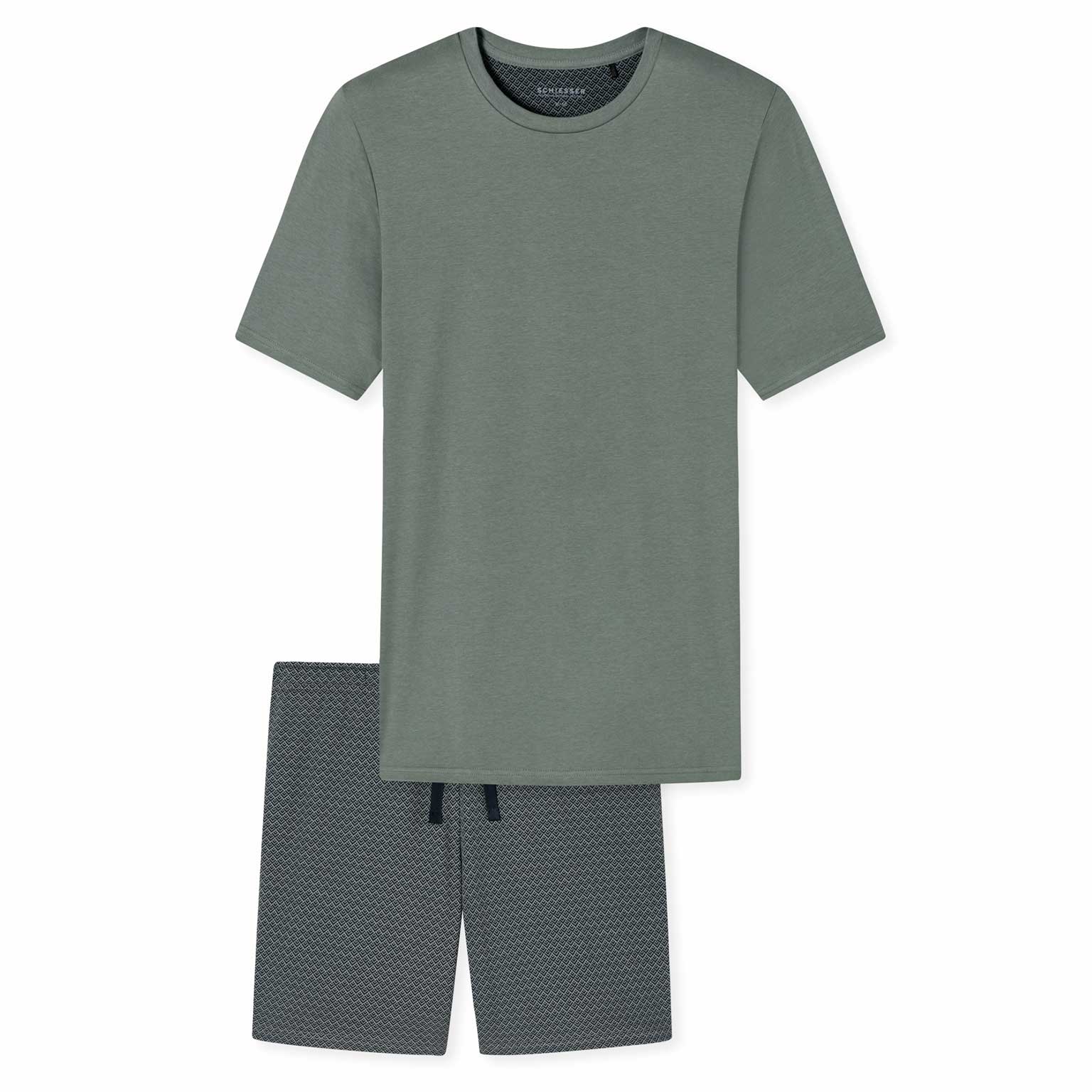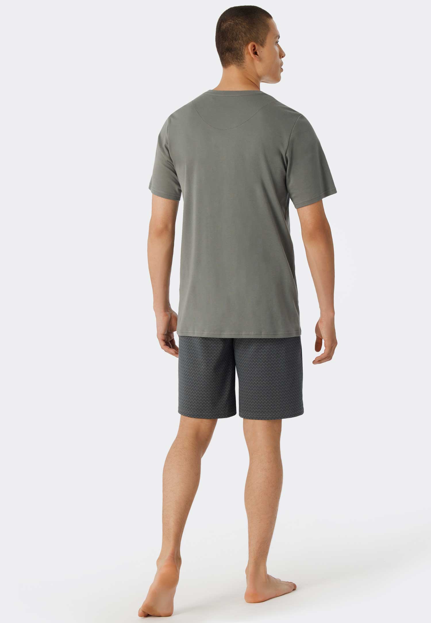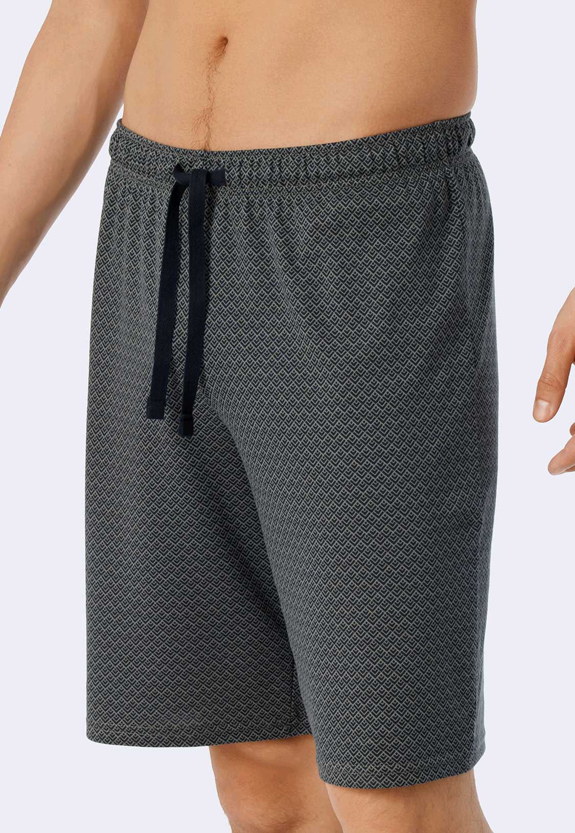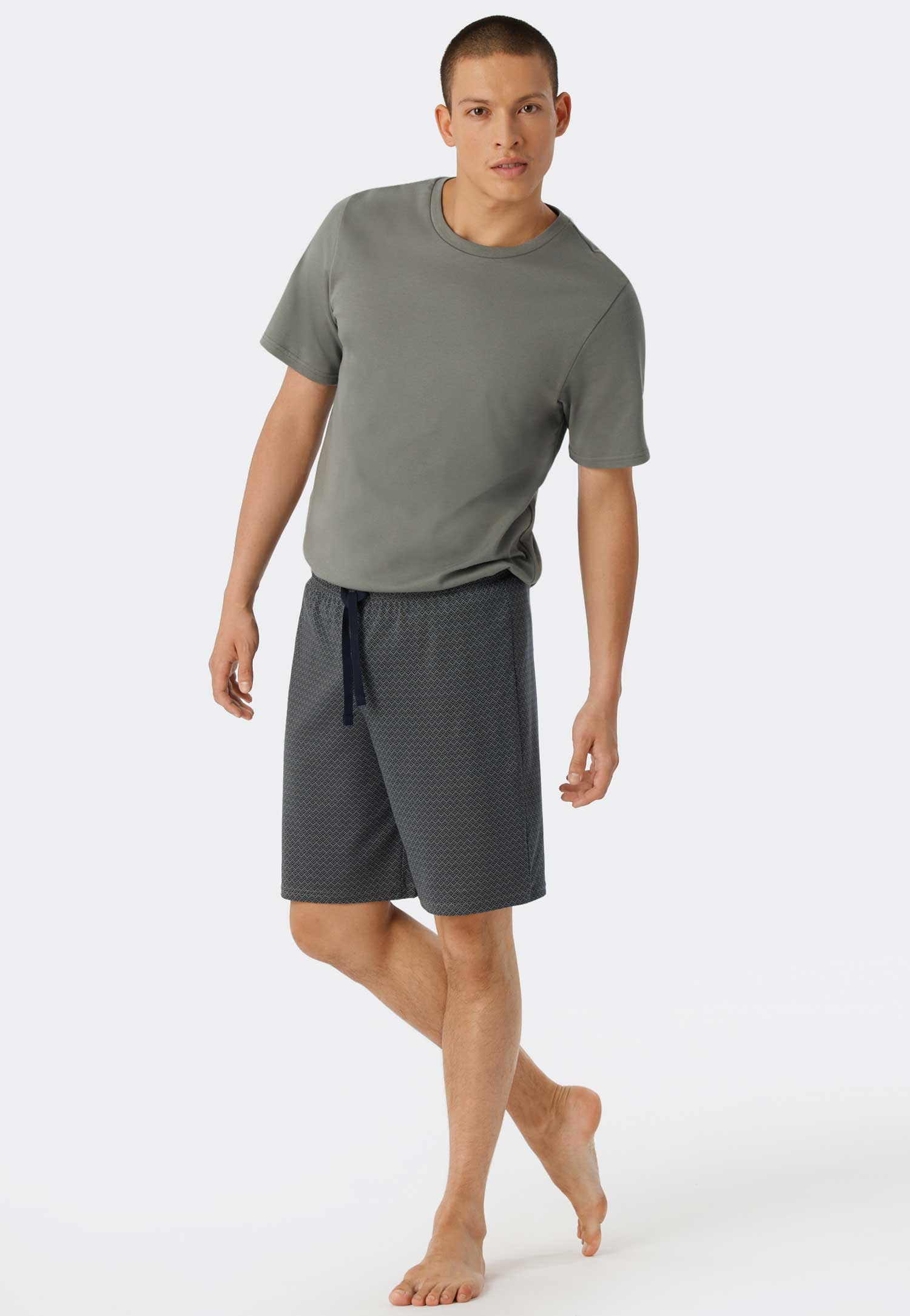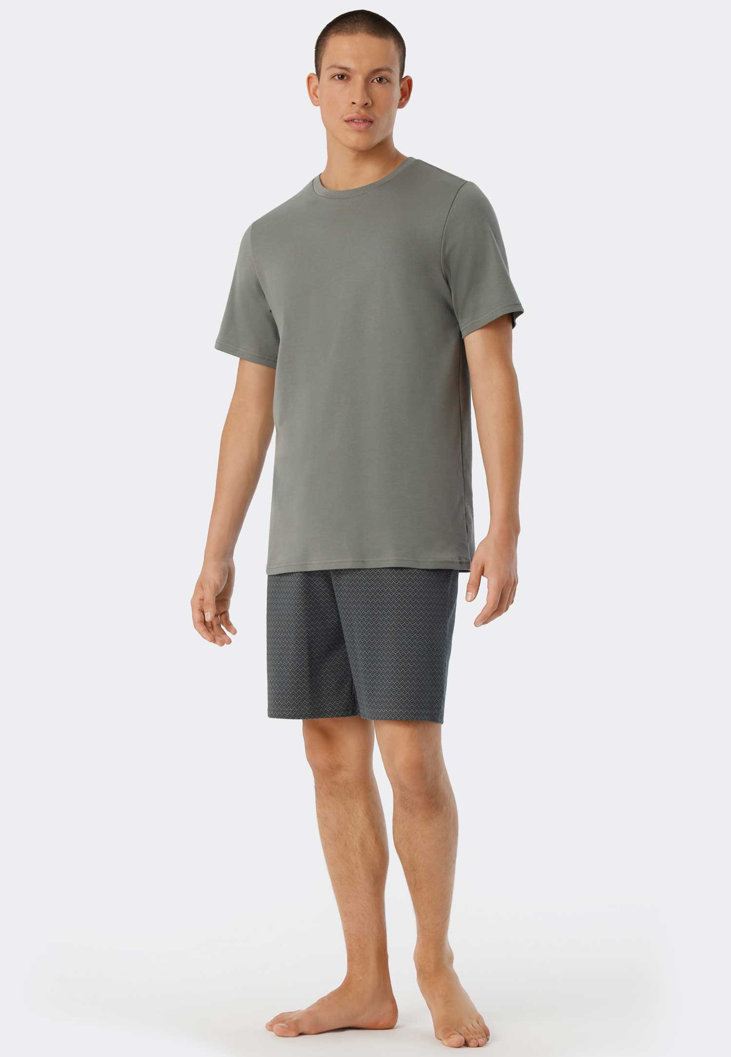 This men's short pajama set by Schiesser is made of 100% cotton, featuring a solid-colored shirt and shorts with a striking pattern. The pajama set includes a shirt with a round neck and shorts with a drawstring in the waistband for a reinforced fit. Produced with interlock quality for a casual look and feel.