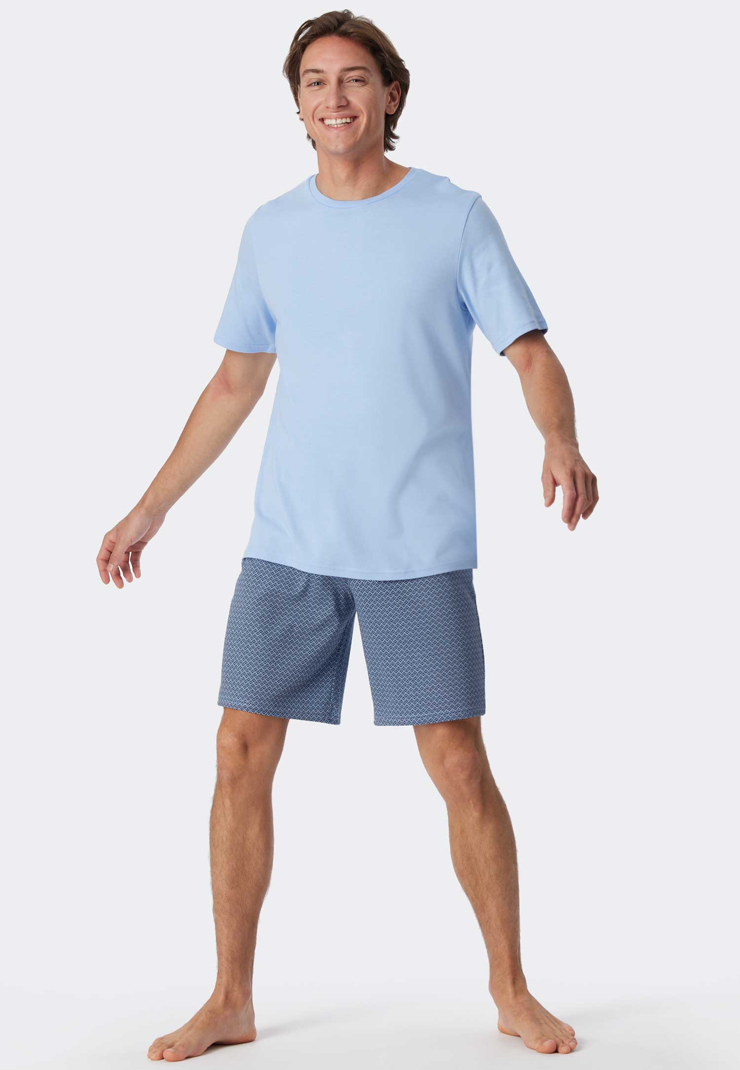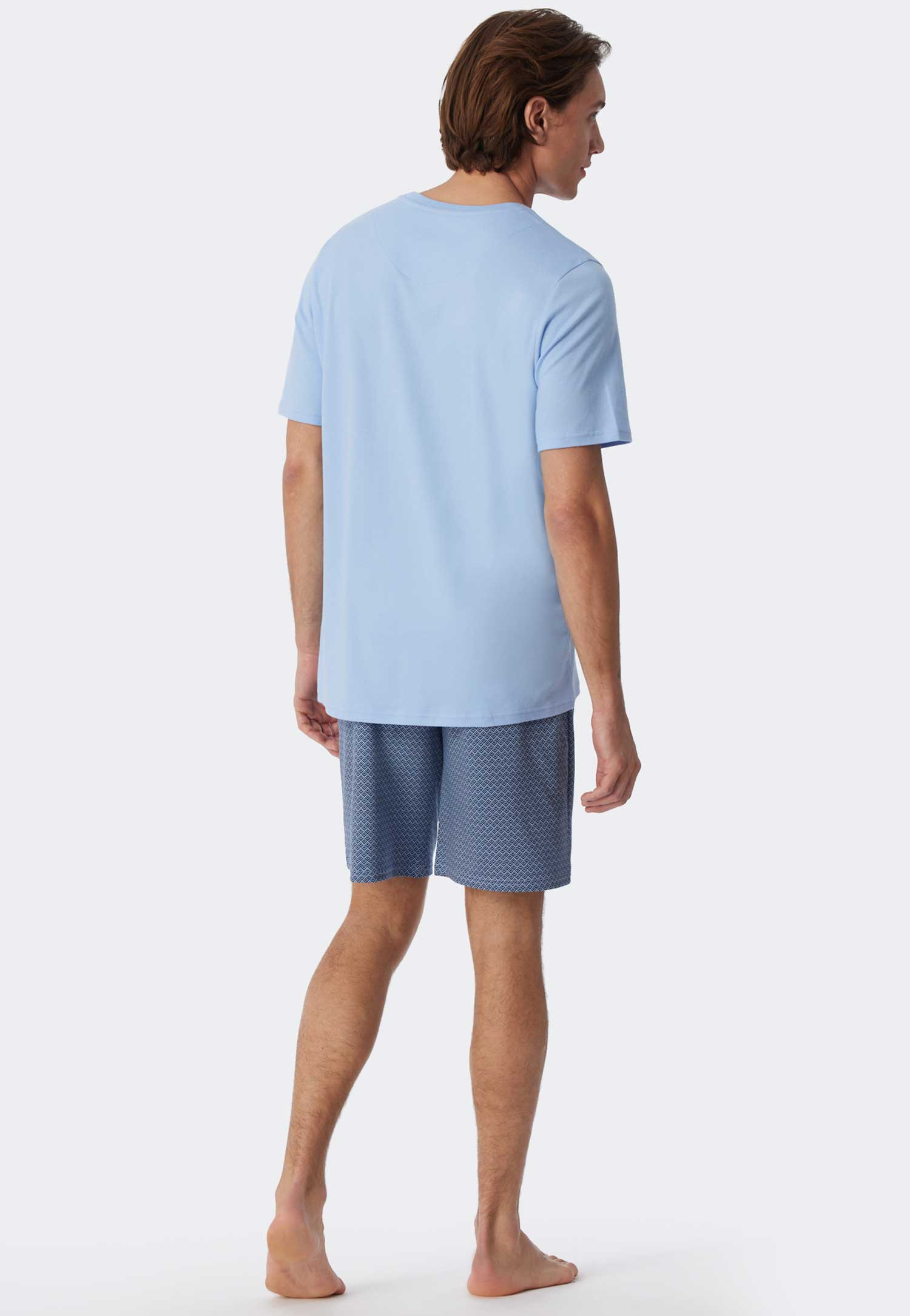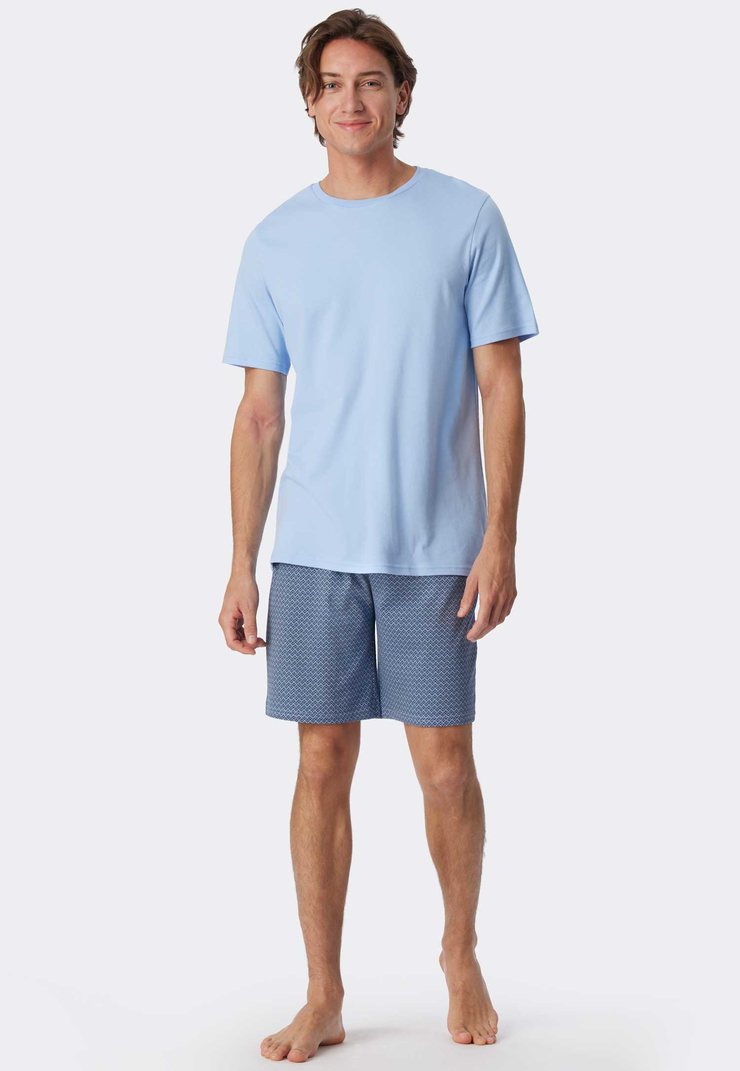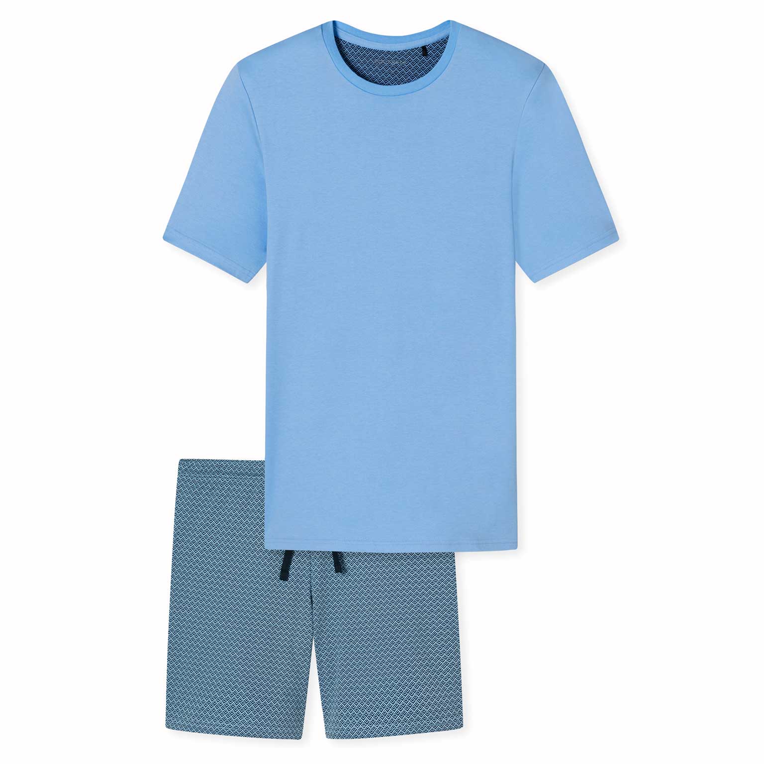 This men's short pajama set by Schiesser is made of 100% cotton, featuring a solid-colored shirt and shorts with a striking pattern. The pajama set includes a shirt with a round neck and shorts with a drawstring in the waistband for a reinforced fit. Produced with interlock quality for a casual look and feel.