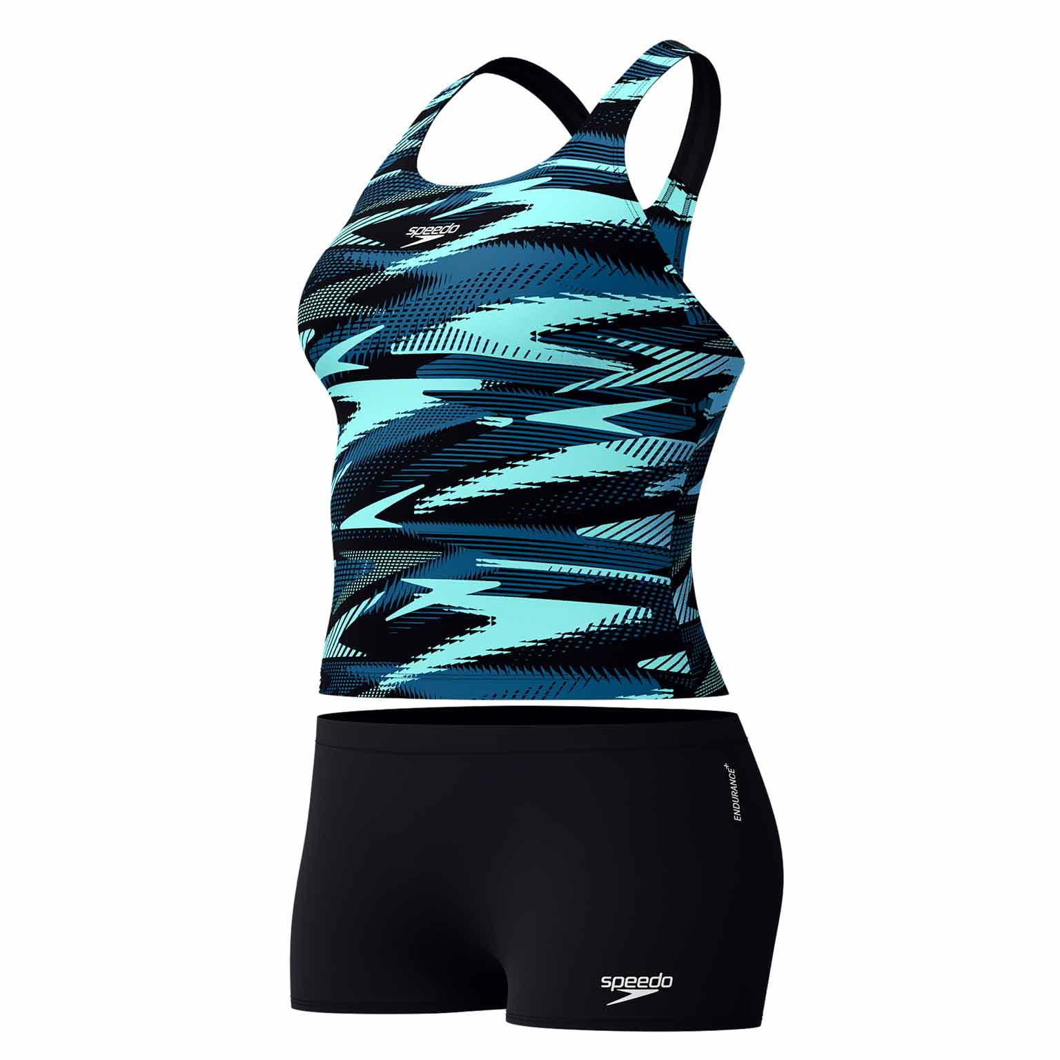 Make a statement with this beautiful tankini from Speedo. The tankini features a Speedo Hyperboom print in turquoise with blue. The tankini is ideal for sports like aqua jogging or water aerobics. The shoulders are kept free, and the top provides soft support for the bust, offering extra comfort during movements in the water. The shorts provide more coverage than a regular swim brief and have a drawstring on the inside for a secure fit. The tankini is made from Endurance+ material, making it chlorine-resistant and more durable than regular swimwear fabric.