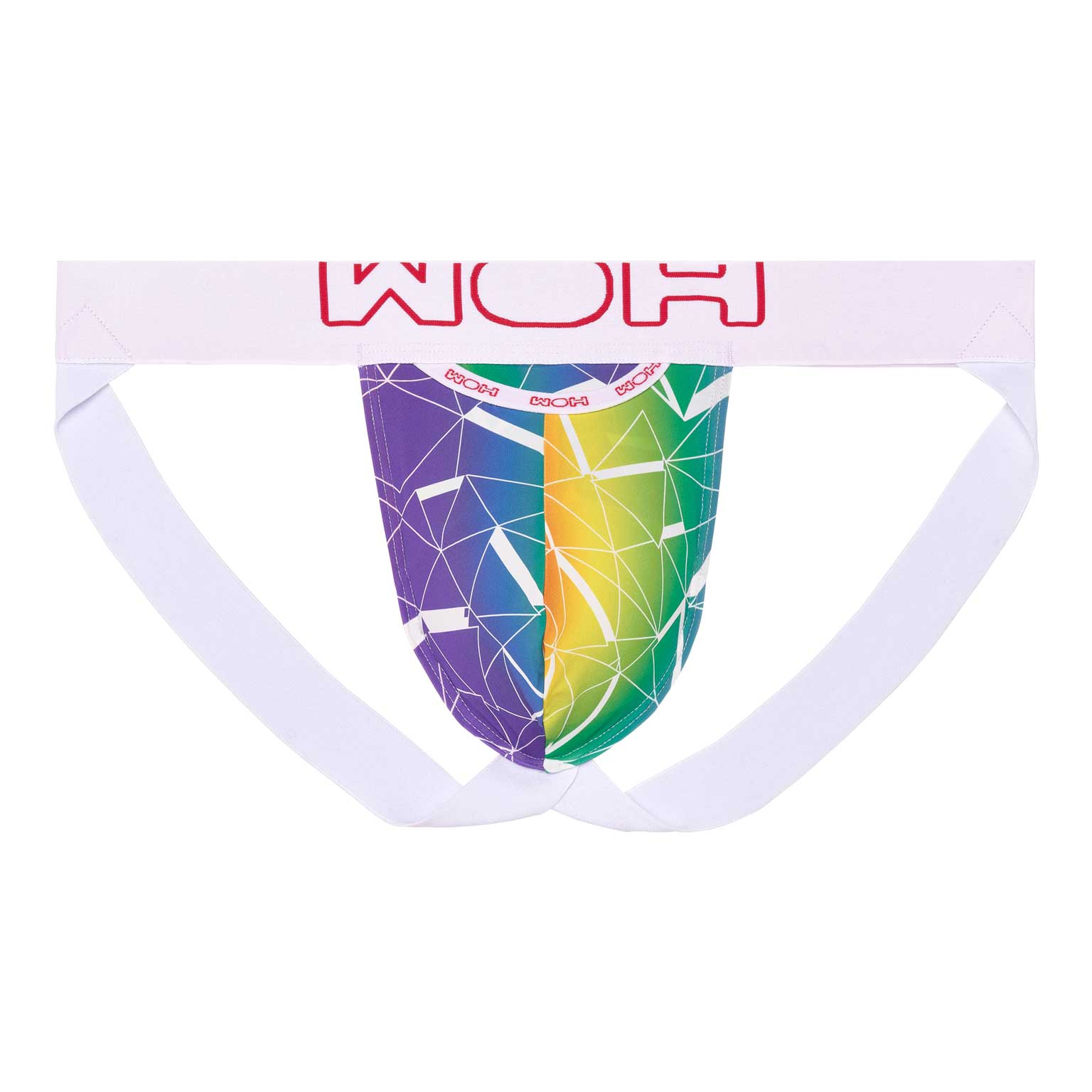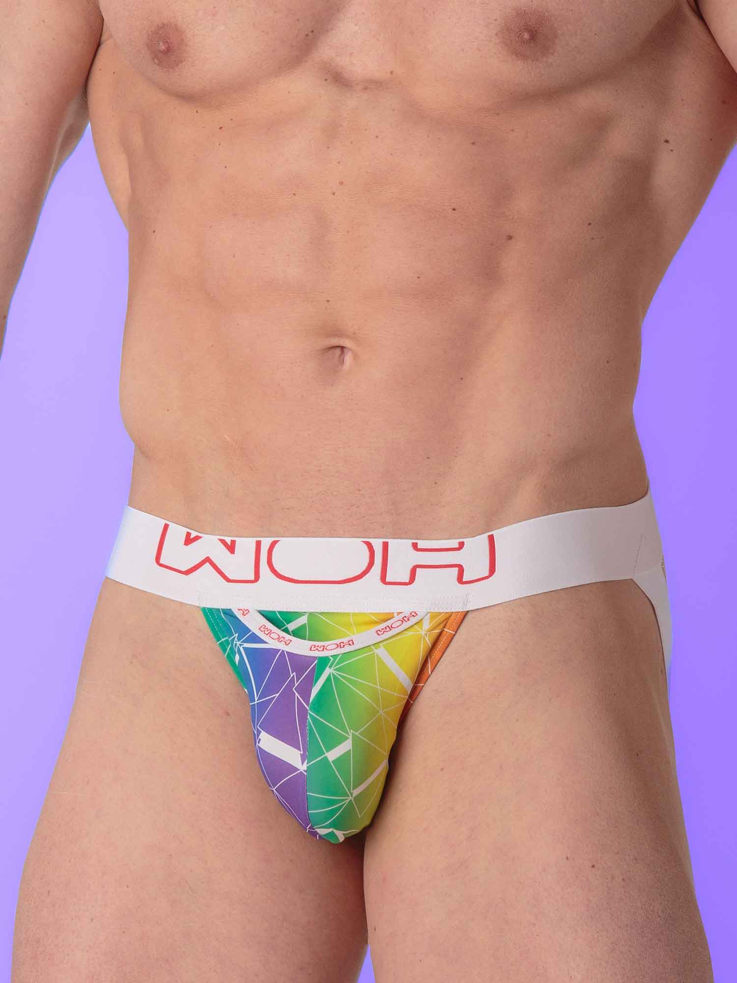 The Sexy Fun Jockstrap by WOH bursts with color, fun, and sex appeal. Made from a soft, stretchy fabric in a bold rainbow print that radiates playfulness. The wide white waistband with the WOH logo adds a sporty touch, while the open back creates a seductive, sexy look. The pouch is specially shaped to comfortably support and enhance your masculine features.